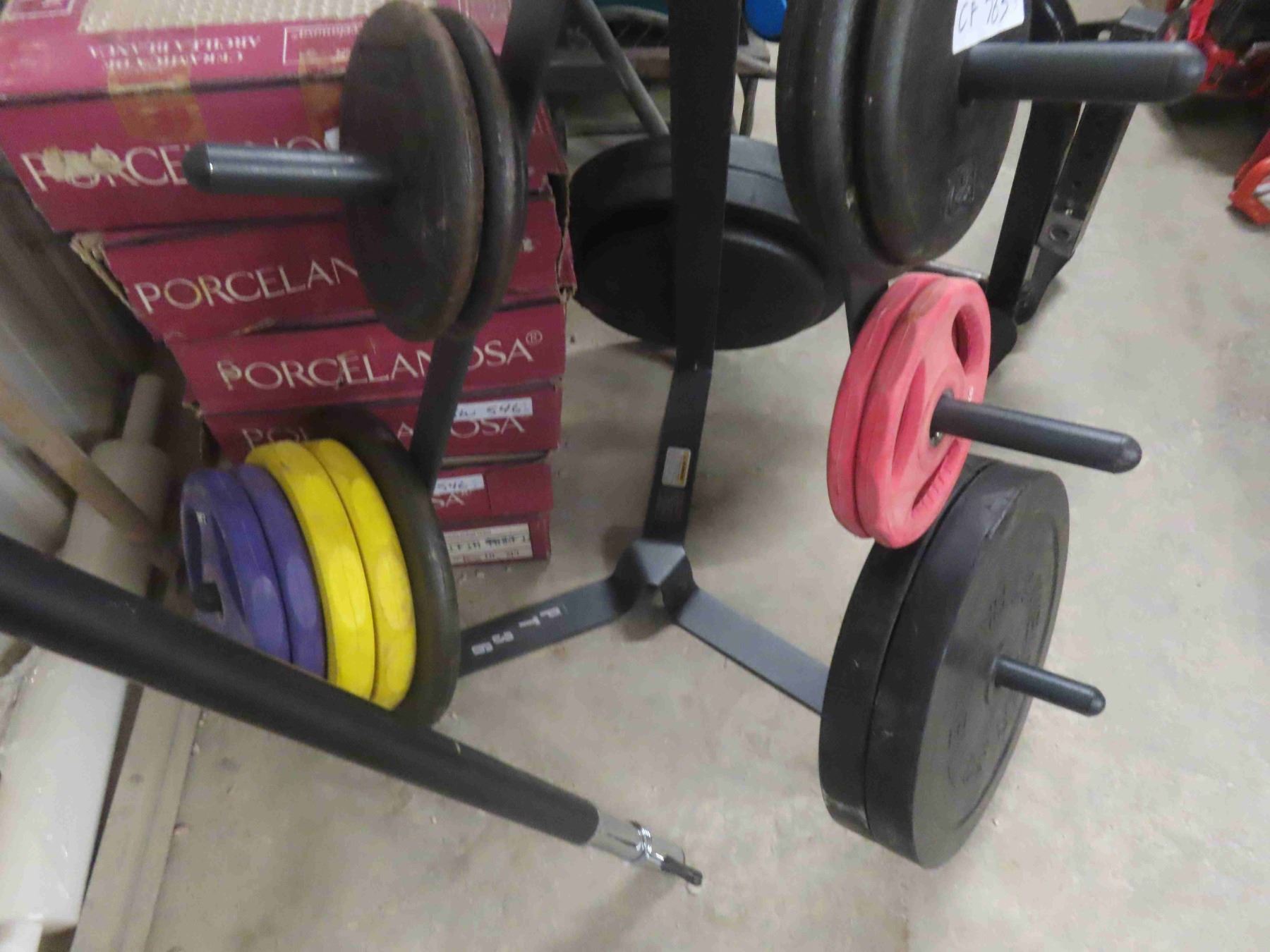 Weight Stand with Many Weights, Old Style Steel and Modern, Bar, Leg Curl