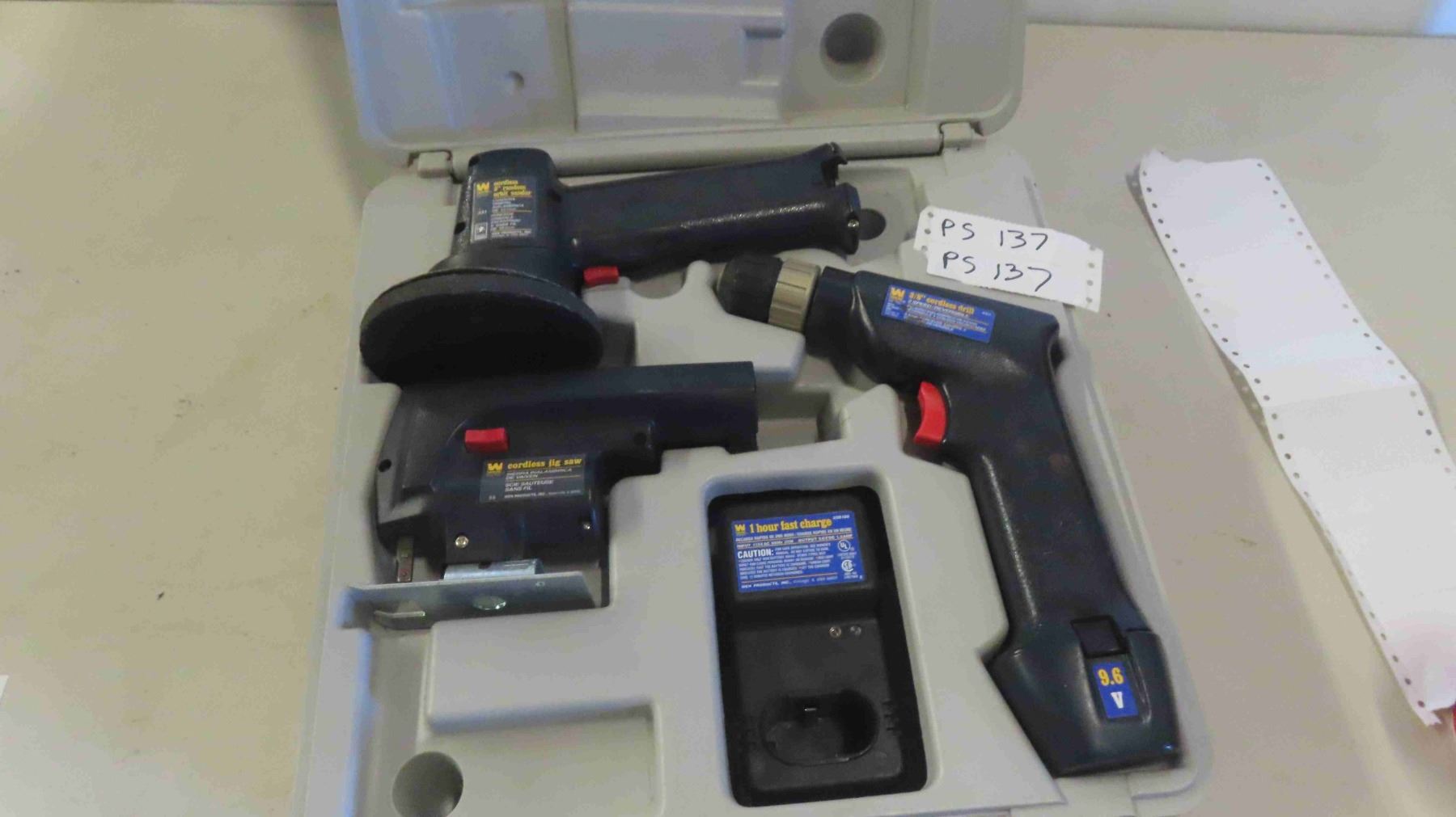 Wen 9.6 Cordless Set : 3/8'' Drill , Orbital Sander, Cordless Jig Saw, Charger, 1 Battery and Case