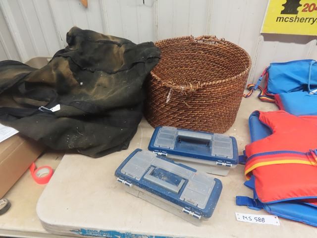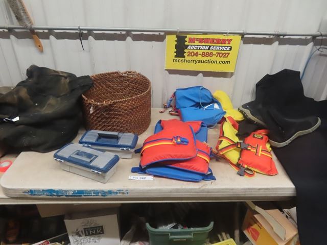 Wet Suit with Boots Sz Med, Basket , 3 Life Jackets, 2 Fishing Boxes