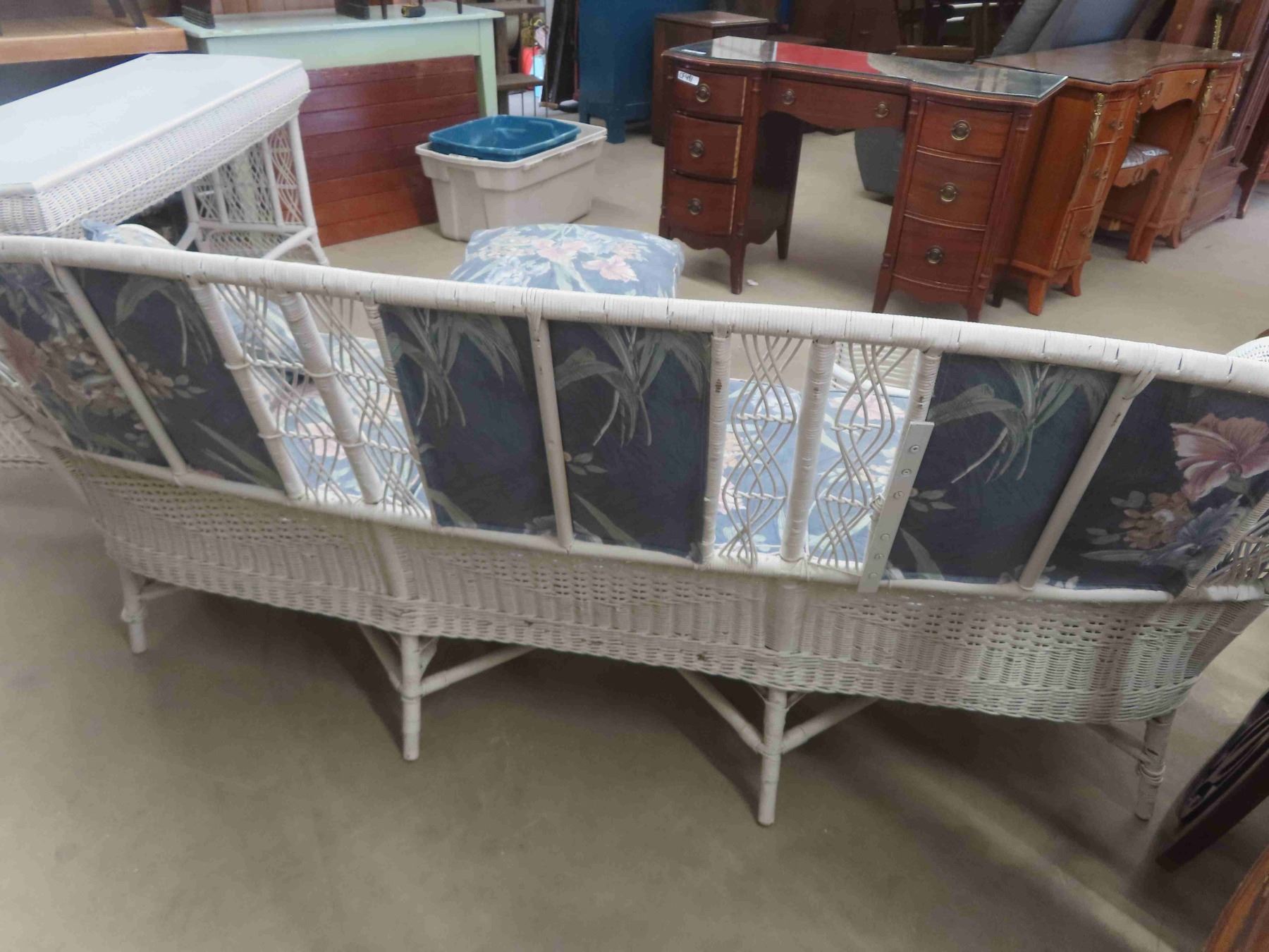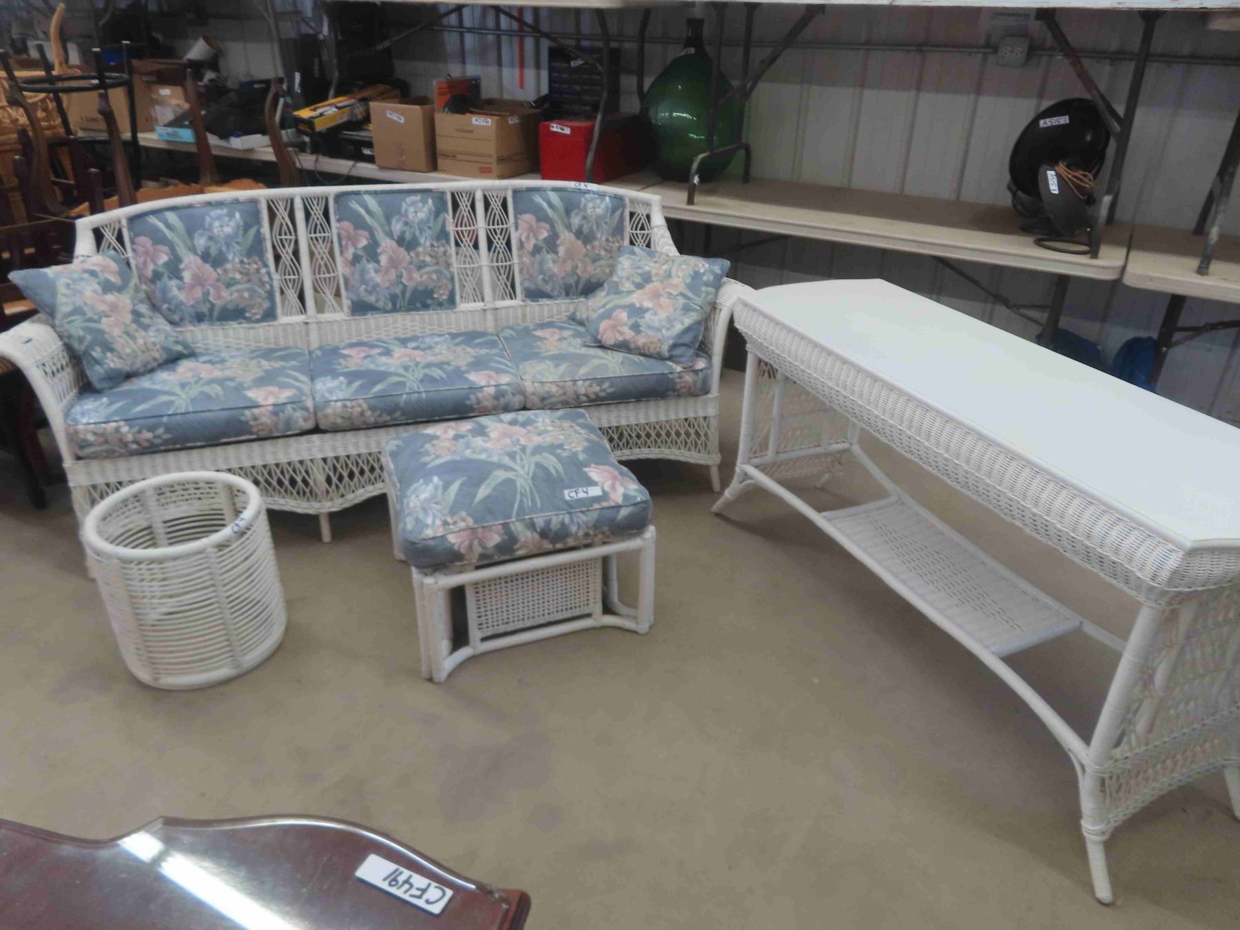 White Wicker Patio Couch 85" Wide, Table 19" x 30" x 56", Ottoman + Round