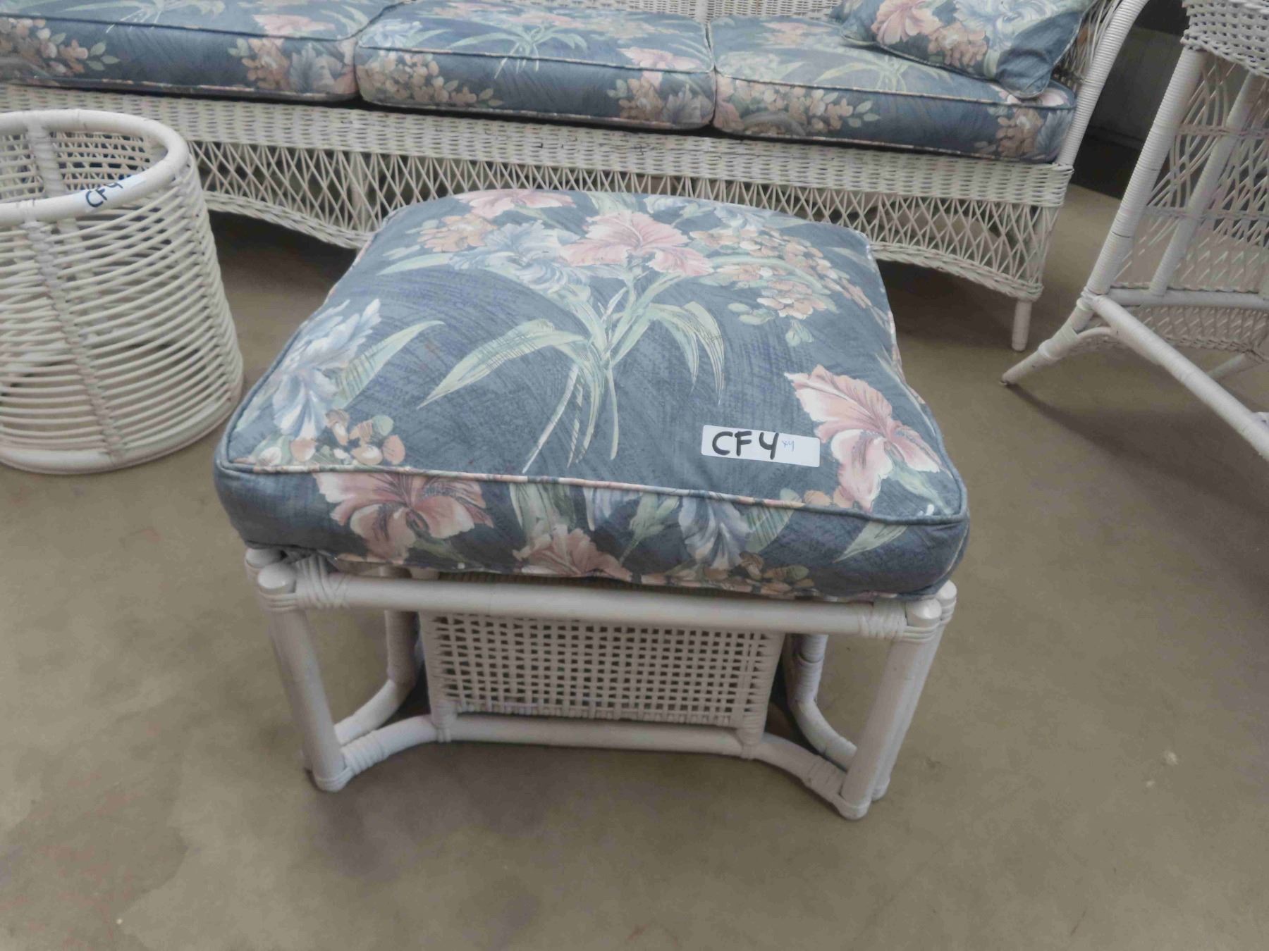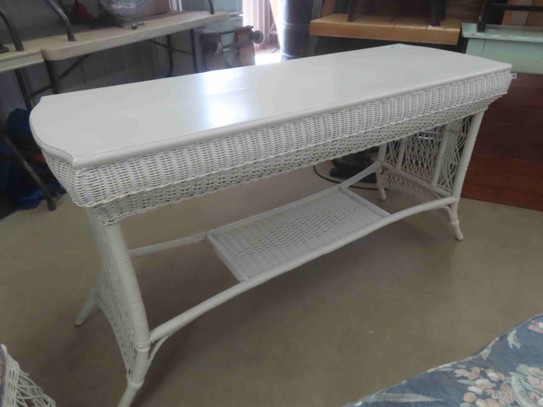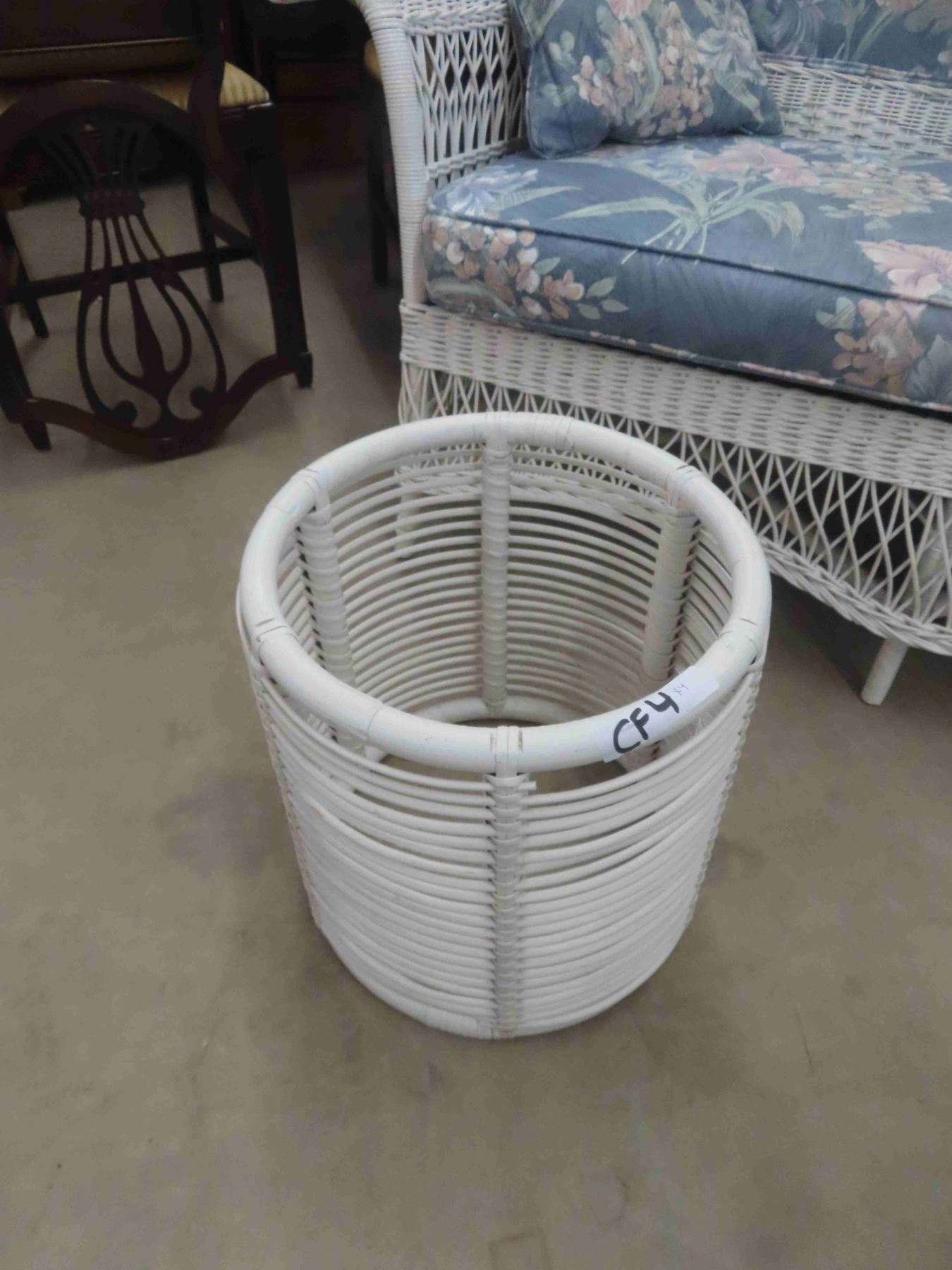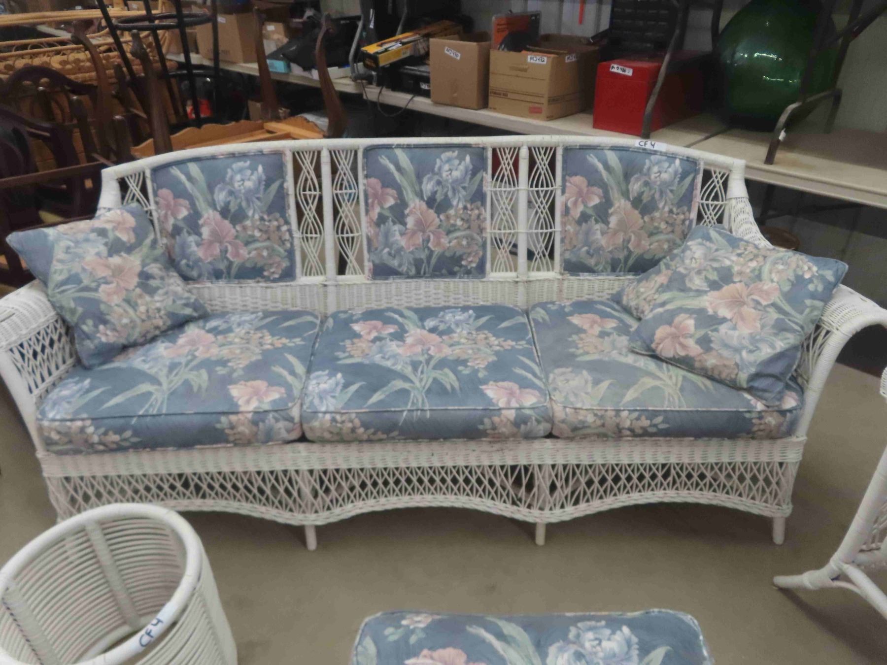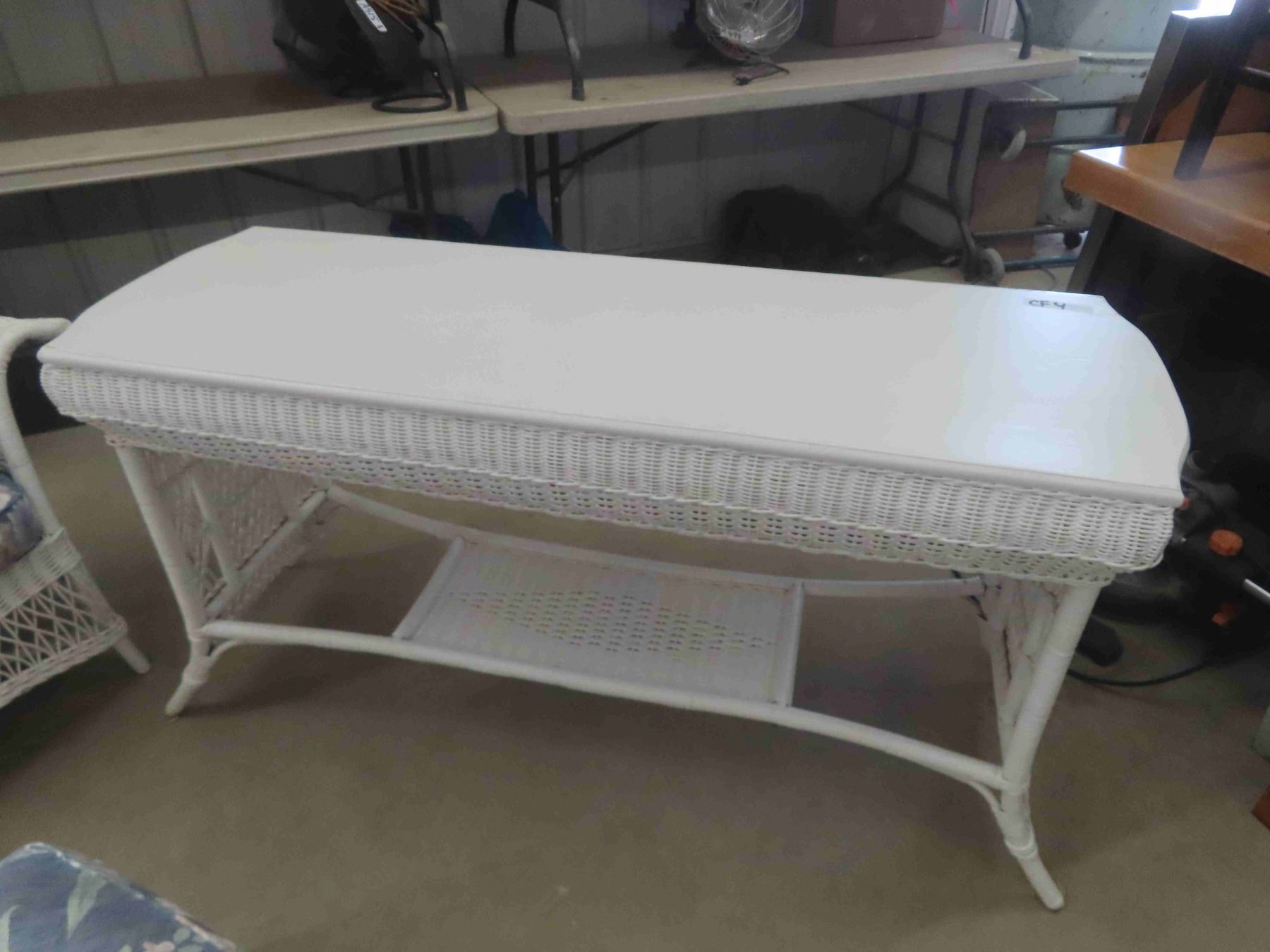 White Wicker Patio Couch 85" Wide, Table 19" x 30" x 56", Ottoman + Round Table Base - No Top