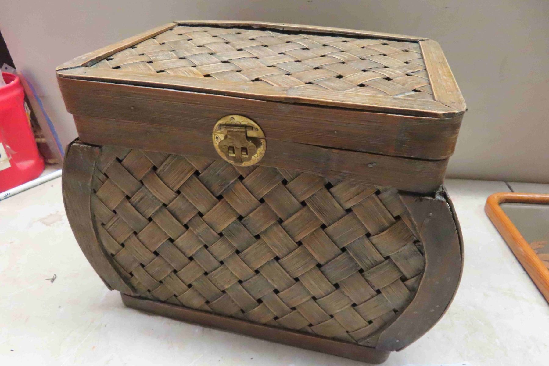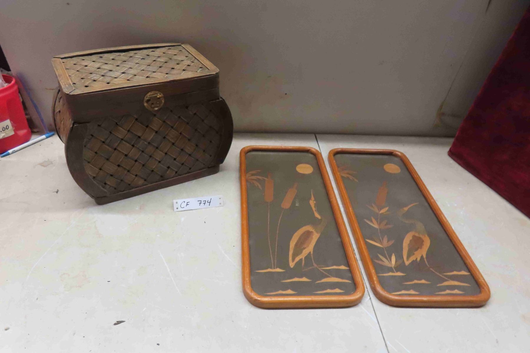 Wicker Style Basket with Lid, 2 Wood Framed Pictures 19'' x 9''