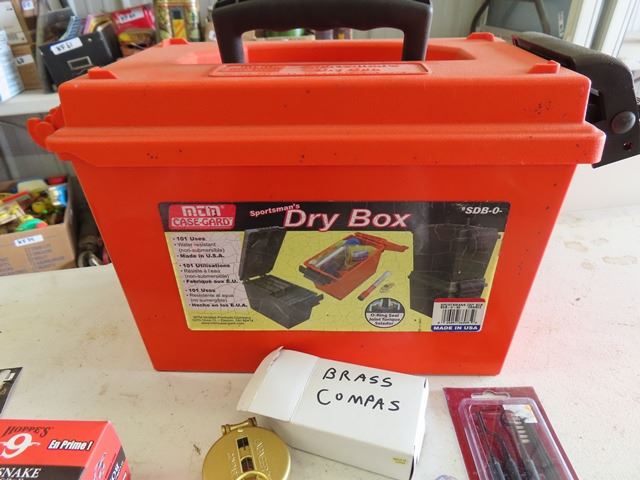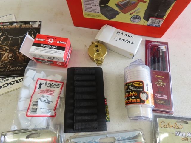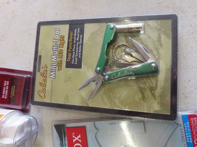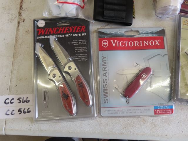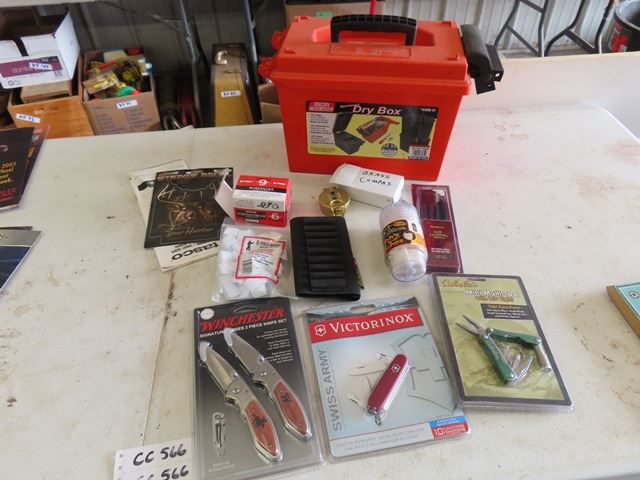 Winchester 2pc Knife Set, Victorinox Swiss Army Knife, Cabella's Mini Multi Tool, Gun Cleaning Tools, Plastic Dry Box