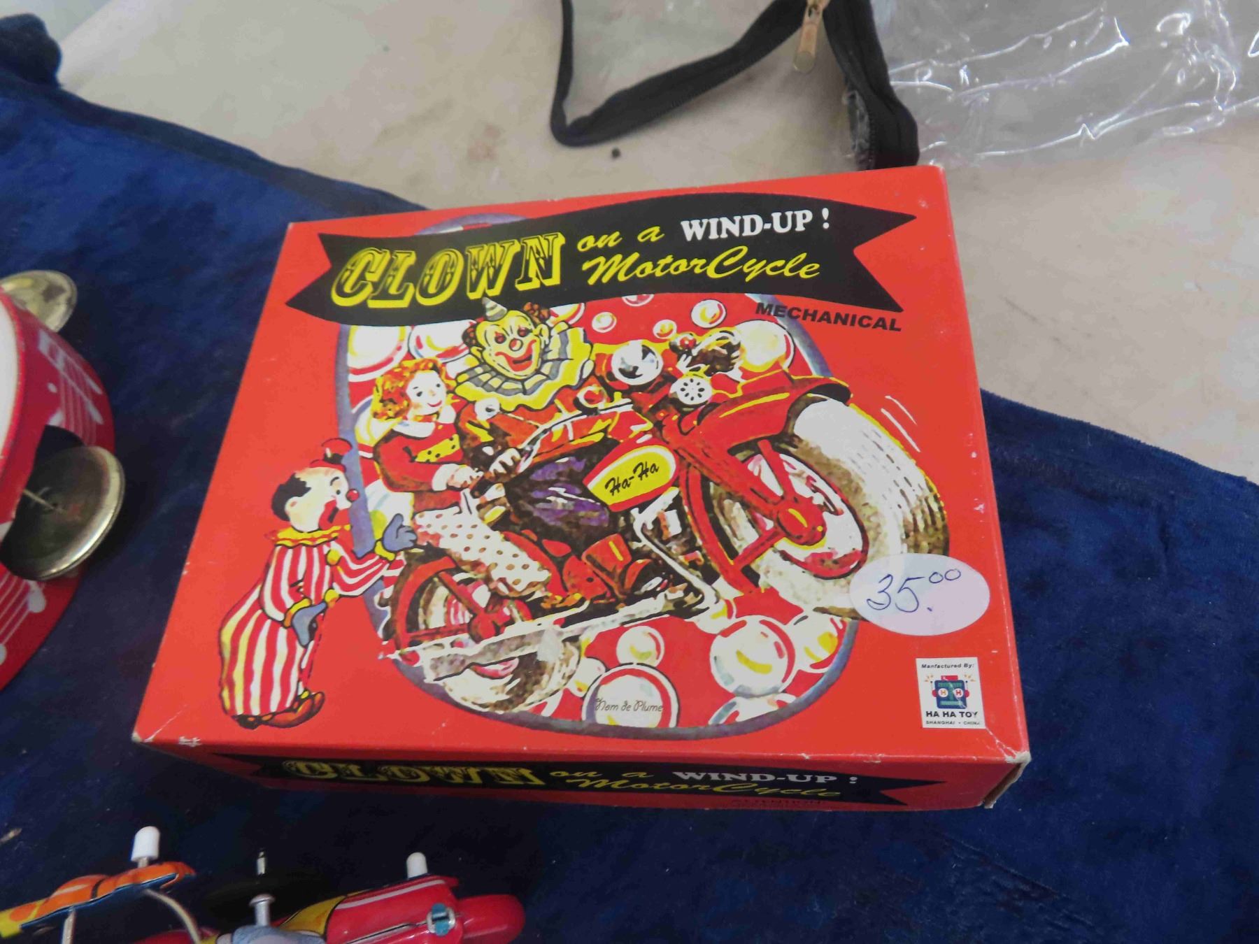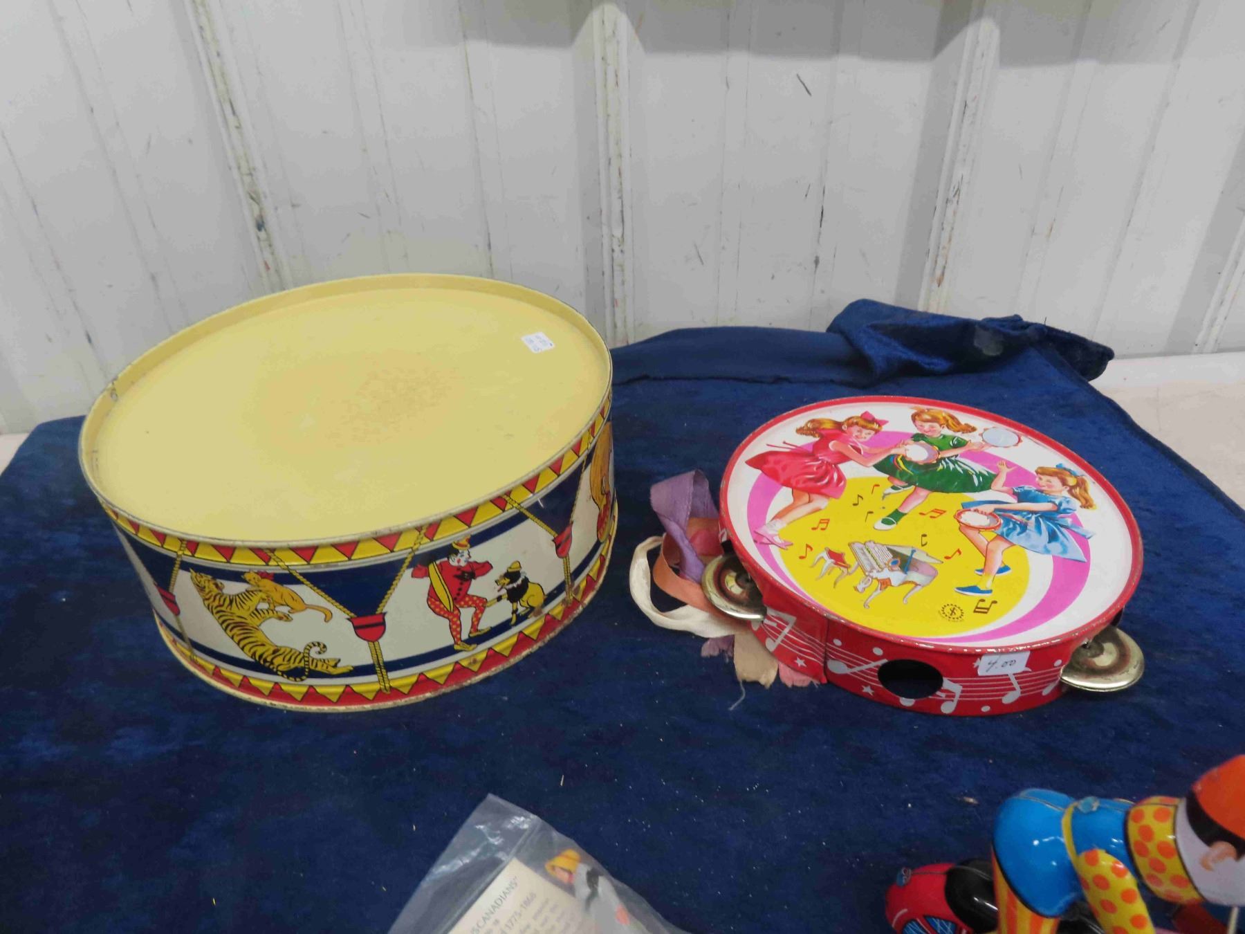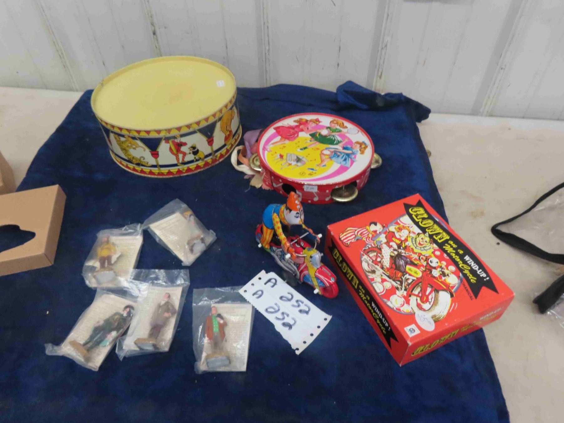 Wind Up Tin Clown on Bicycle with Box - HA HA Toy + Vintage Tin Drum + Tambourine & 5 Canada Famous Figurines