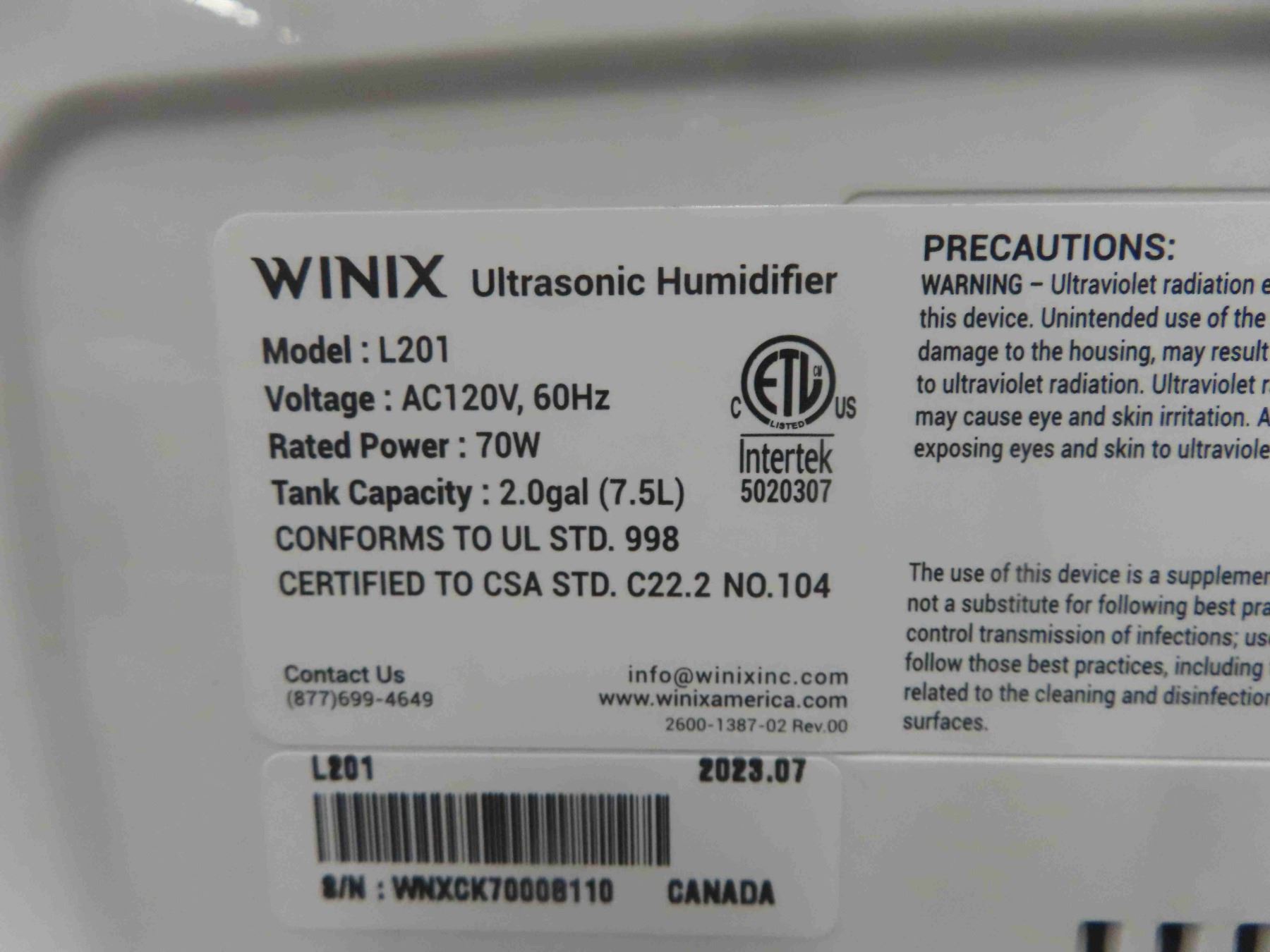 Winix Ultrasonic Humidifier - 2 Gal Capacity