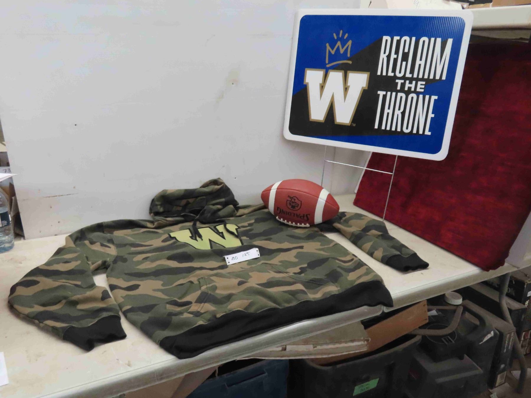 Winnipeg Blue Bombers: CFL Official Jav Leather Football, Yard Sign, Bomber Store Exclusive 3XL Camo Hoodie