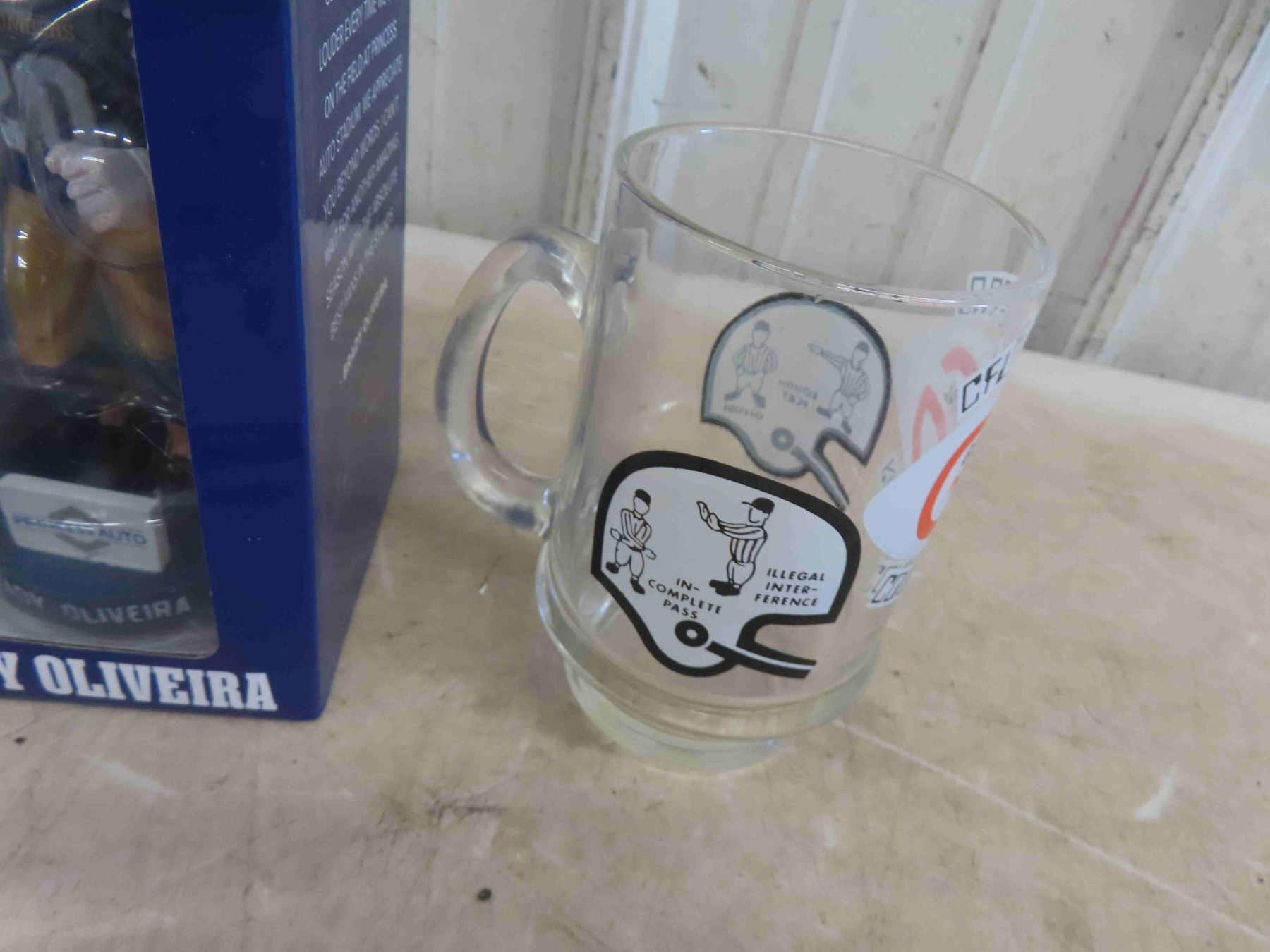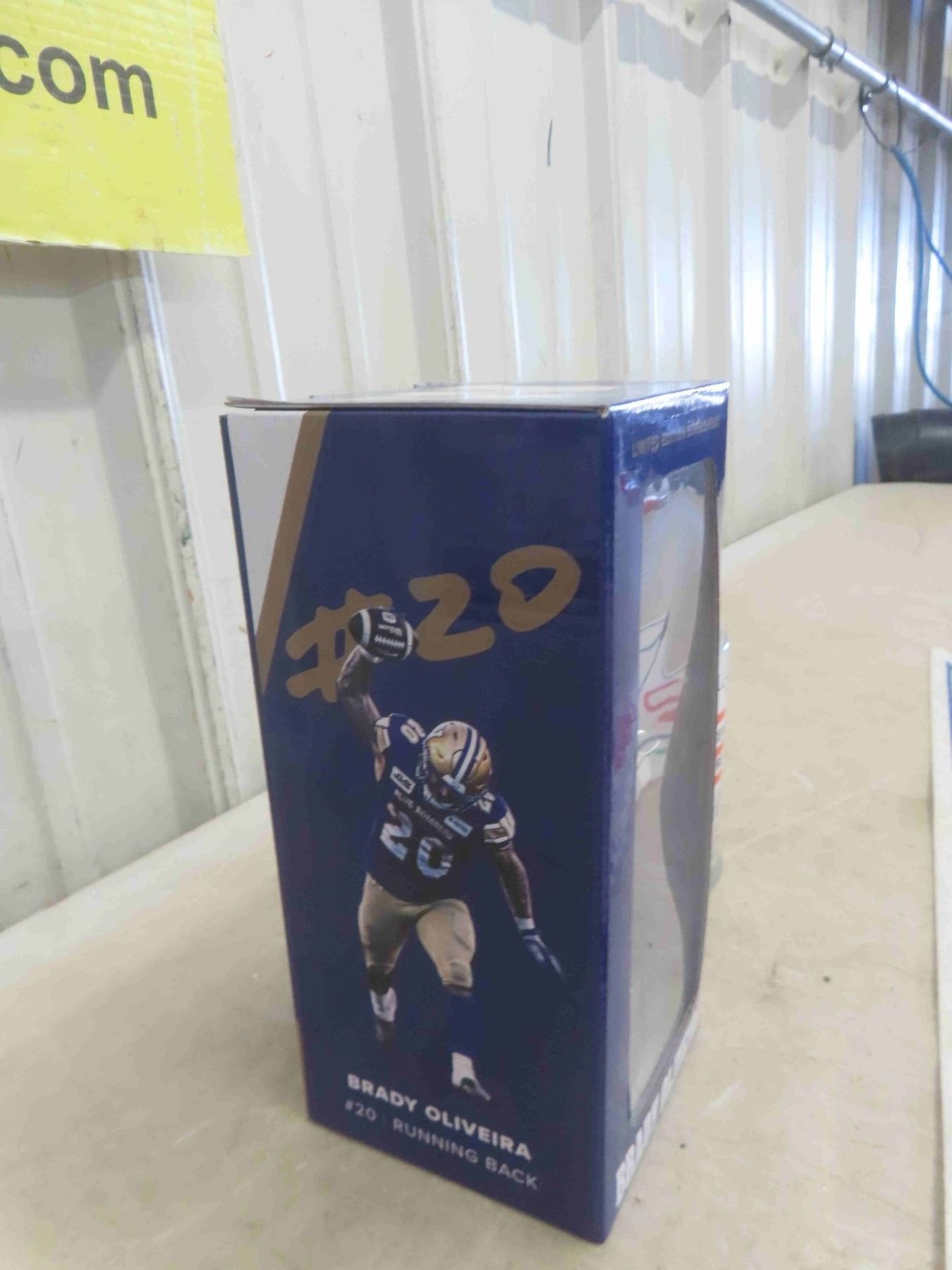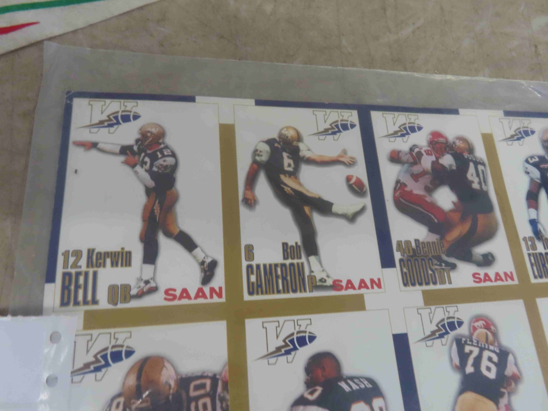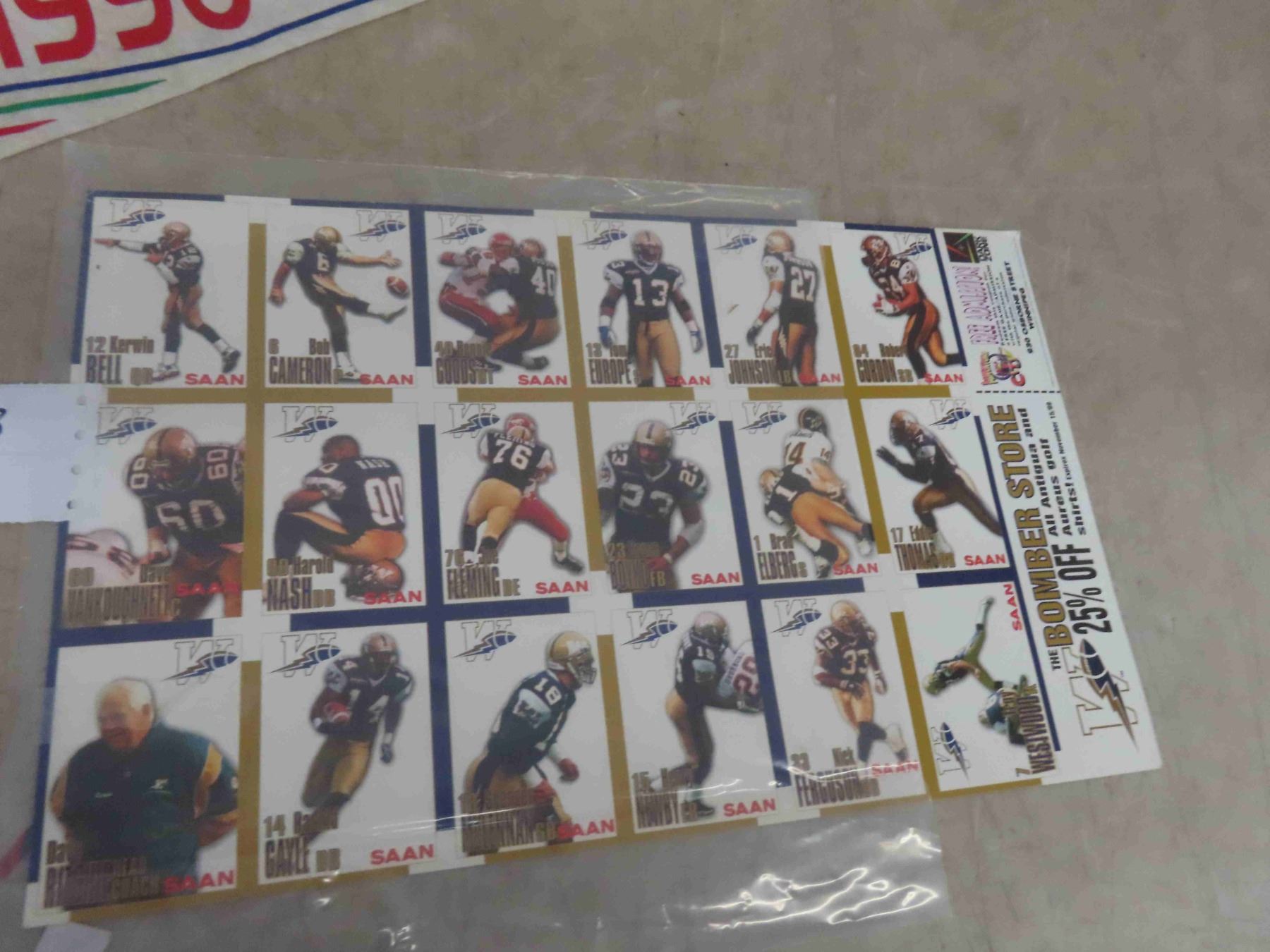 Winnipeg Blue Bombers Lot: Mug, Uncut Sheet of Cards, 1990 Grey Cup Pennant, Brady Oliveira Bobblehead.