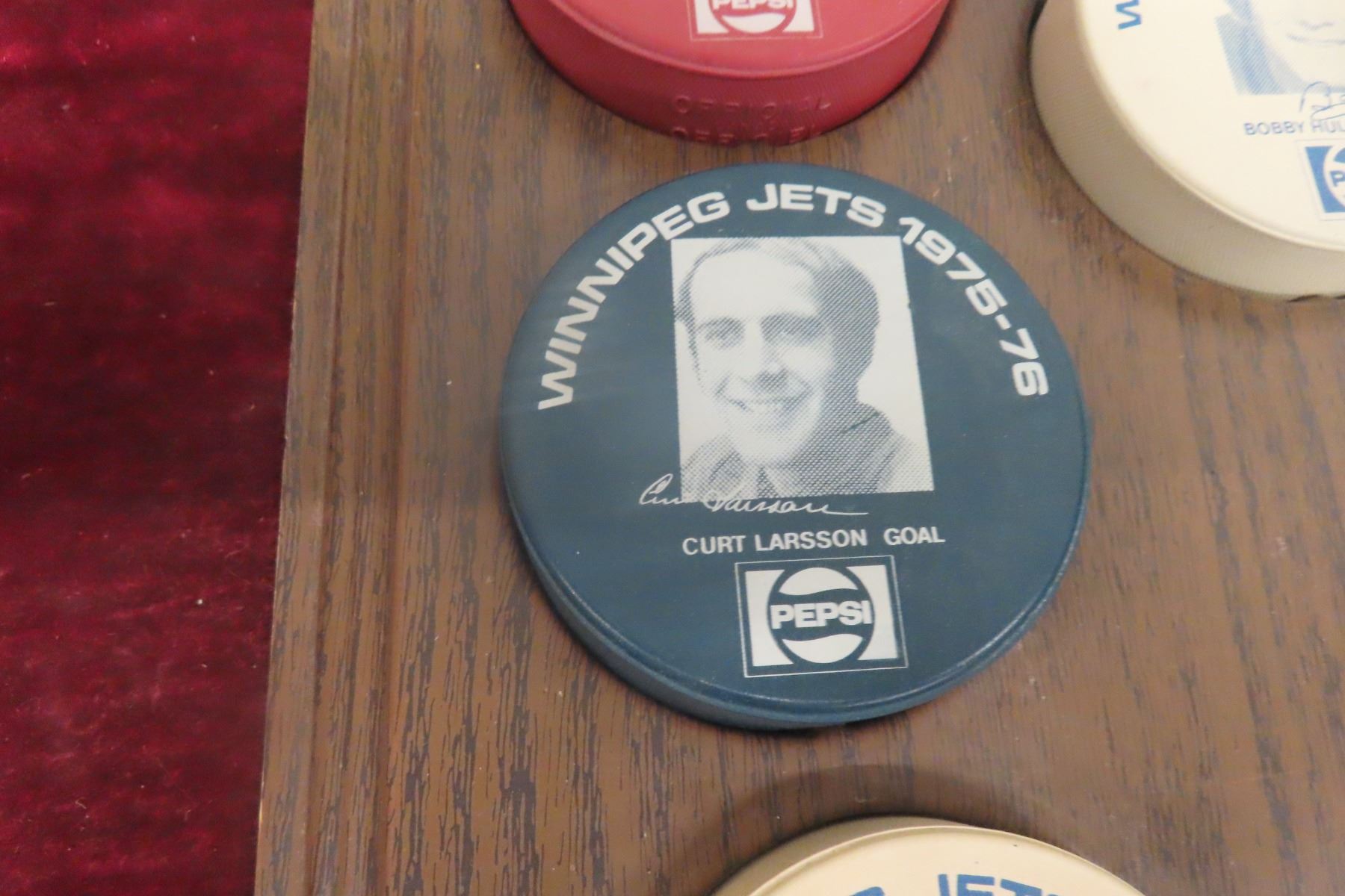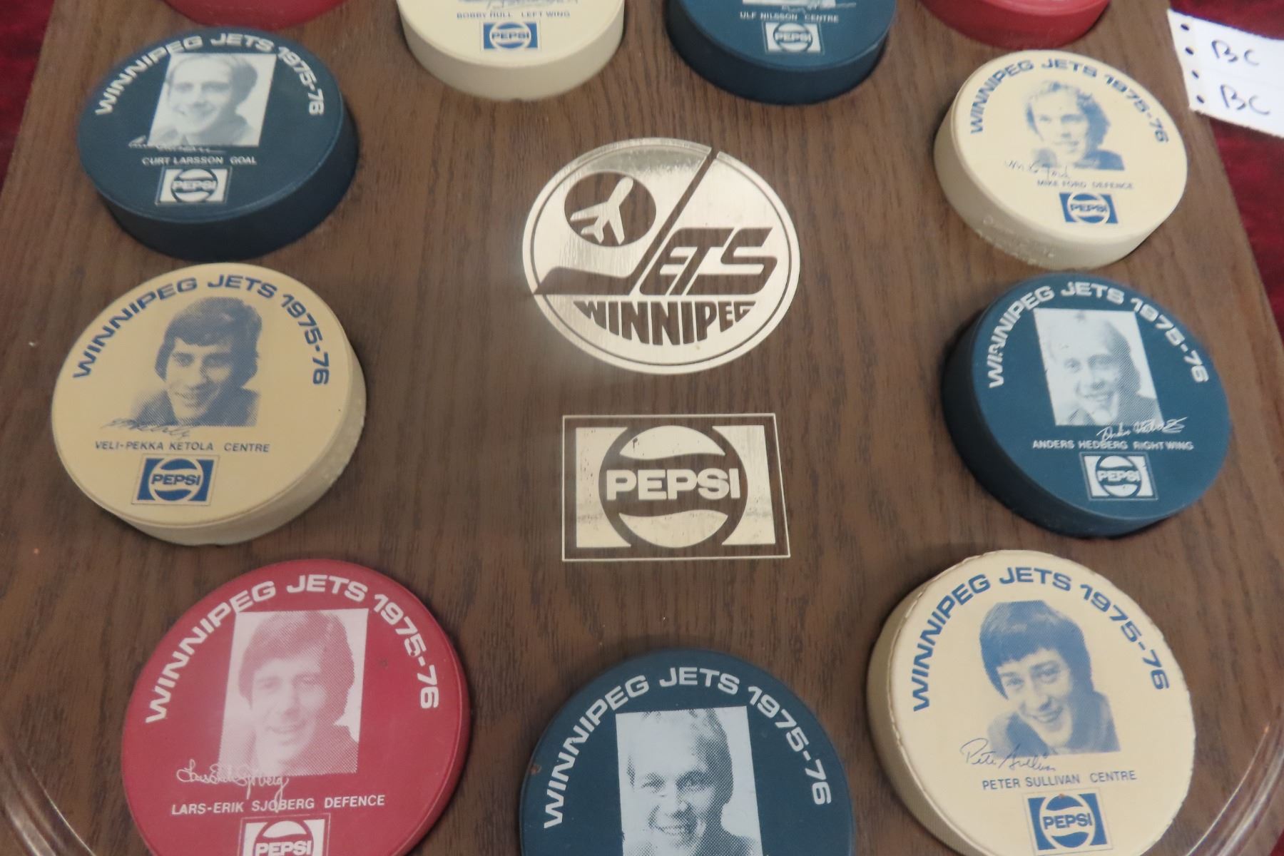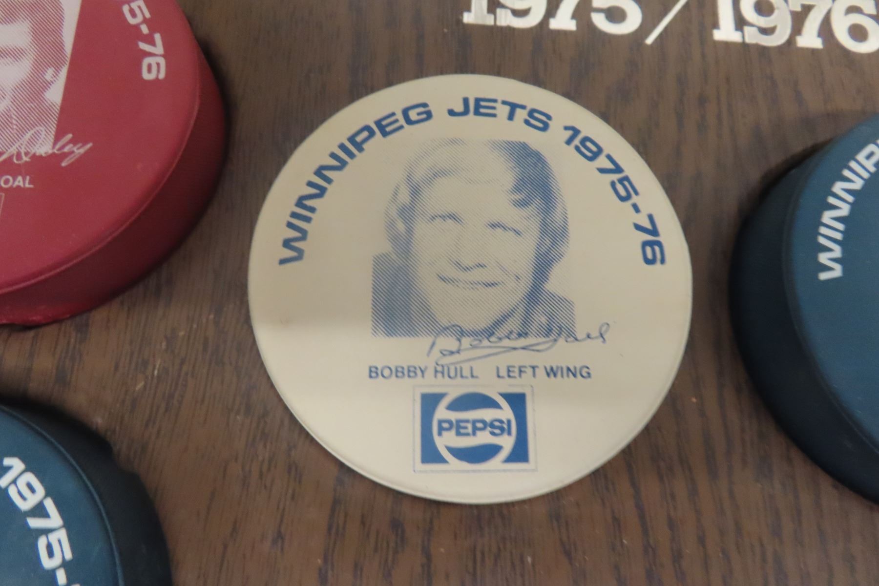 Winnipeg Jets 1975/76 Pepsi Promotion Shield with 11 Pucks (Bobby Hull, Joe Daley, and More), Rare