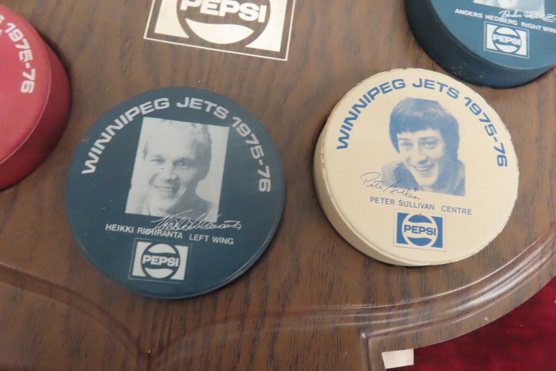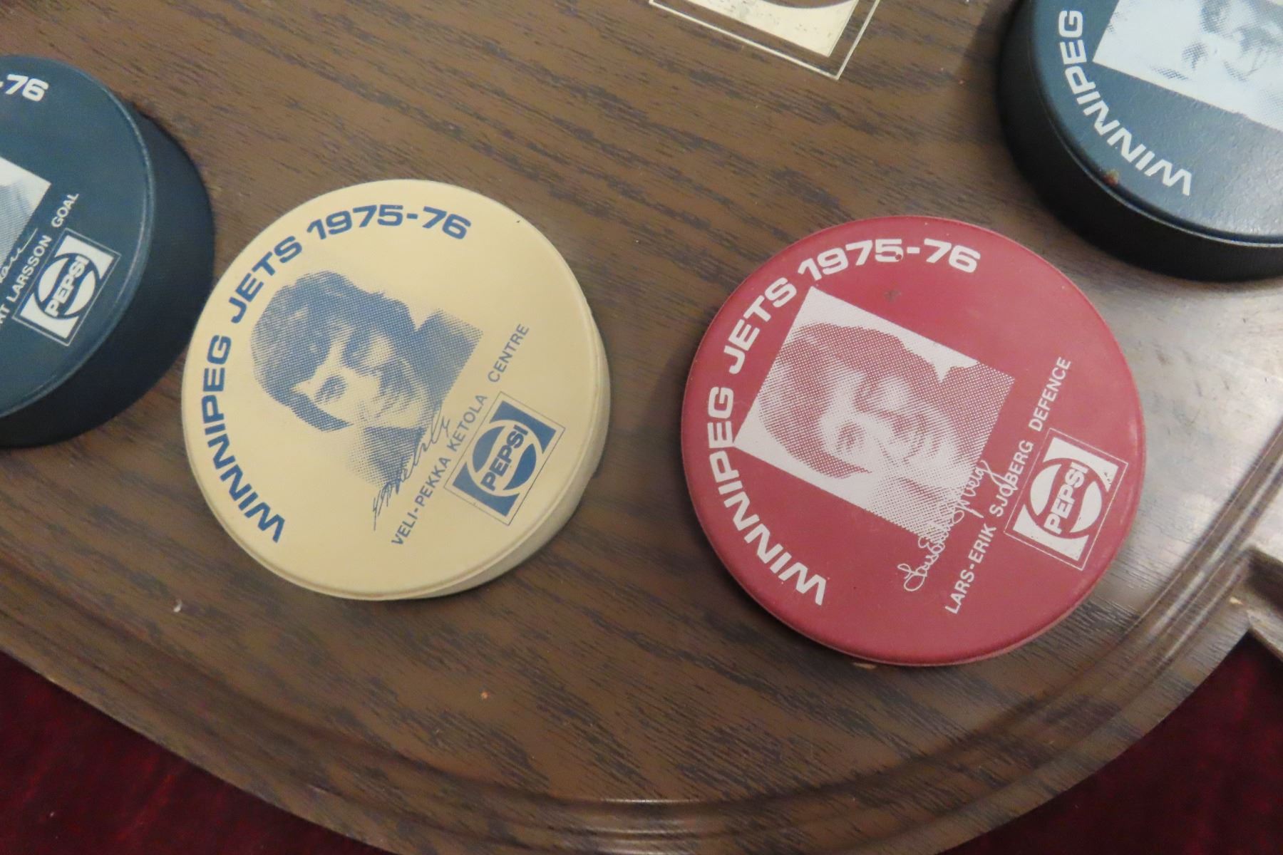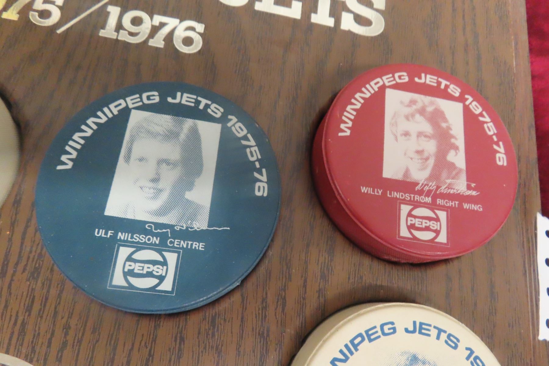 Winnipeg Jets 1975/76 Pepsi Promotion Shield with 11 Pucks (Bobby Hull, Joe Daley, and More), Rare Set, Hang or Easel Back
