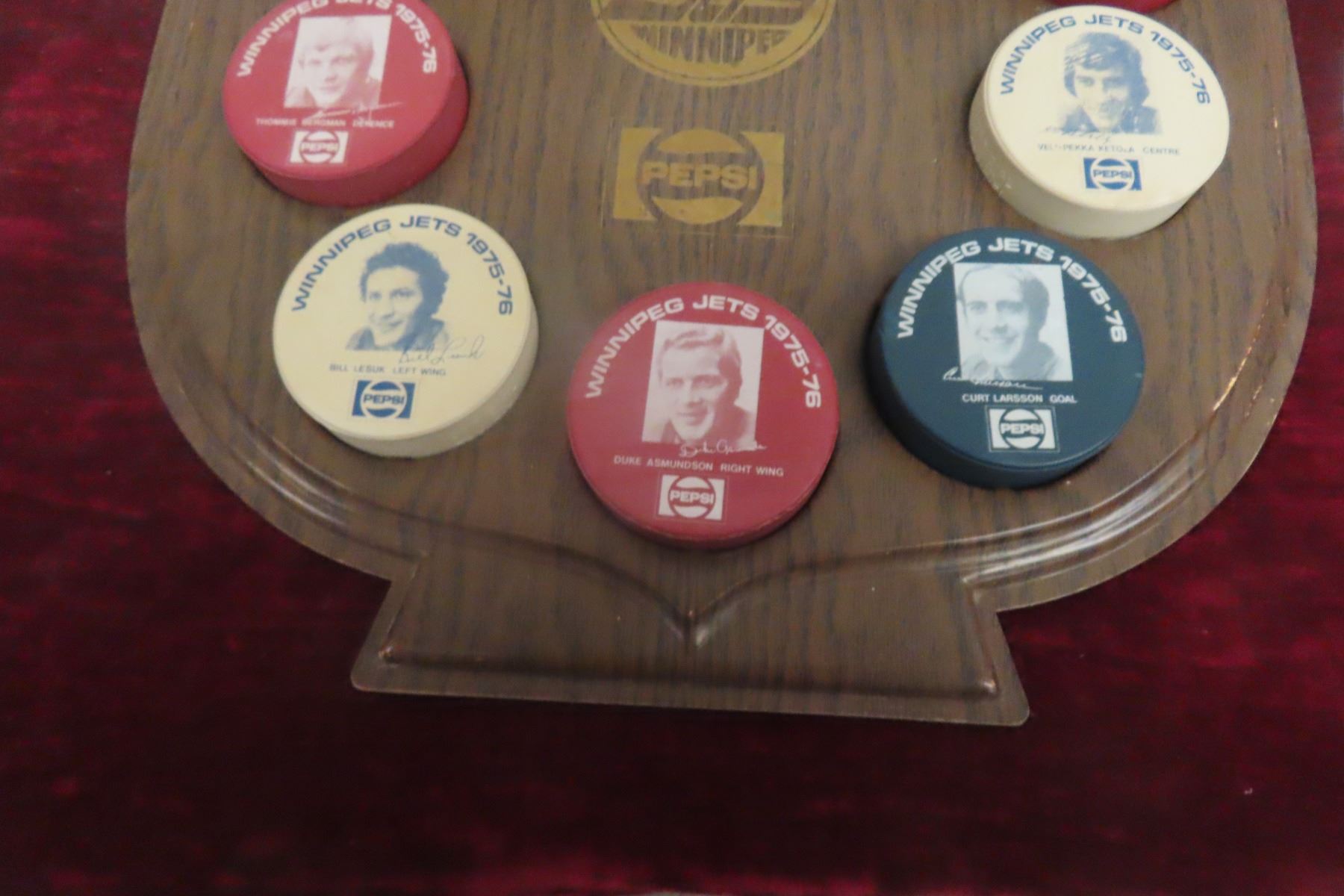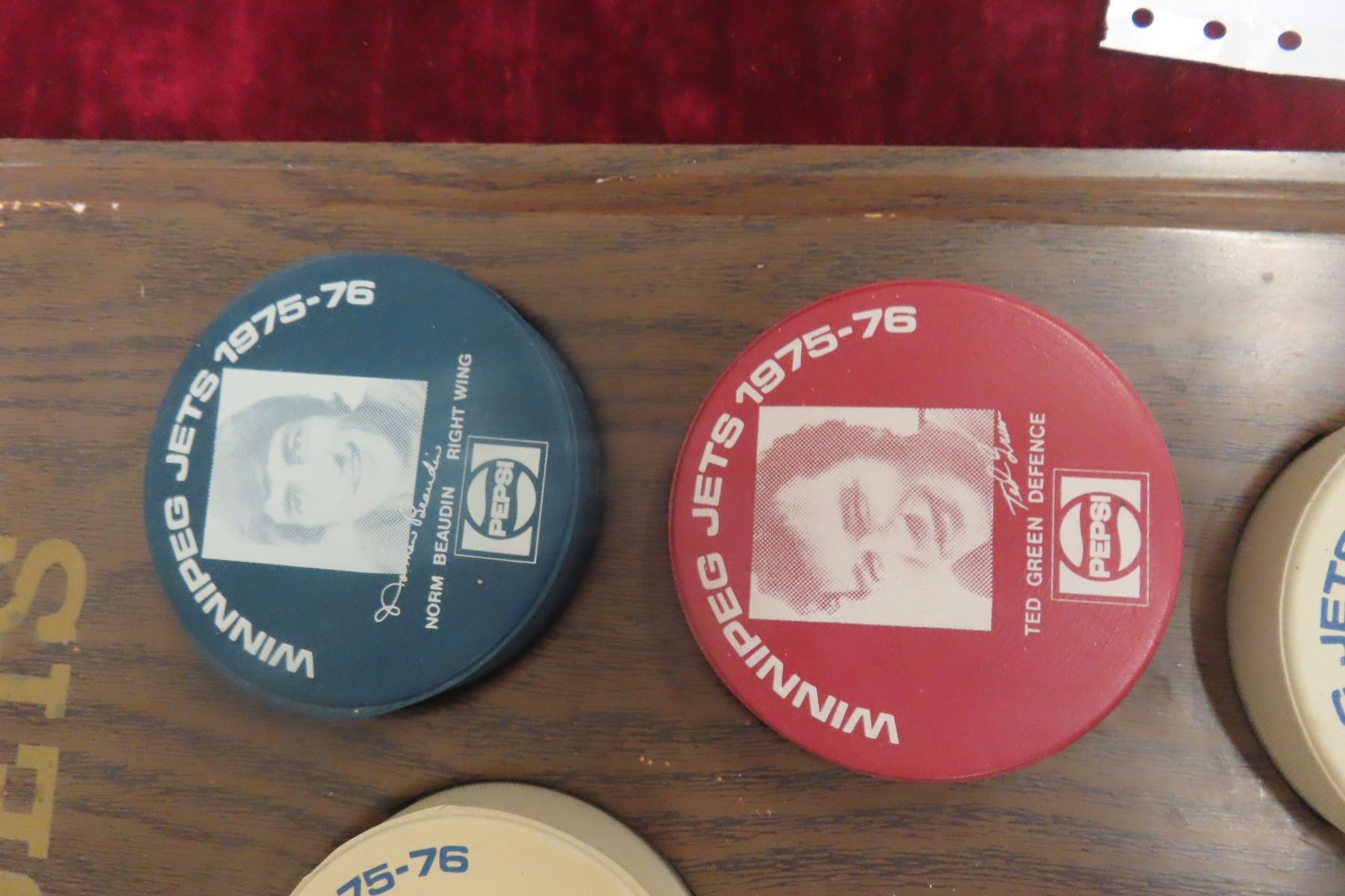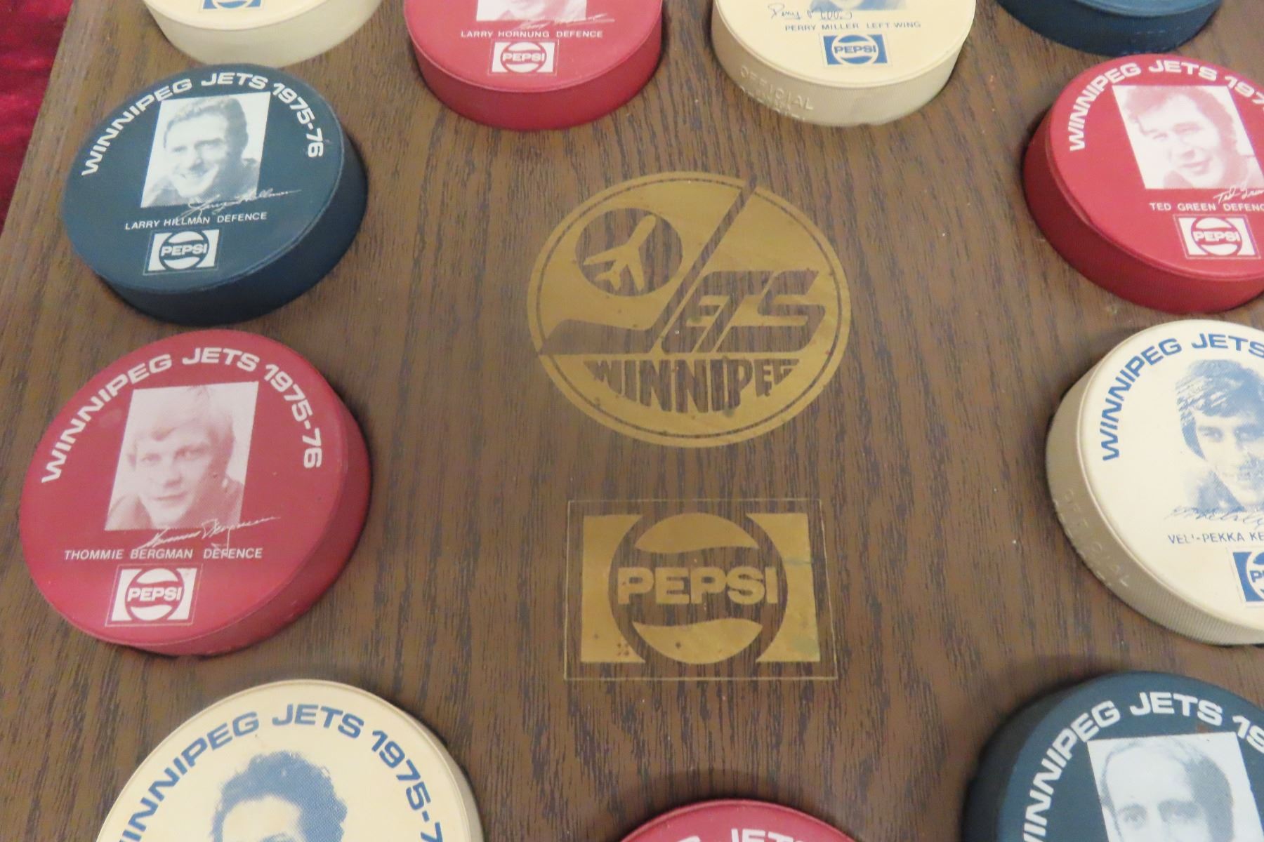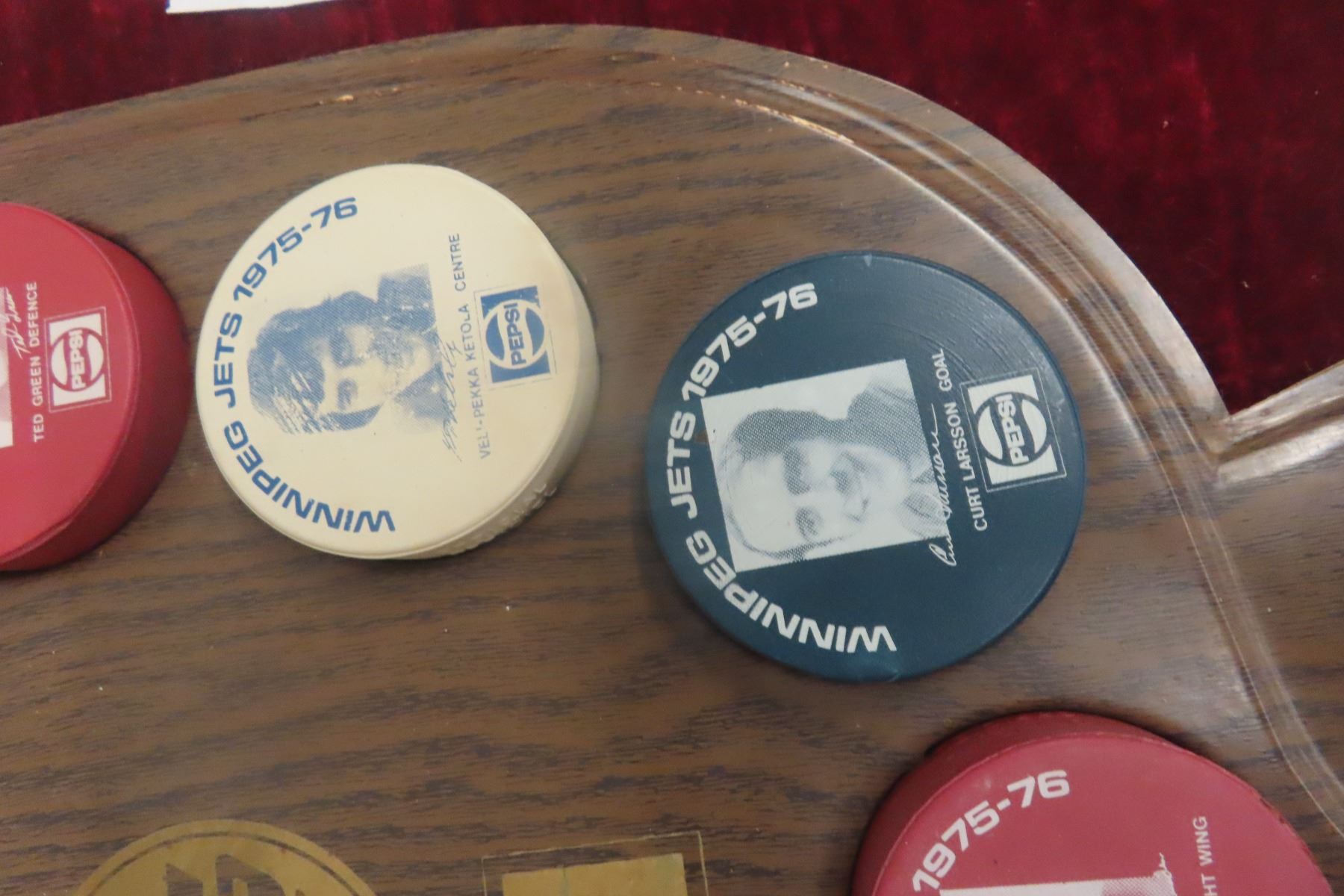 Winnipeg Jets 1975/76 Pepsi Promotion Shield with 11 Pucks, Rare Set, Hang or Easel Back