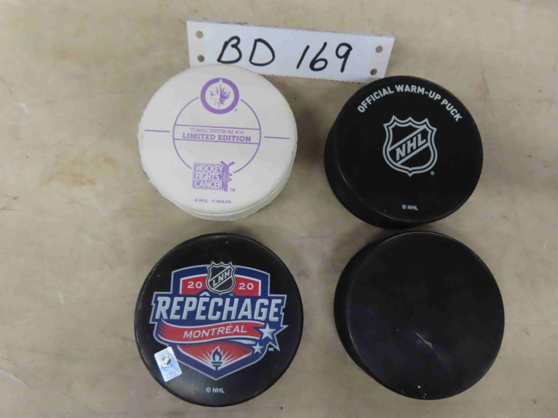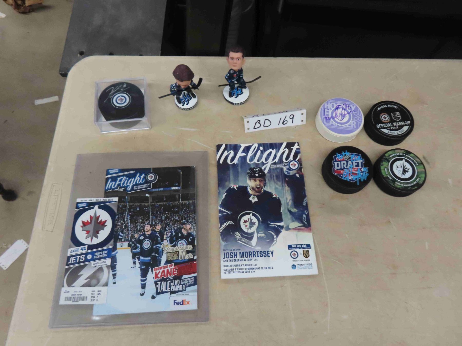 Winnipeg Jets 2.0 Lot : Kyle Connor Signed Puck with Certificate of Authenticity , Signed Cole Perfetti Puck Inscribed 10th Pick , Toby Enstrom Puck , Warm Up Used Puck , Steve Stamkos 60th Goal Stub and Program , Bobble Heads , Plus