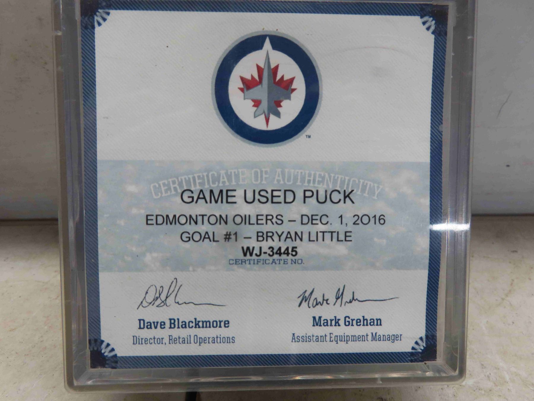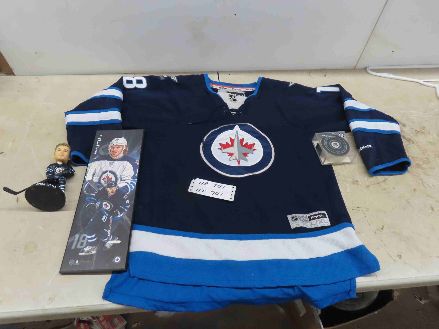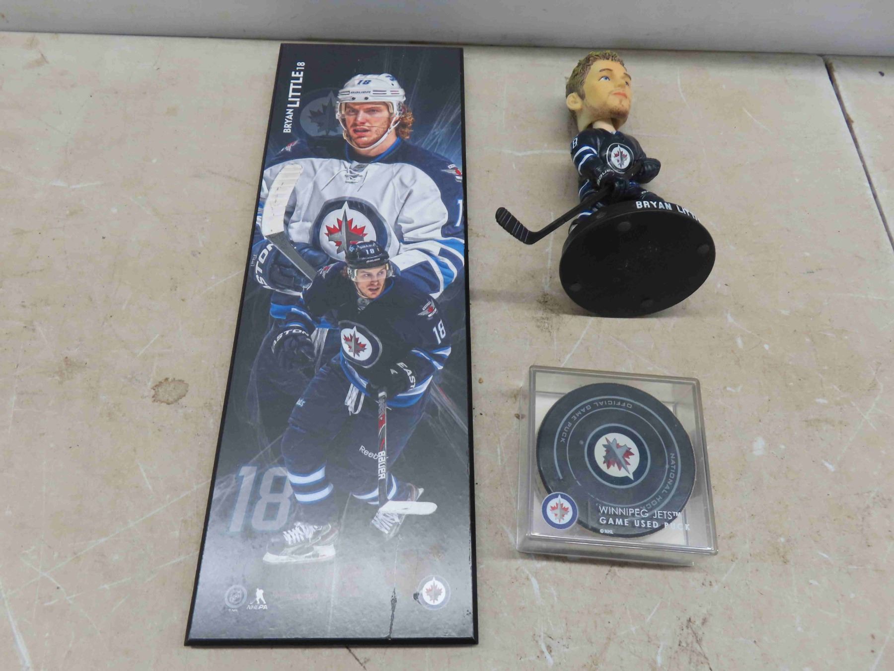 Winnipeg Jets Signed Jersey #18 Size Youth L/XL , Bryan Little Bobblehead, Plaque, Jets Game Used Puck