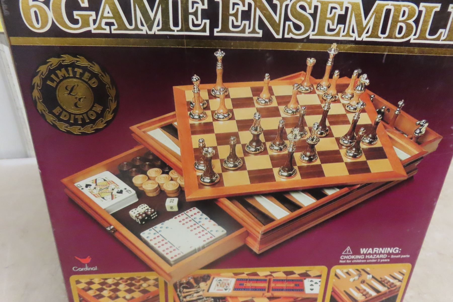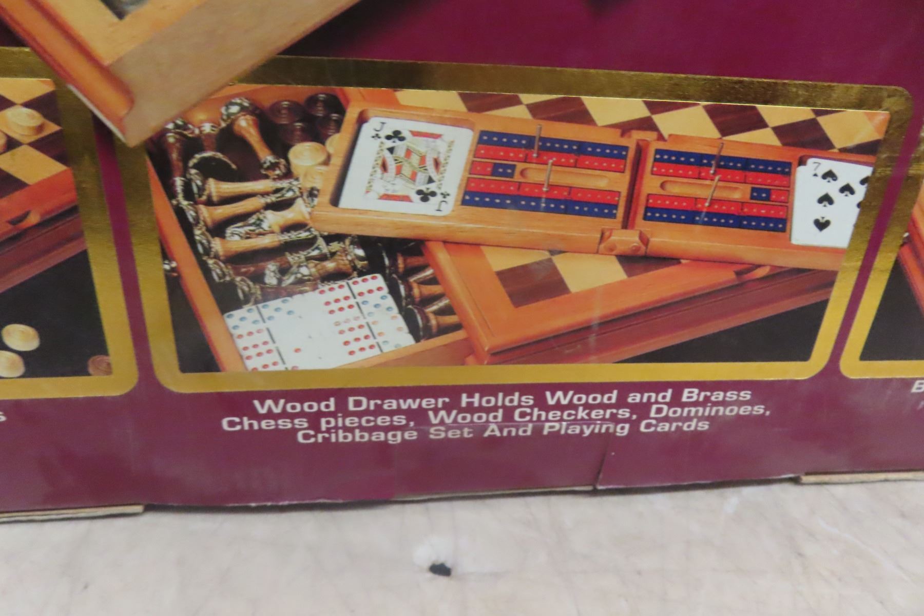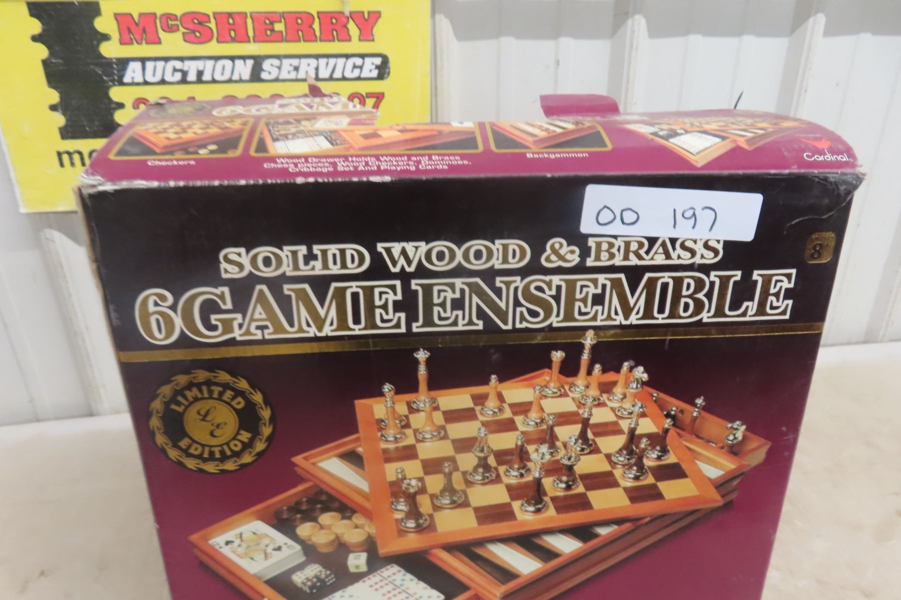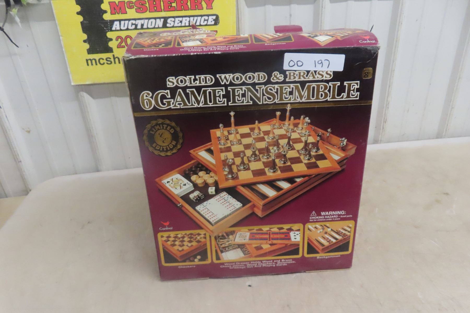 Wood & Brass Games Set — Chess, Checkers, Backgammon, Dominoes, Cribbage, Playing Cards
