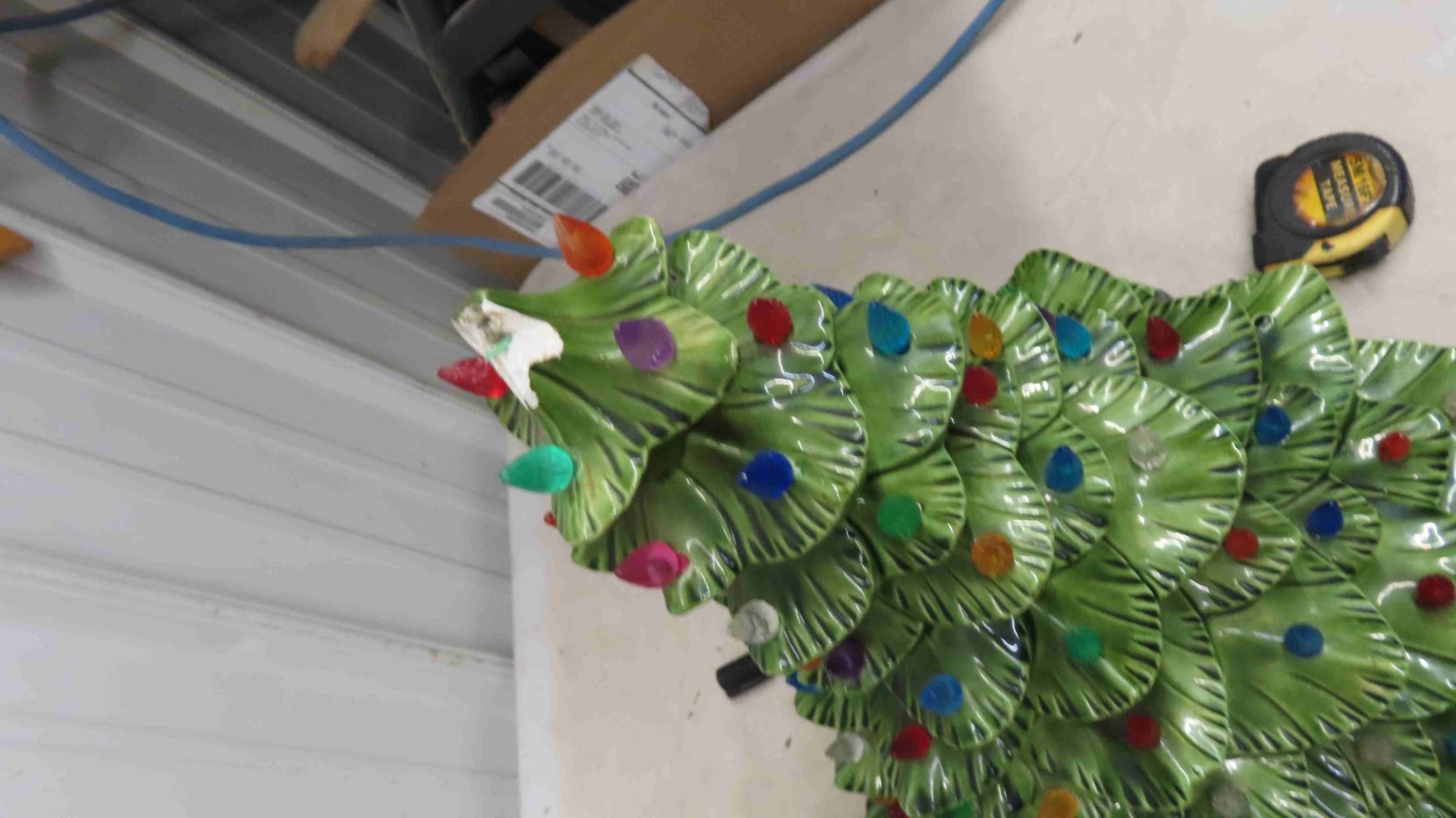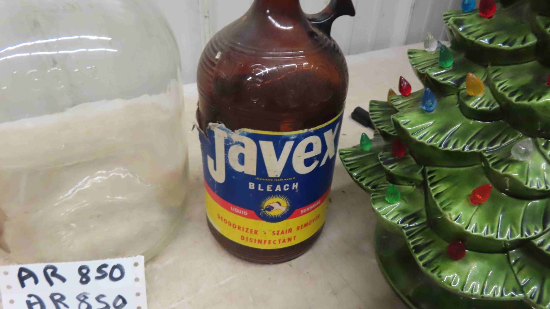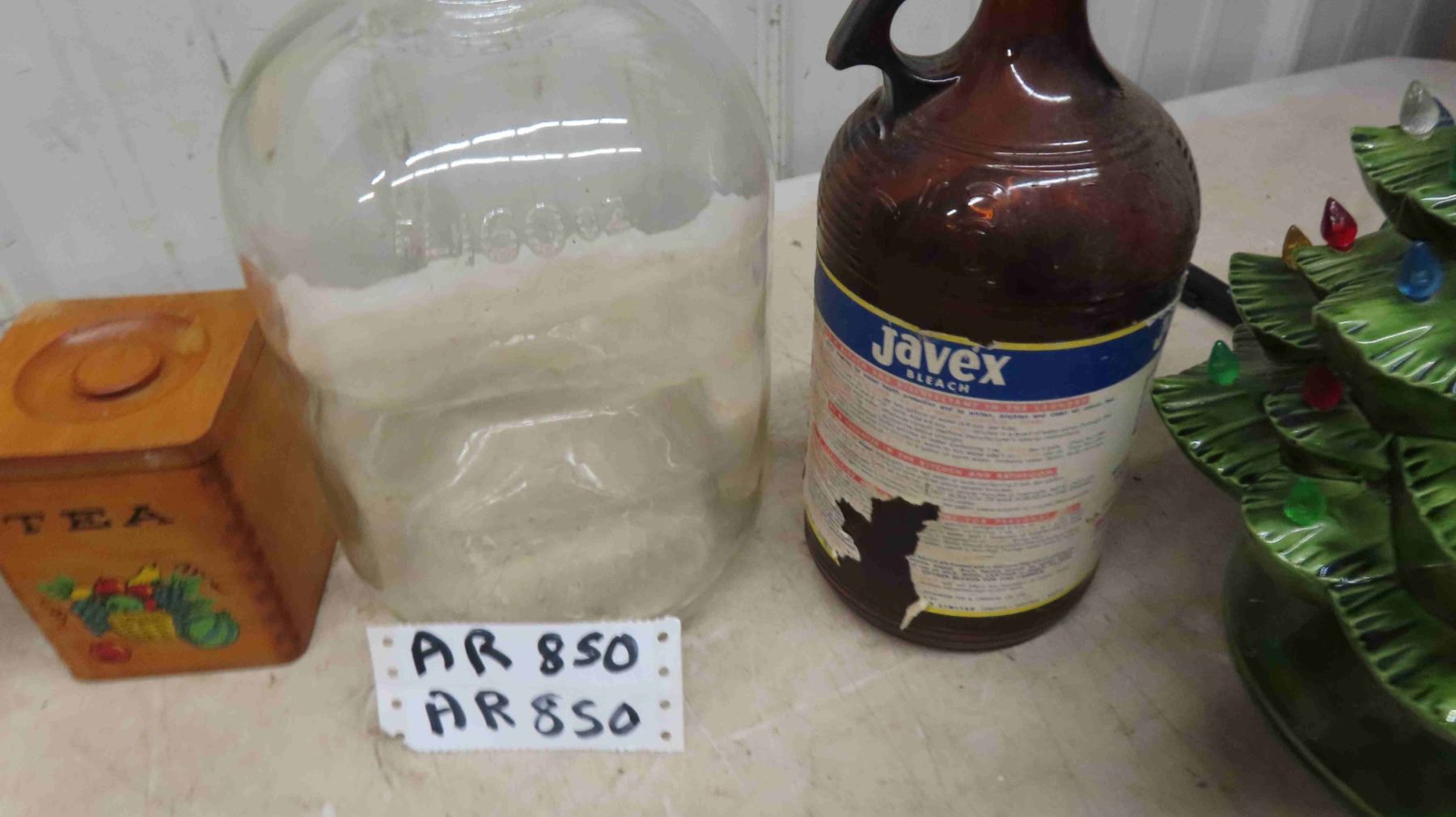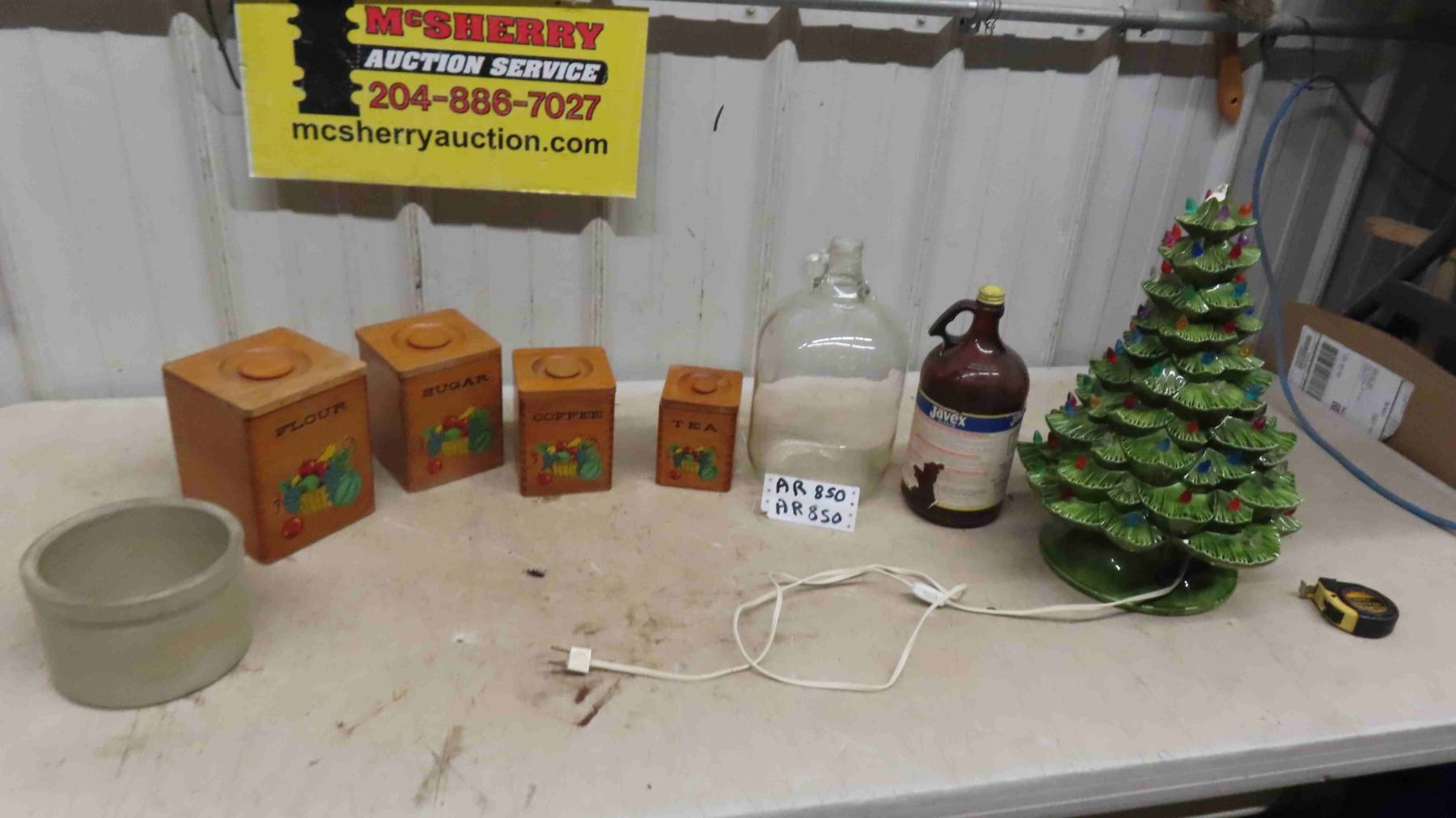 Wood Canister Set , Medalta 1/2 Gal Butter Crock , Vintage Javex Bleach Bottle , Ceramic Light Up Christmas Tree (Chip on Top)