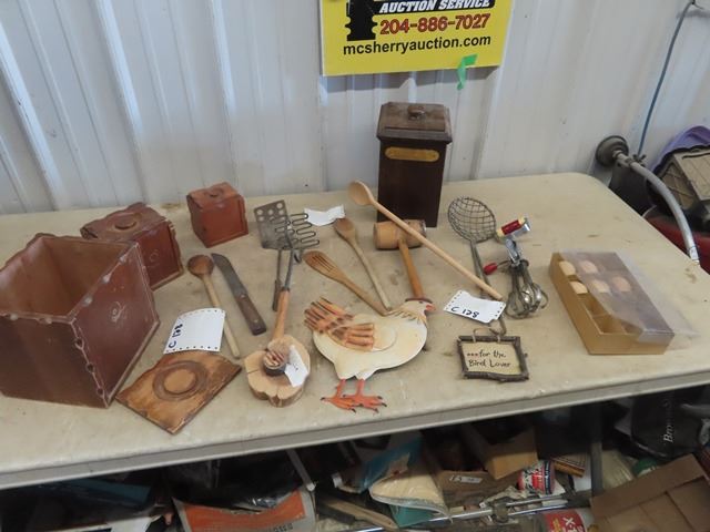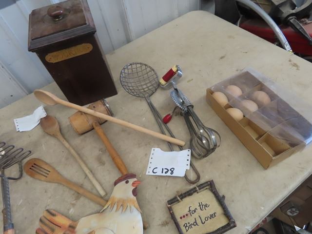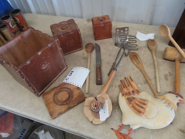 Wood Canisters, Wood Spoons, Kitchen Utensils, Metal Chicken Display