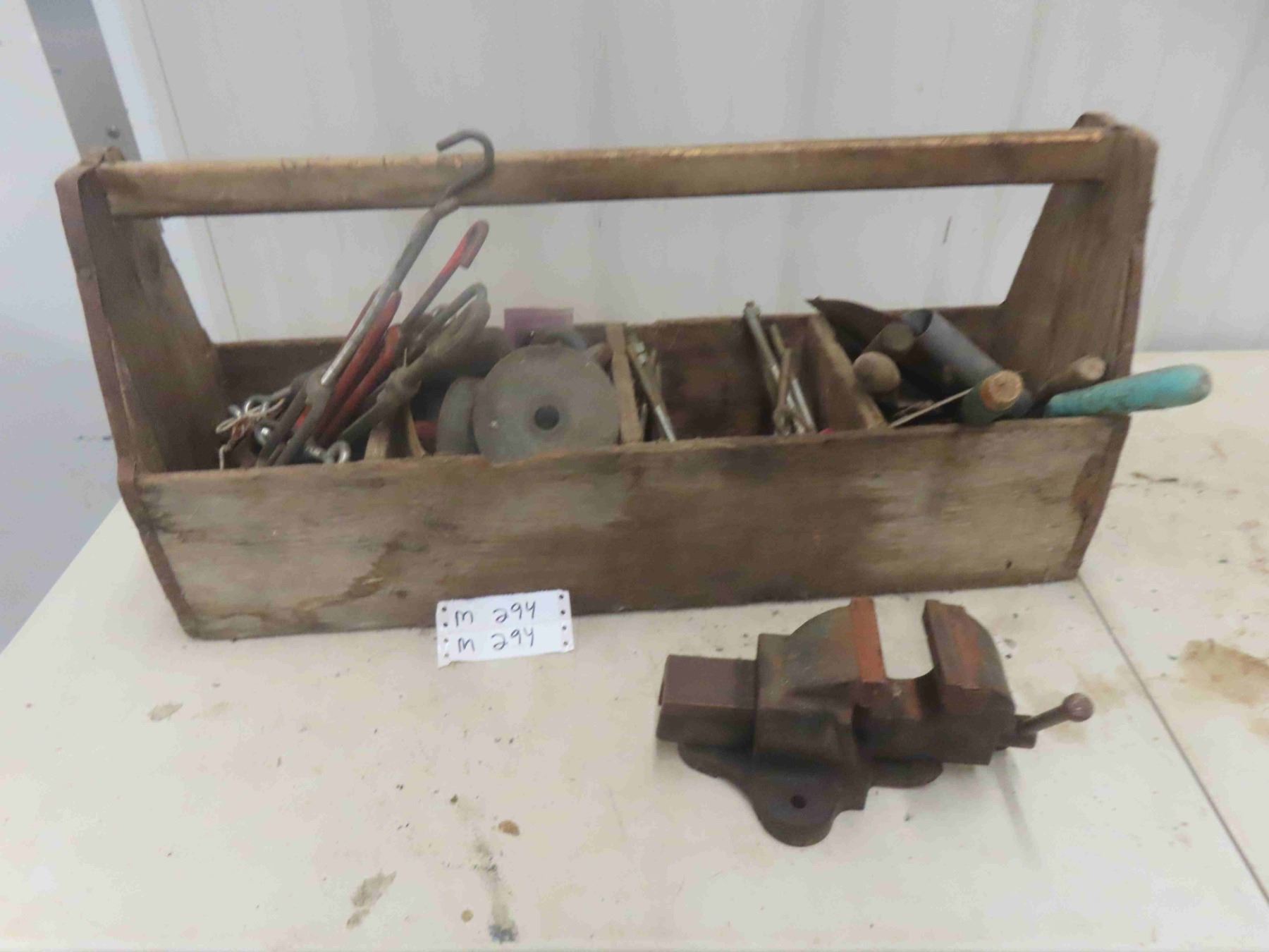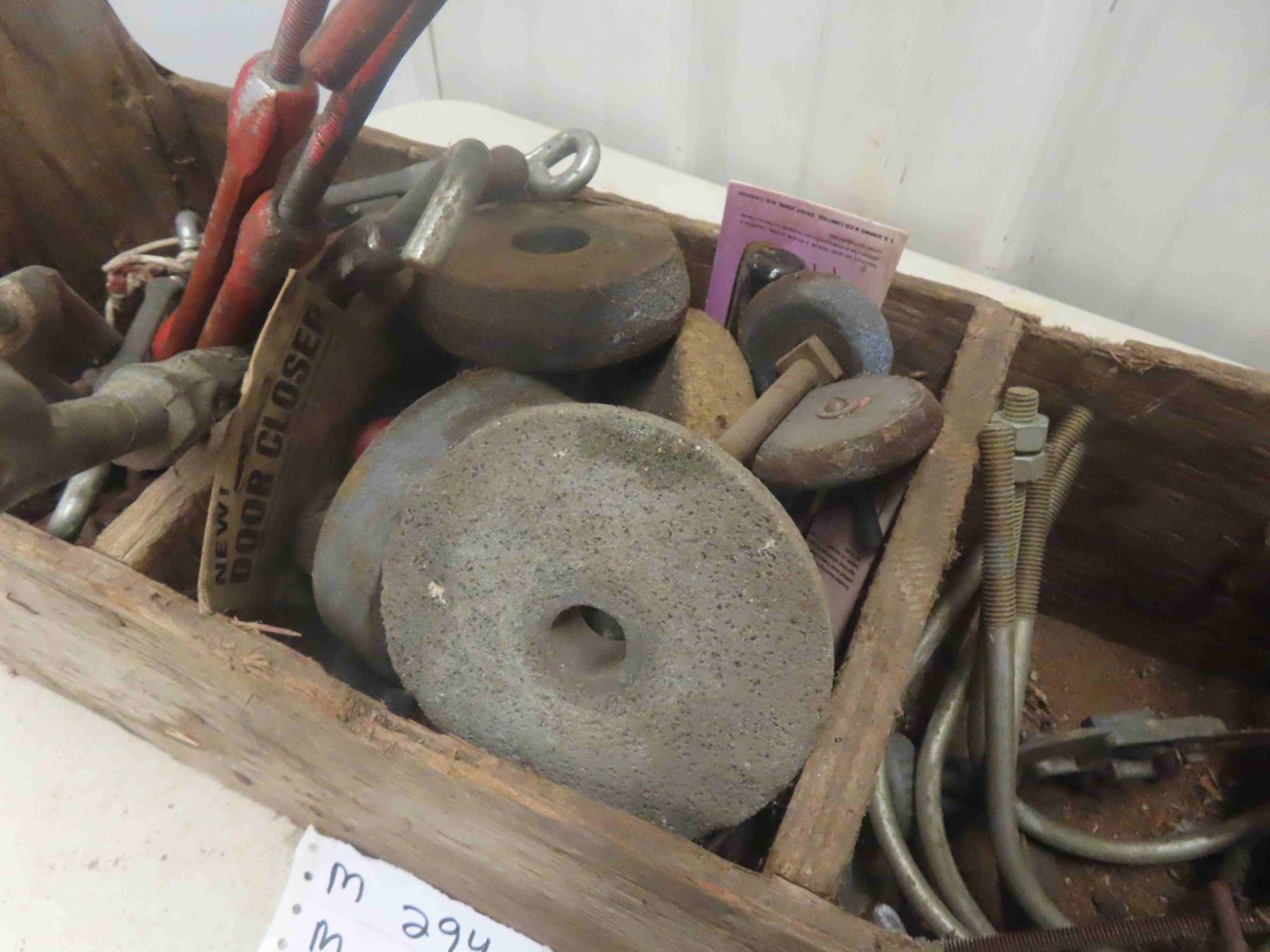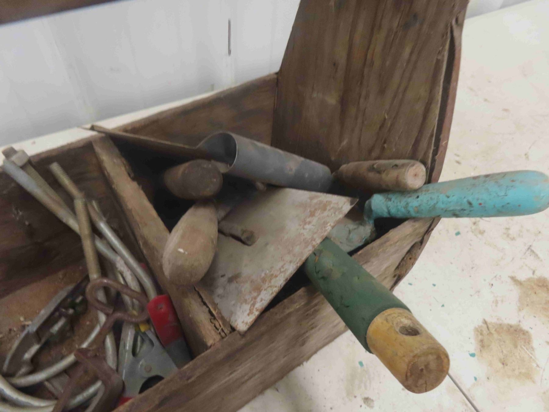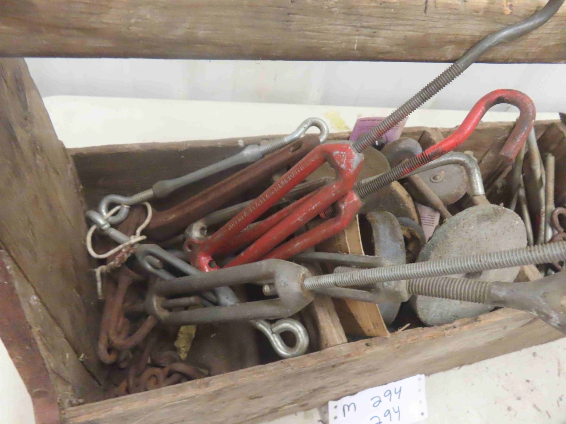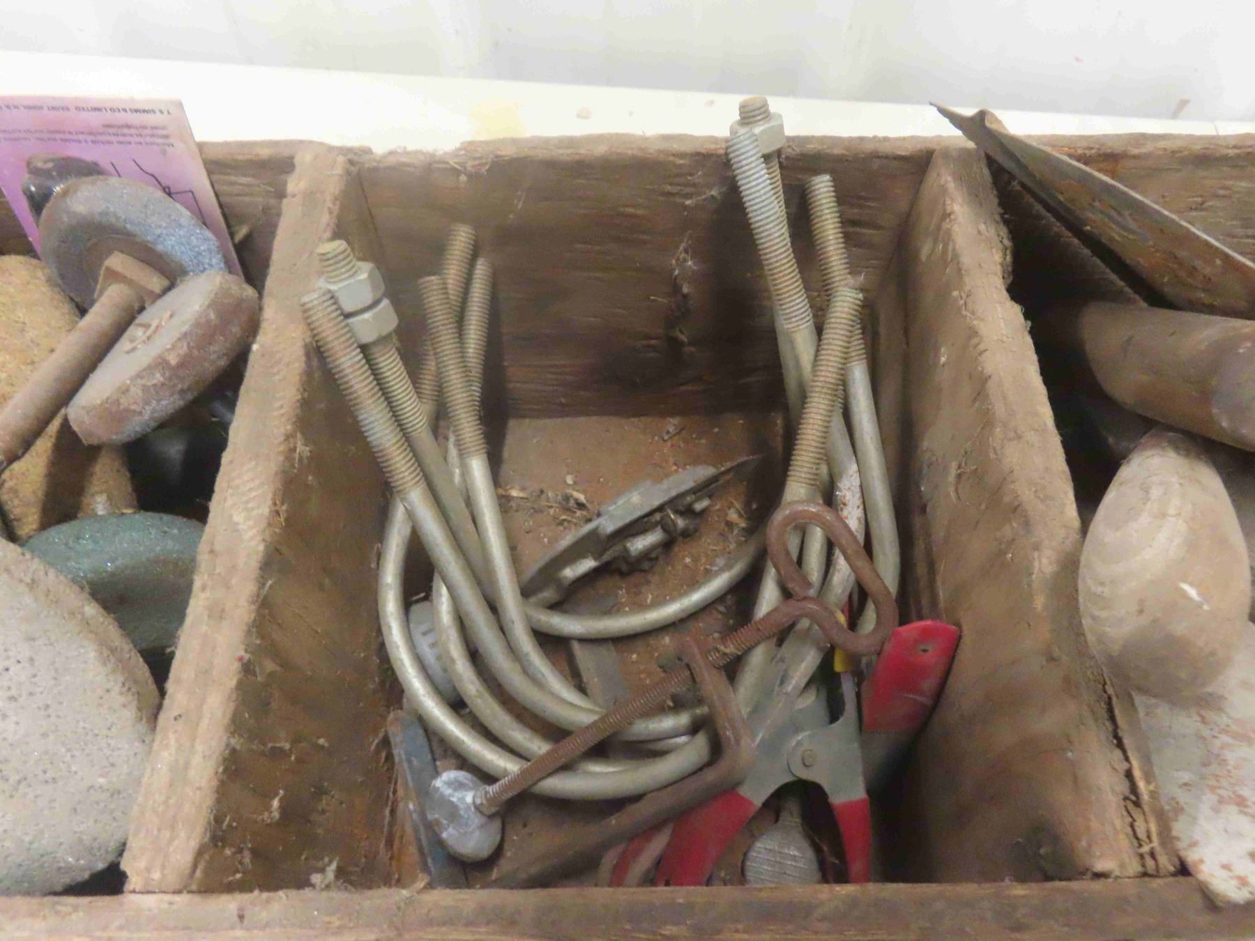 Wood Carpentry Tool Box with Grind Stones, U Bolts, Trowels, Cable Tightener & Vice