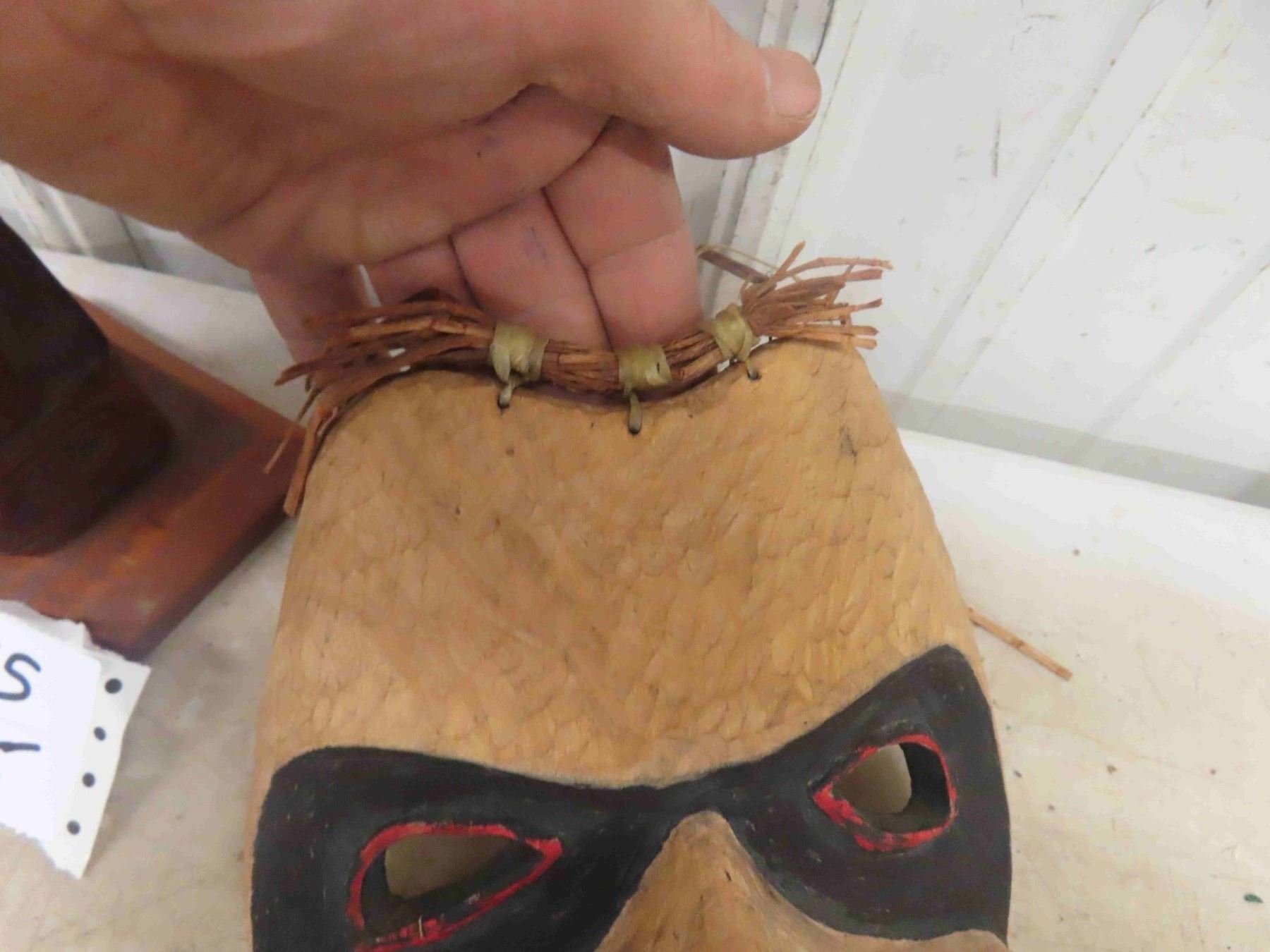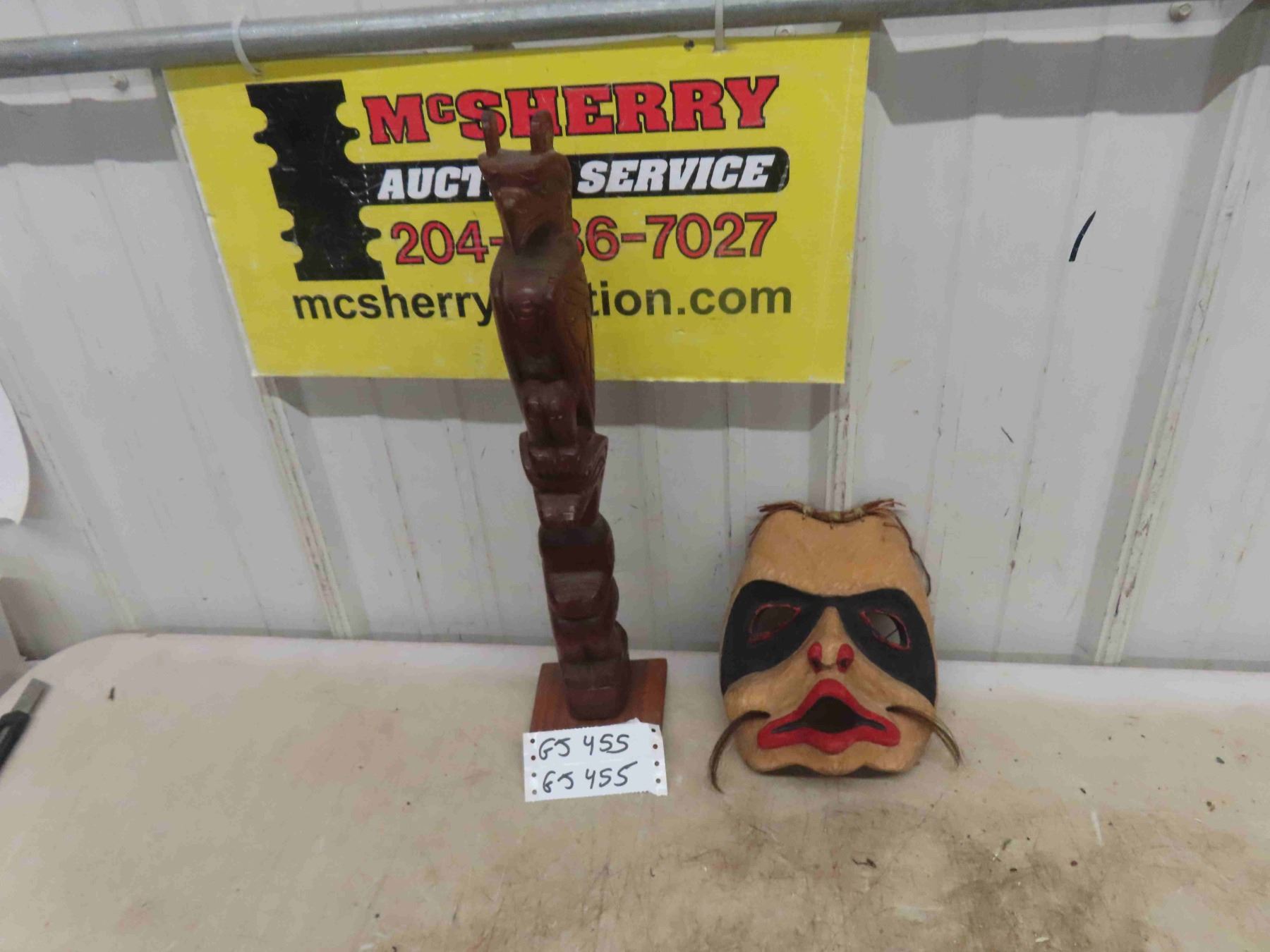 Wood Carved Todem Pole Display 20" Tall & Carved Tribal Mask - Hair of Reeds and Real Hair Whiskers 7" x 9"