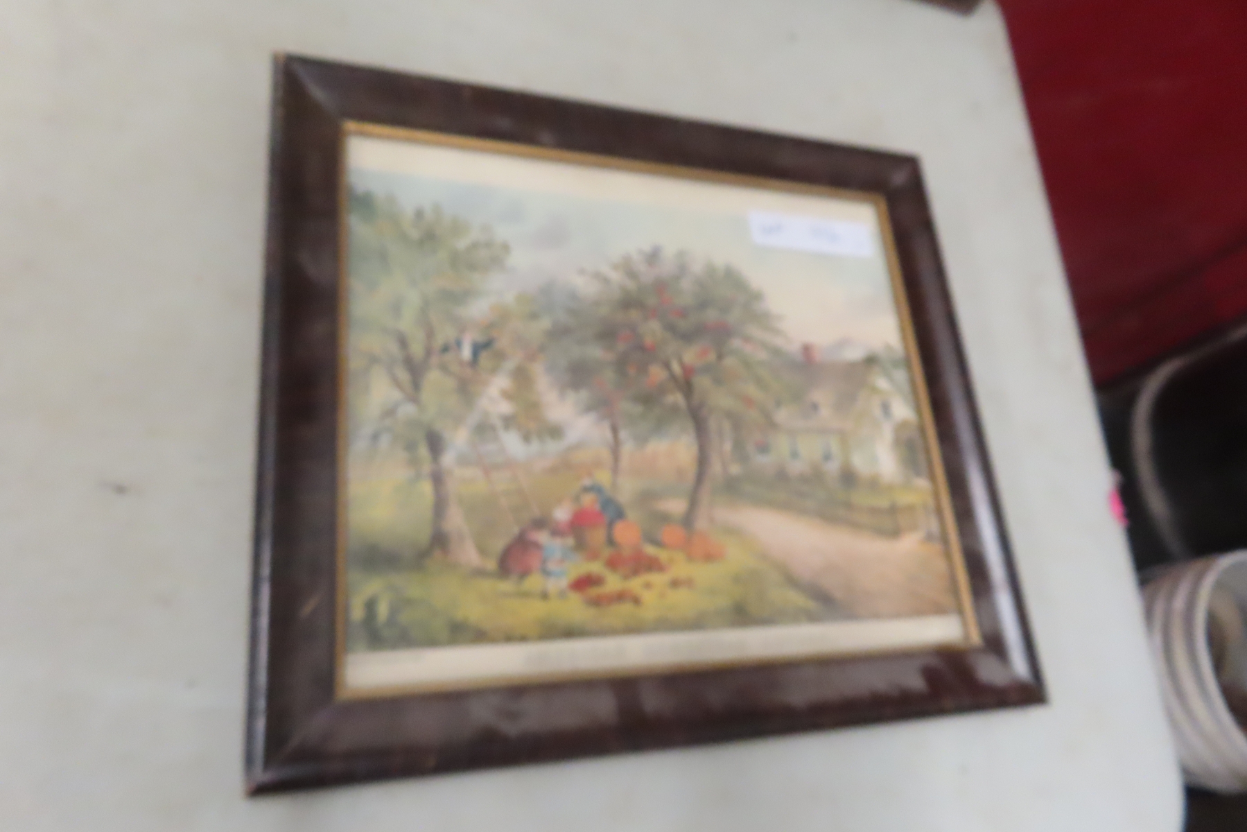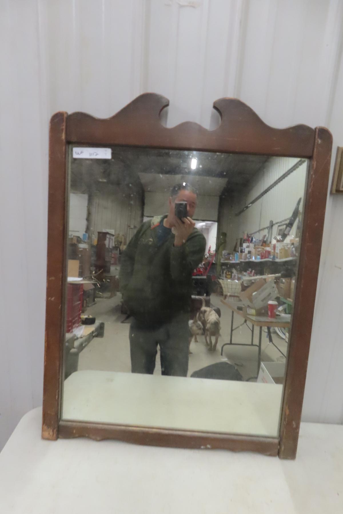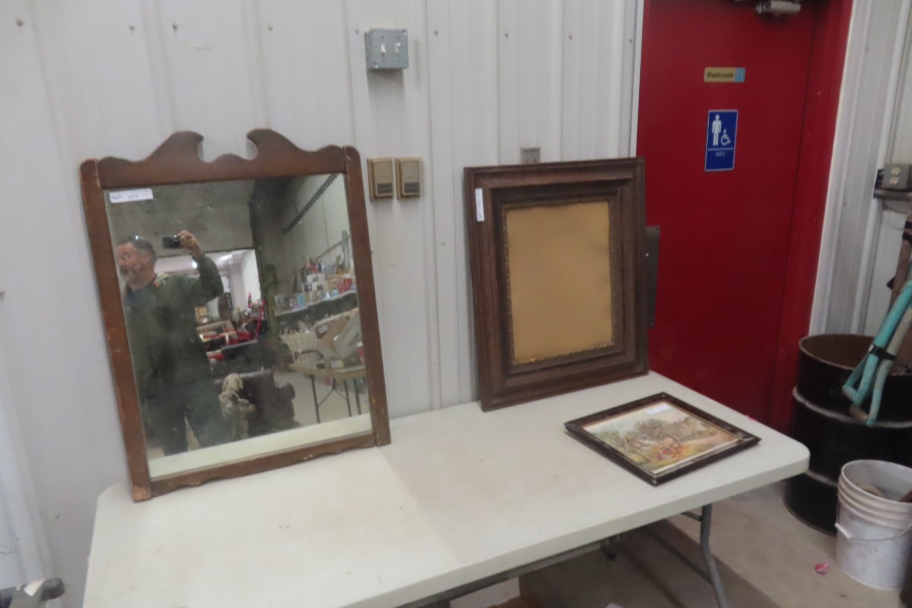 Wood Framed Mirror (27" x 35"), Antique Picture (26" x 30"), and Framed Print (14" x 16")