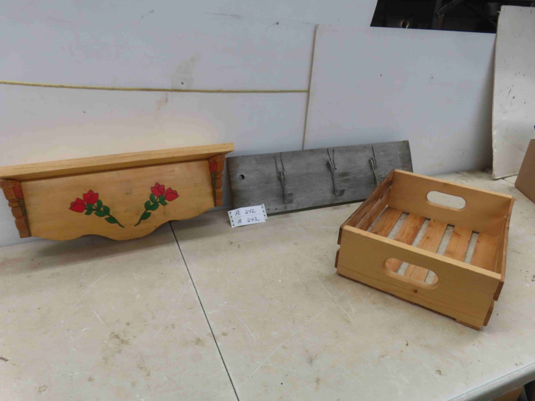 Wood Shelf 20'' x 5 1/2'' x 9'' H , Wood Crate 12'' x 16'' x 5'' , Rustic Coat Rack 24'' L