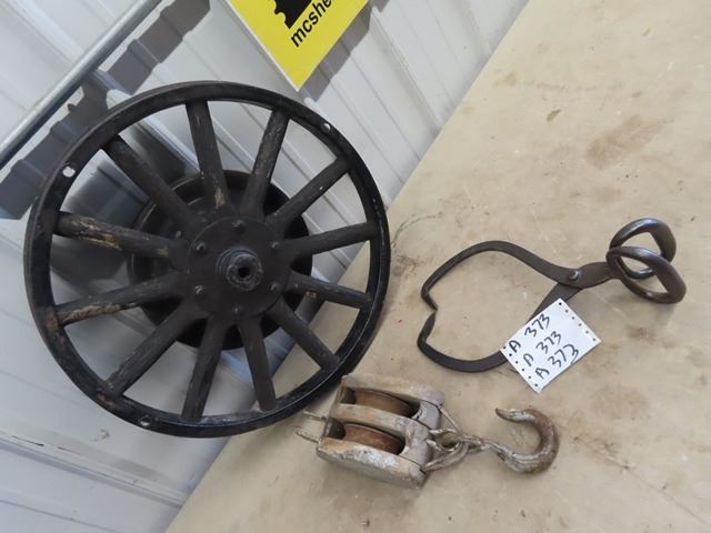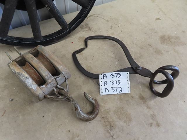 Wood Spoked Auto Rim, Pulley, & Ice Tongs