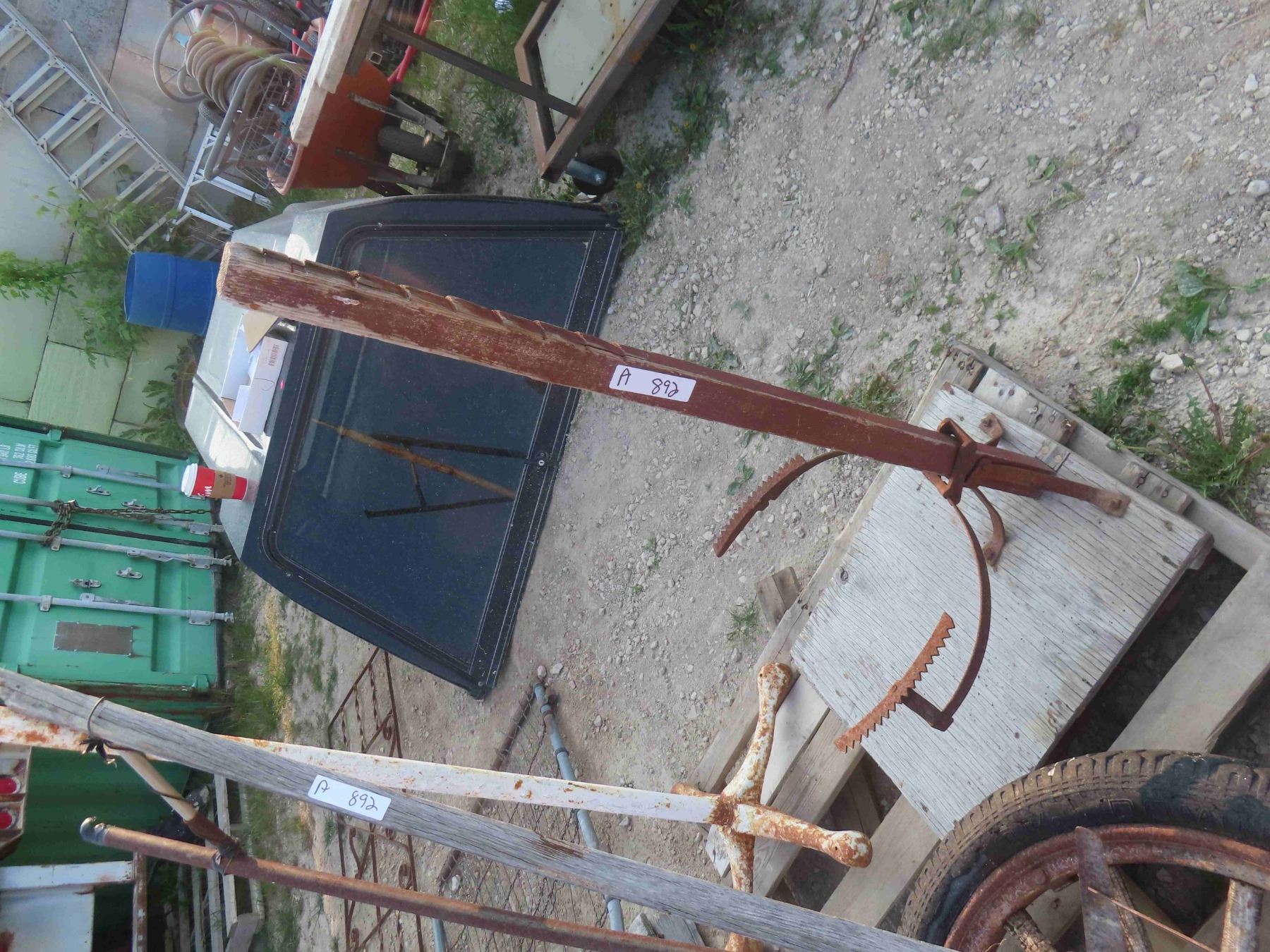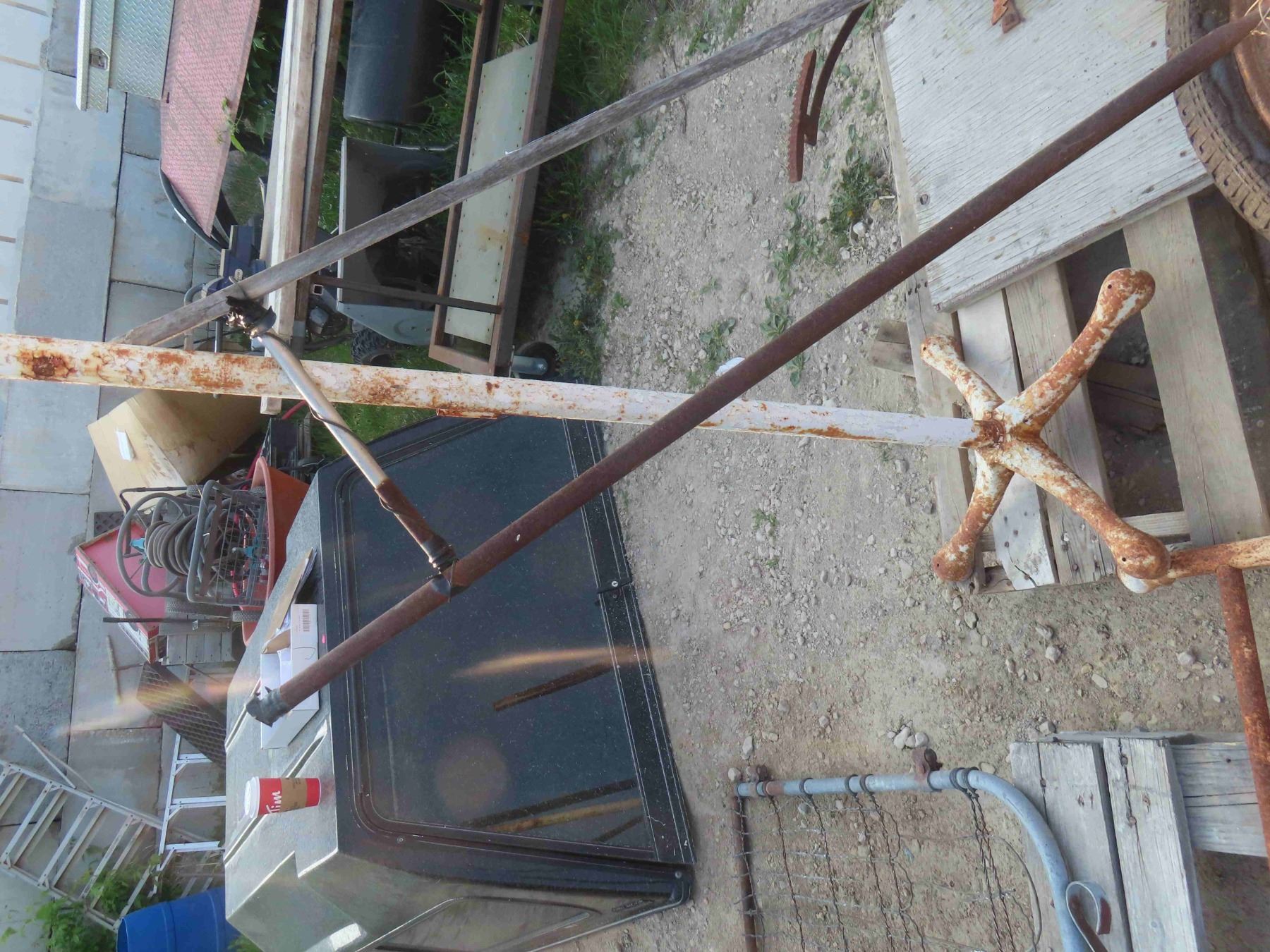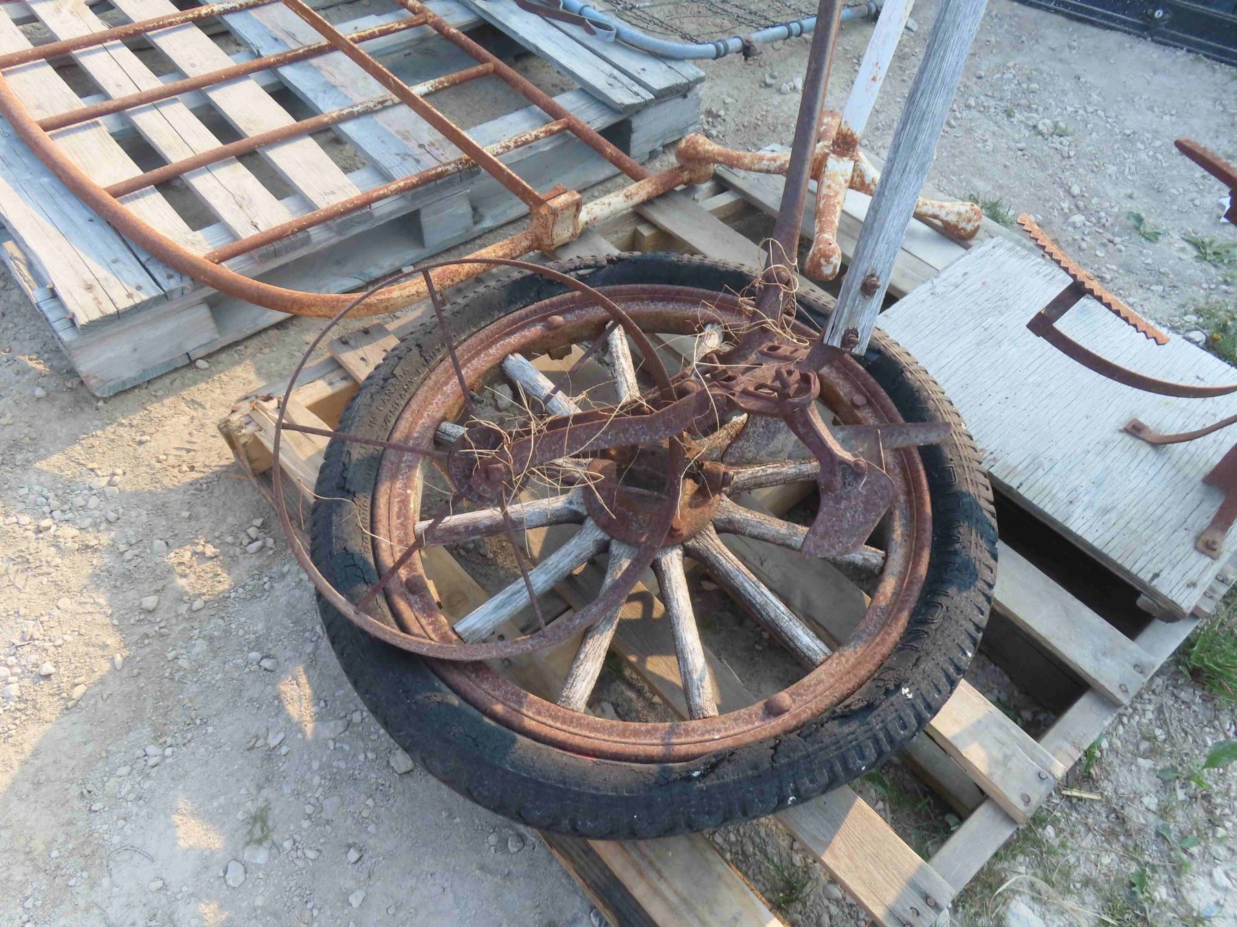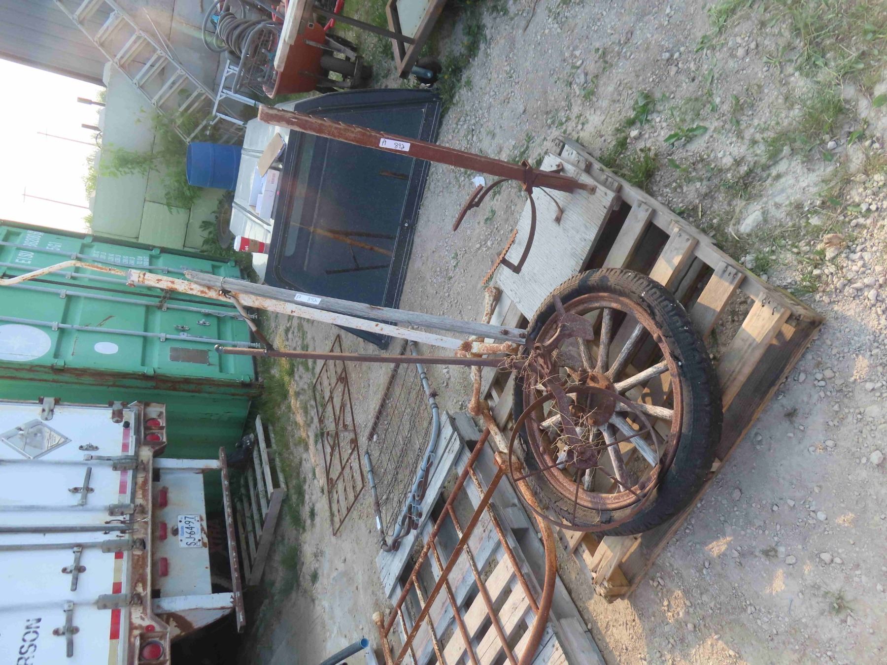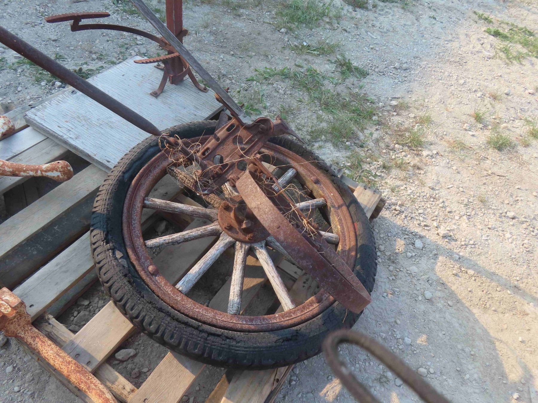 Wood Spoked Wheel, Grain Bag Holder, Old Hospital IV Stand.