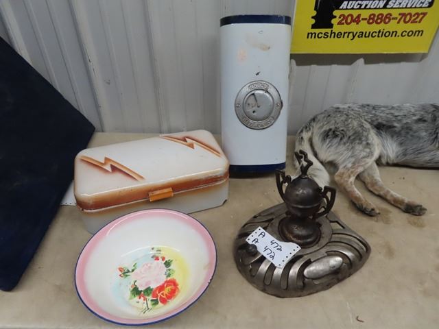 Wood Stove, Nickle Topper Decor, Enamel Hindged Pot, Wash Basin, & Enamel Chimney Cover