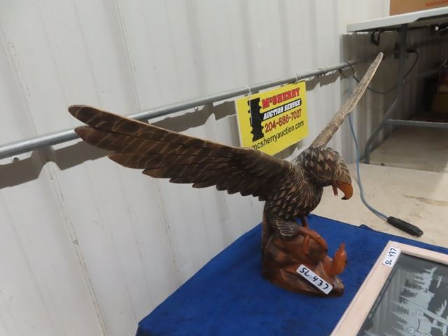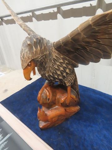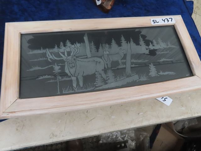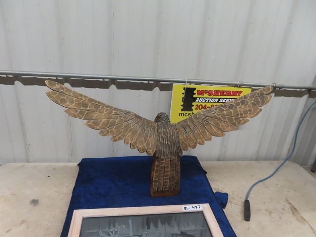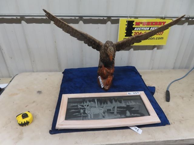 Wooden Carved EAgle 21" H x 36" Wing Span & Elk Etching Picture on Glass