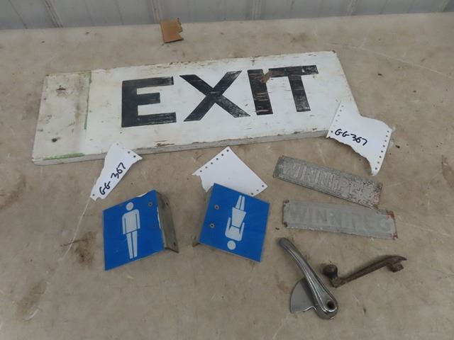 Wooden Exit Sign, Small Fiberglass Washroom Sign, Auto Door Window Crank Handle, Winnipeg Insurance Decal