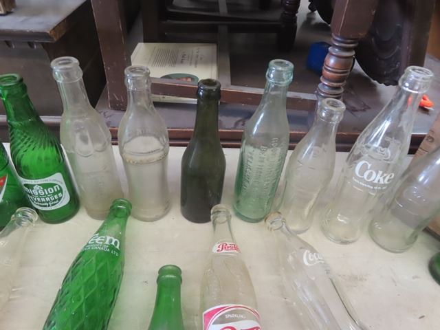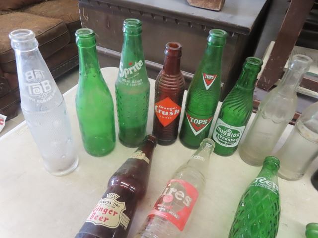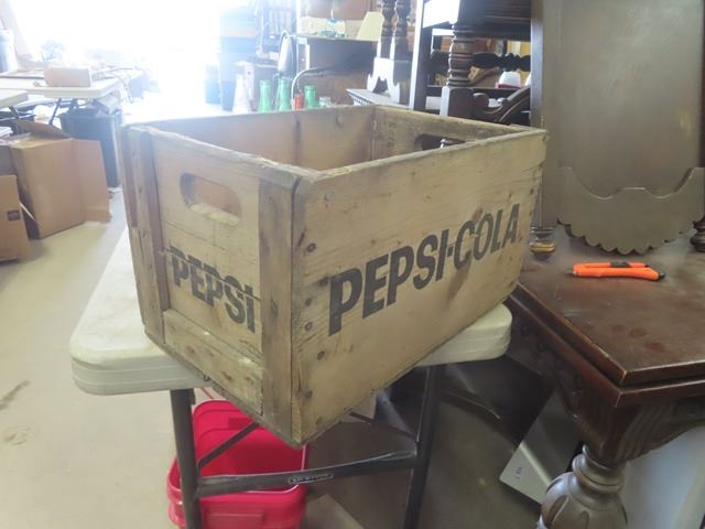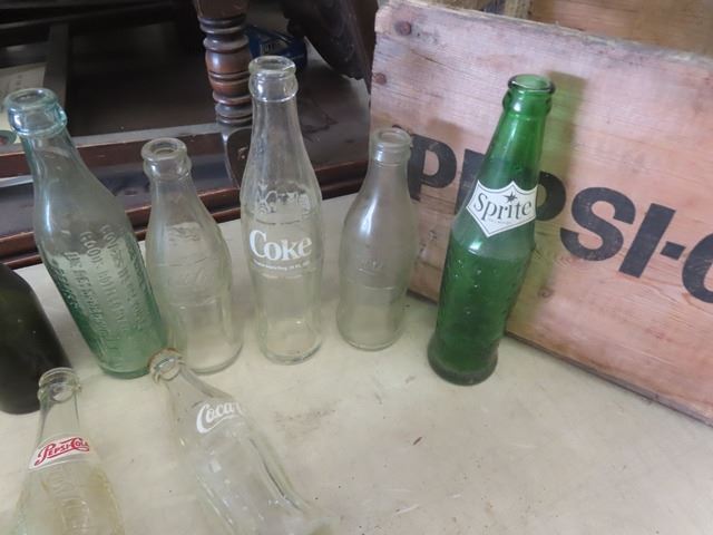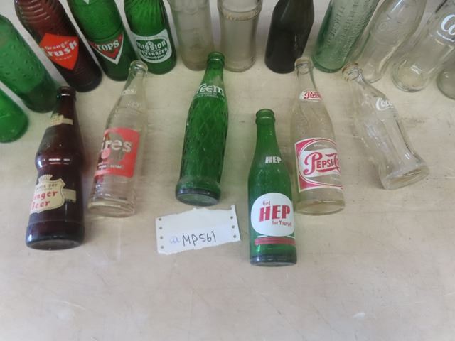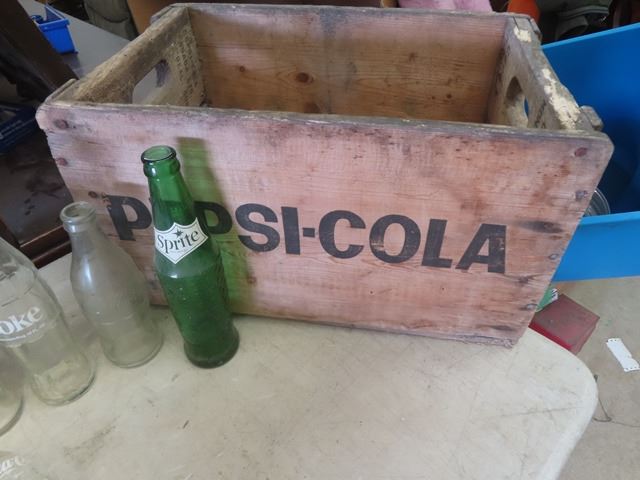 Wooden Pepsi Crate + 20 Misc. Pop Bottles: Orange Crush, Coke, Tops, Mission, Hep plus more