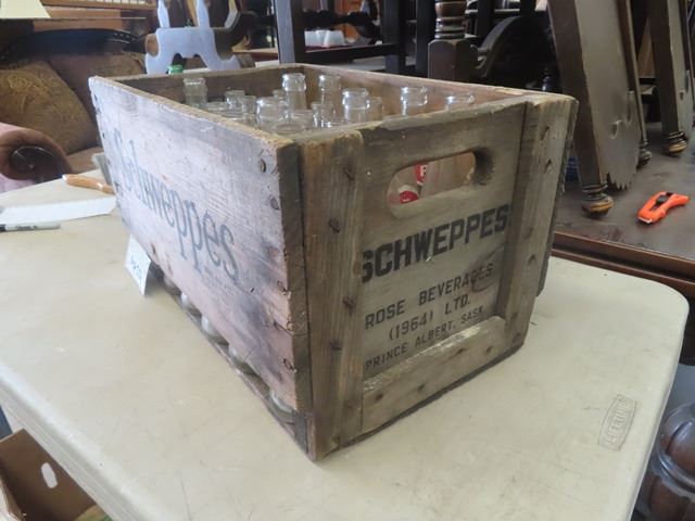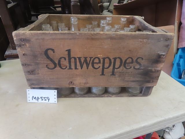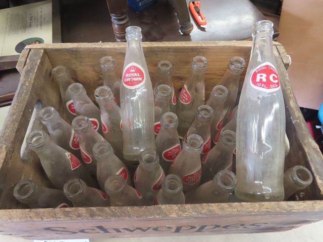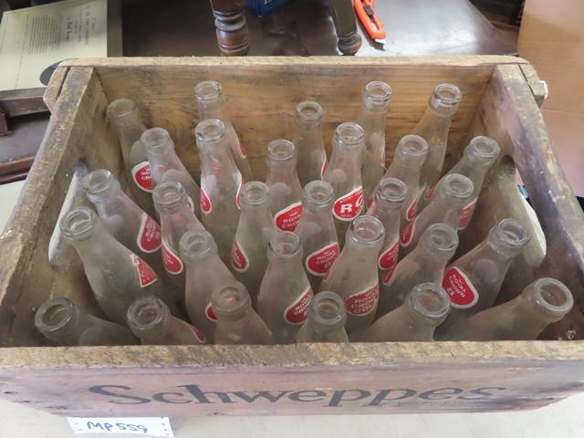 Wooden Schweppes Crate with 29 Royal Crown Cola Bottles ; 8oz + 10oz