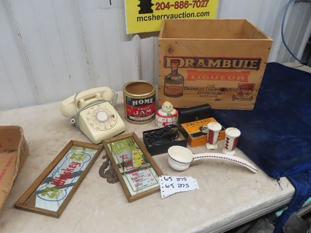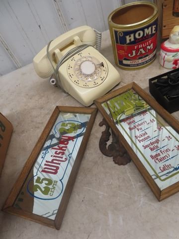 Wooden Whiskey Crate, Rotary Telephone, Packard Shovel, Mirrored Advertising plus more