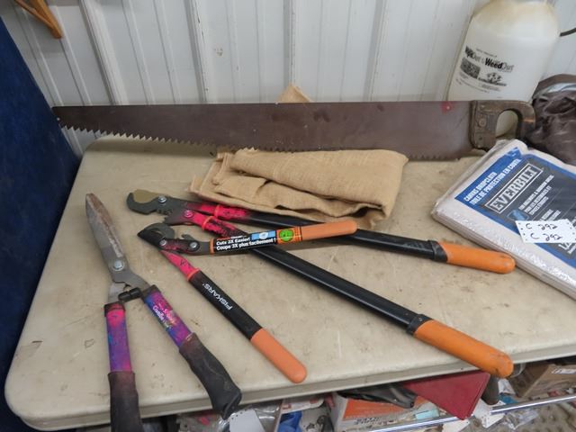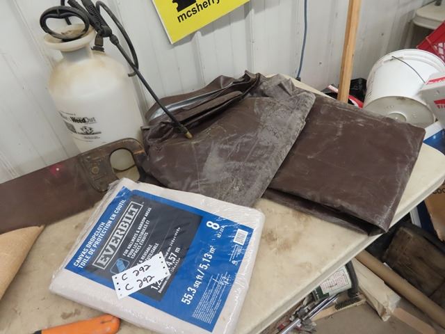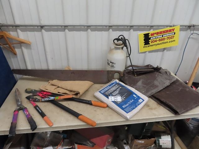 Yard Hedgers, Pruners, Old Saw, Bottle Sprayer Paint Drop & 2 Tarps
