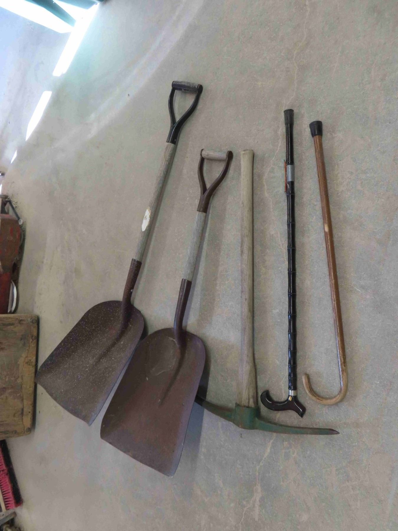 Yard Tools : 2 Scoop Shovels , Axe , 2 Wood Canes