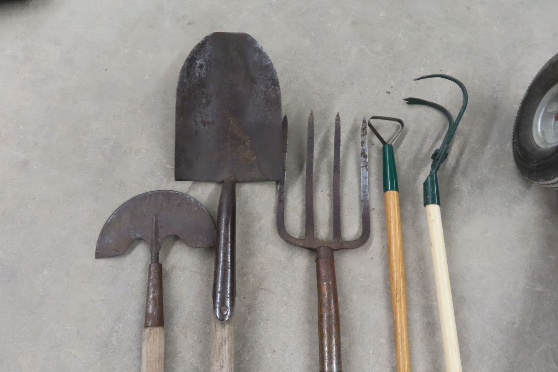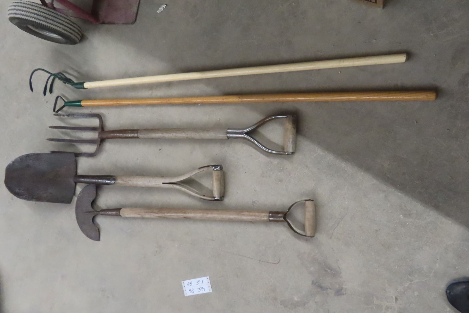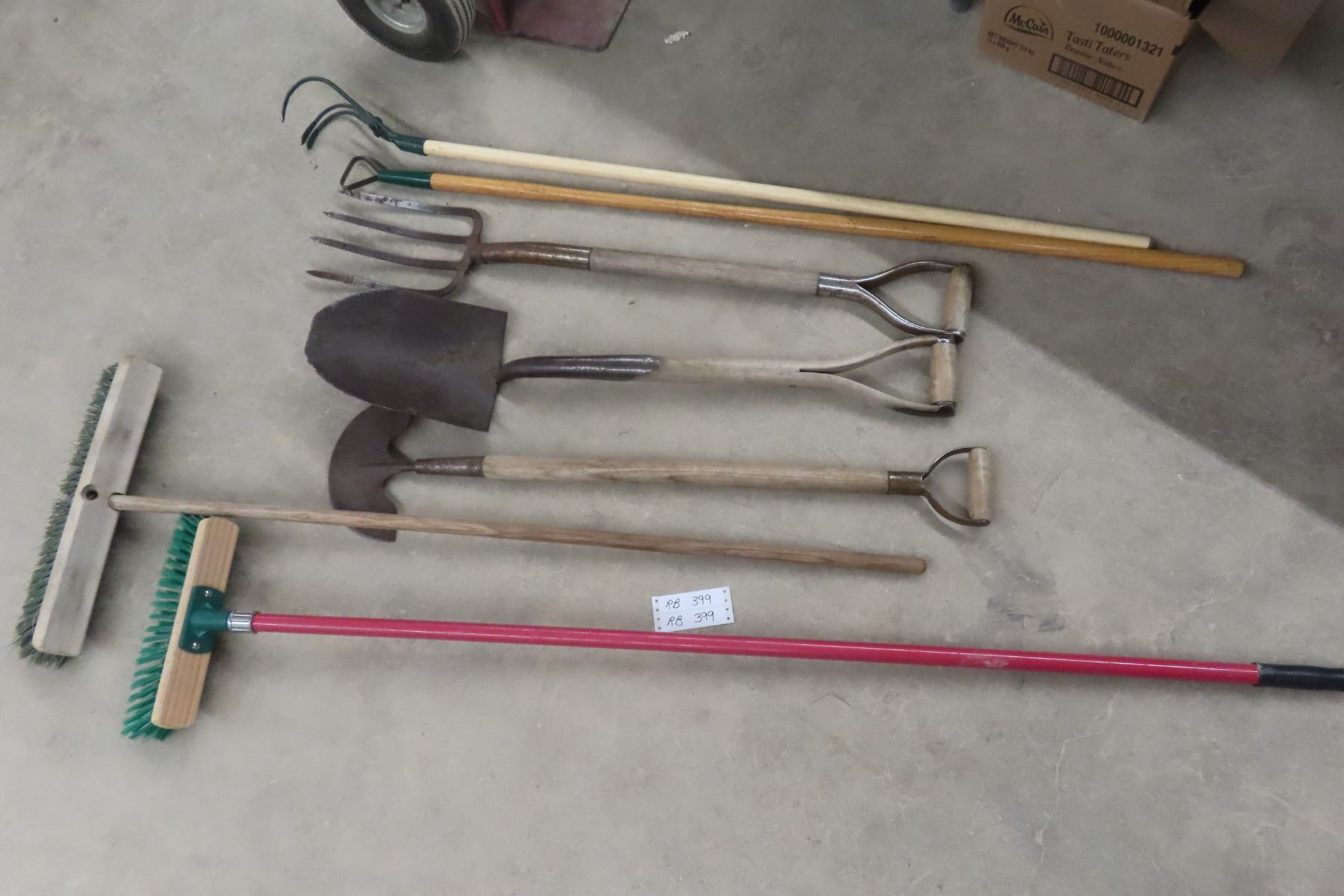 Yard Tools: Potato fork, Edger, Spade, Hoe + Brooms