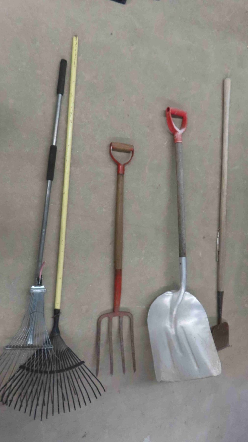 Yard Tools: Rakes, Scoop, Shovel, Pitch Fork