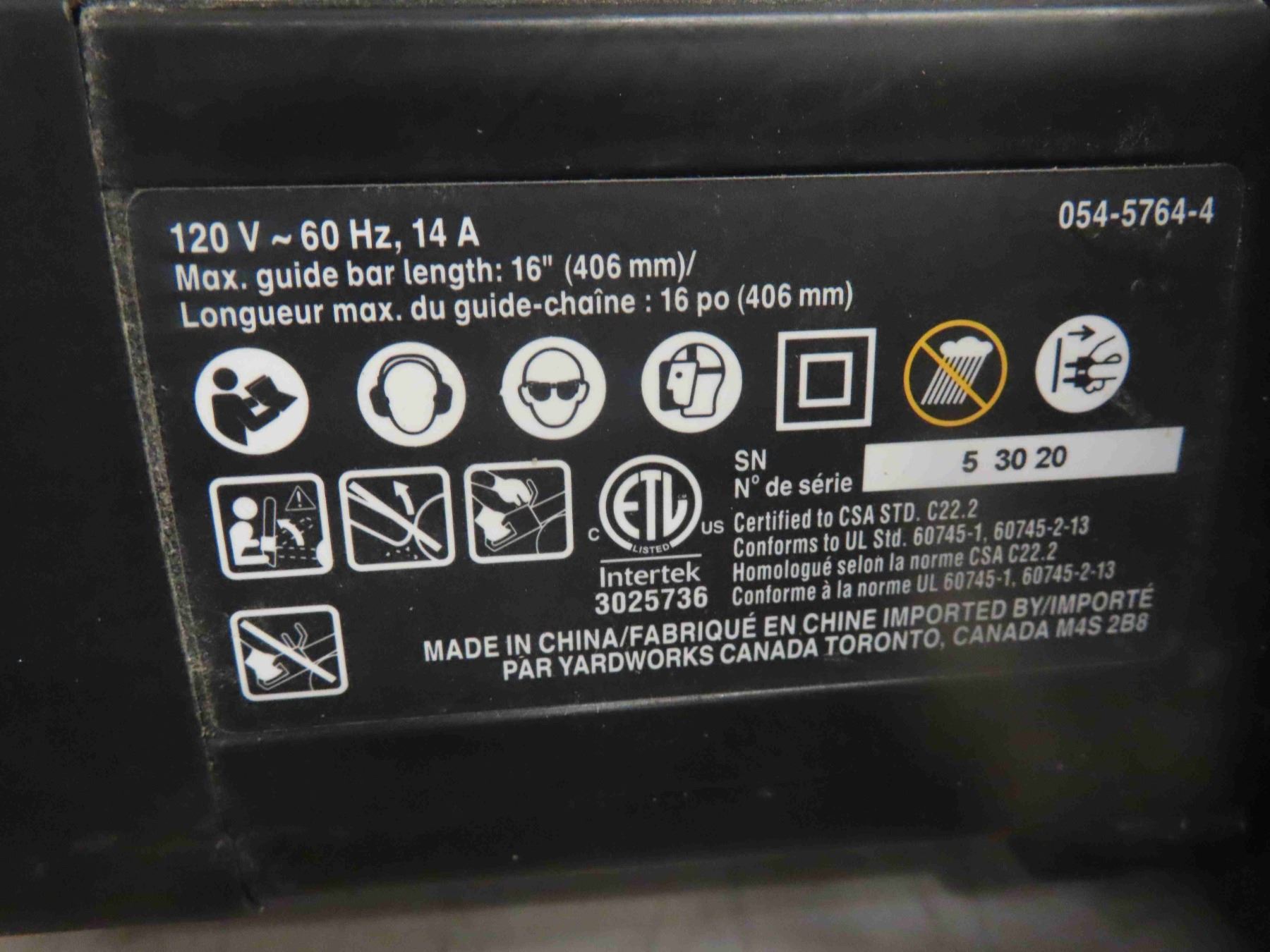 Yardworks 14A 16'' Electric Chainsaw