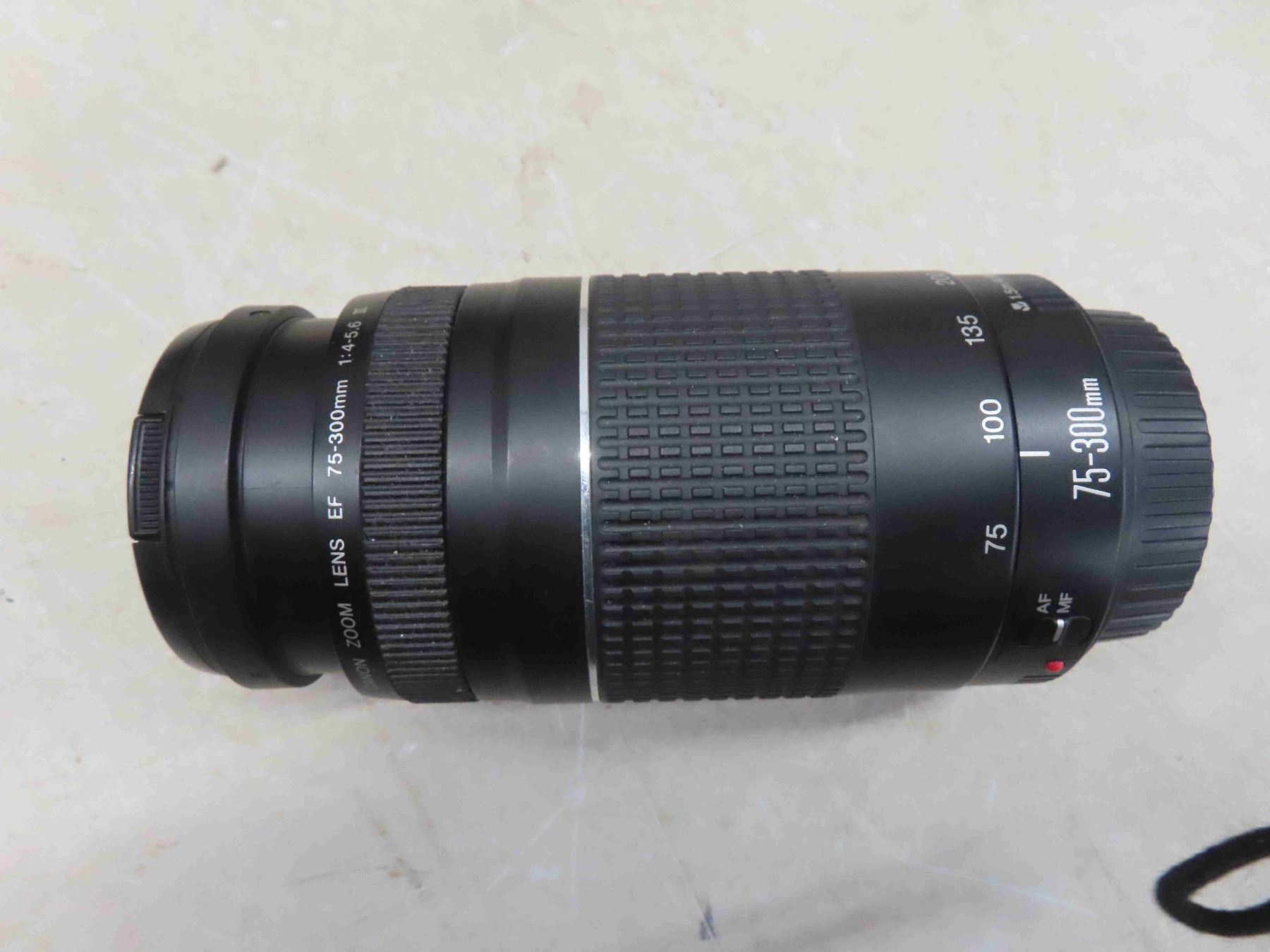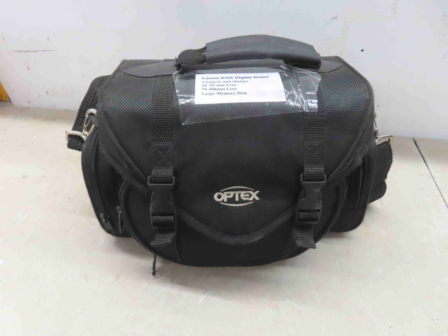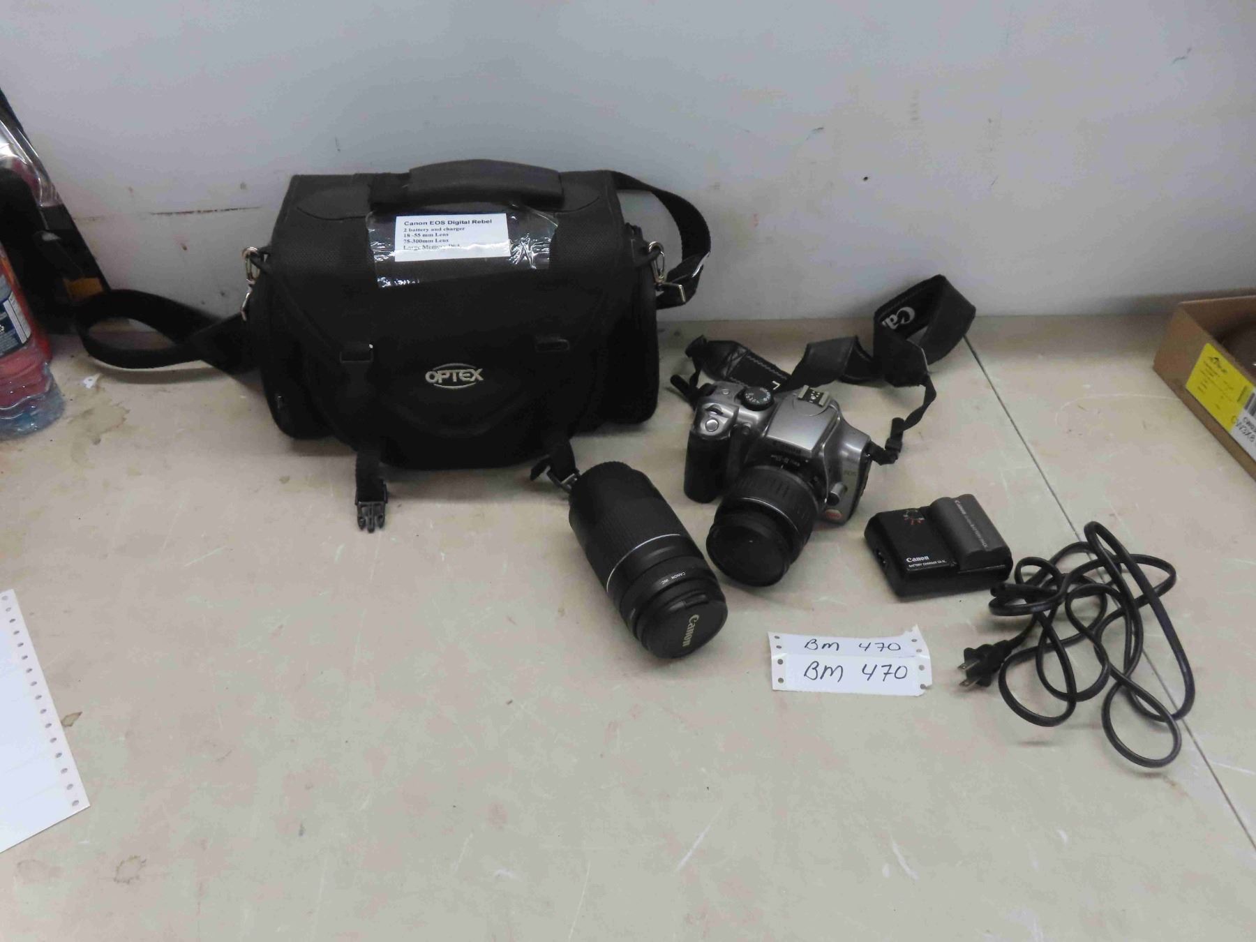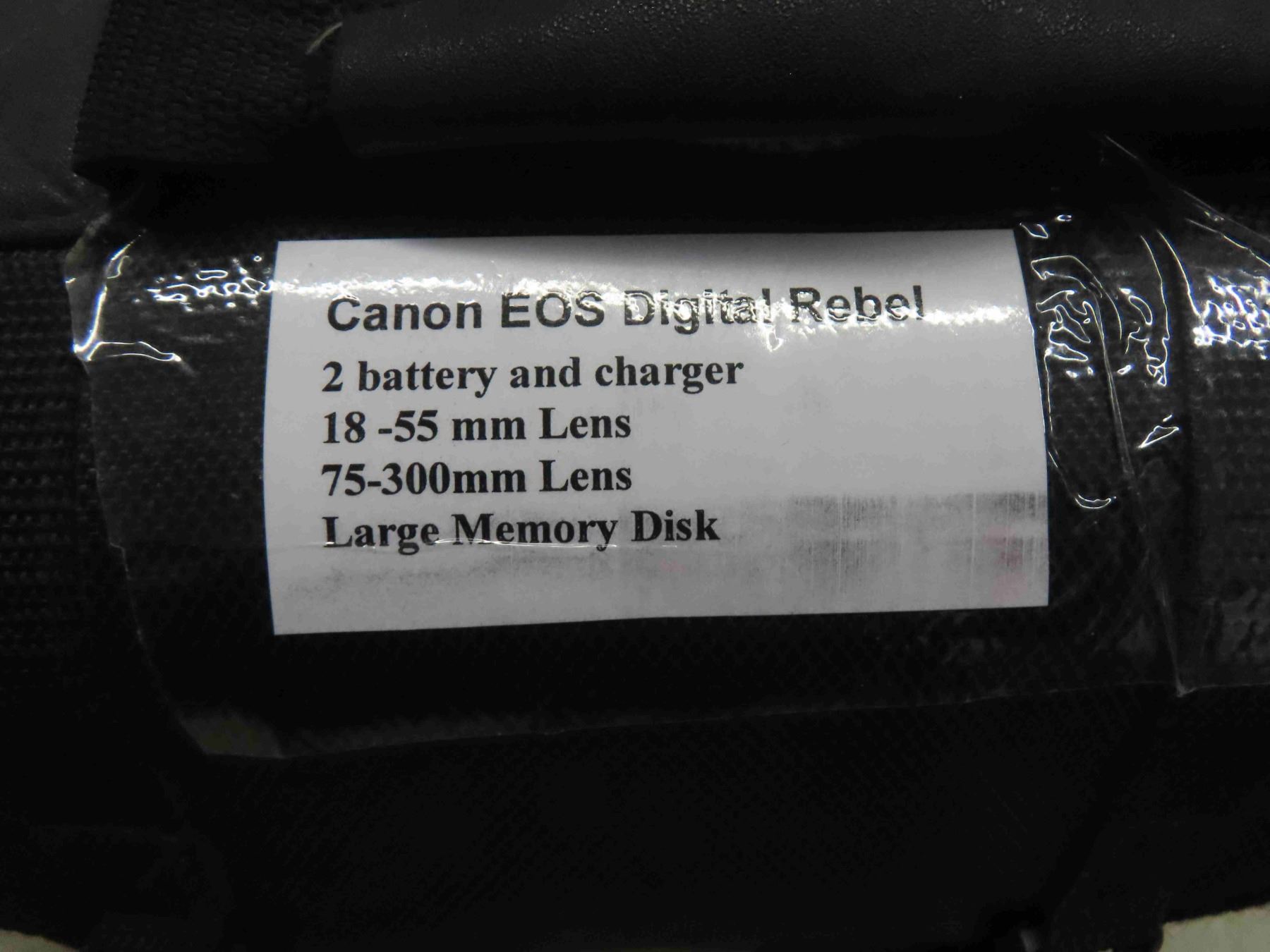 canon EOS digital rebel with 2 batteries, charger, 15-55mm lens, 75-300mm lens, memory disc, and cast