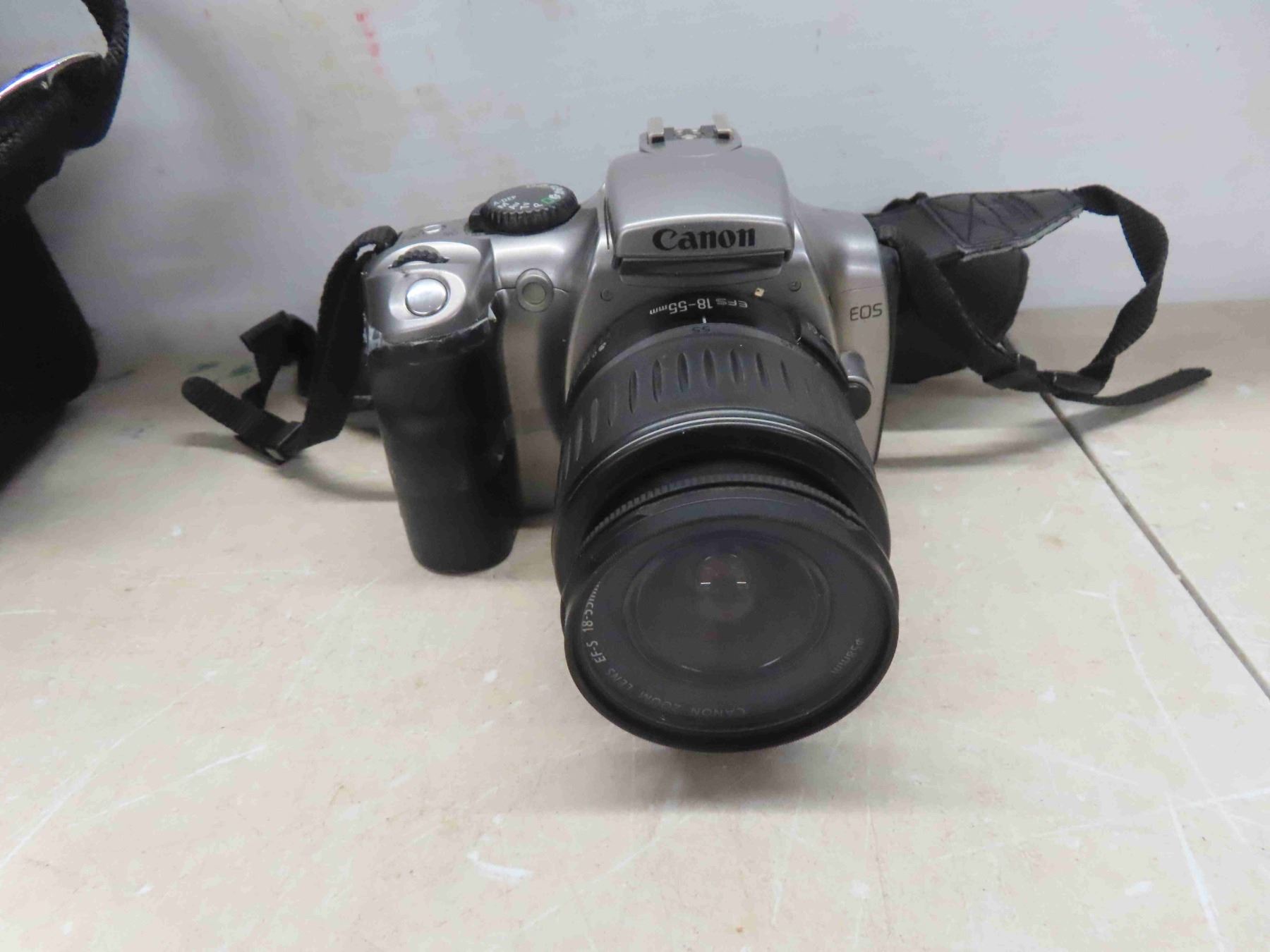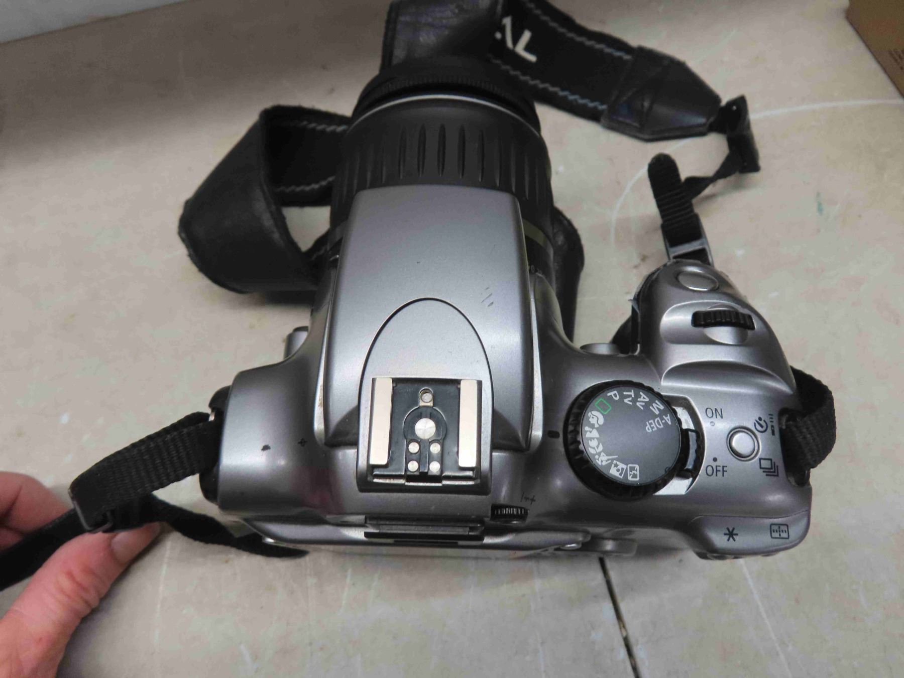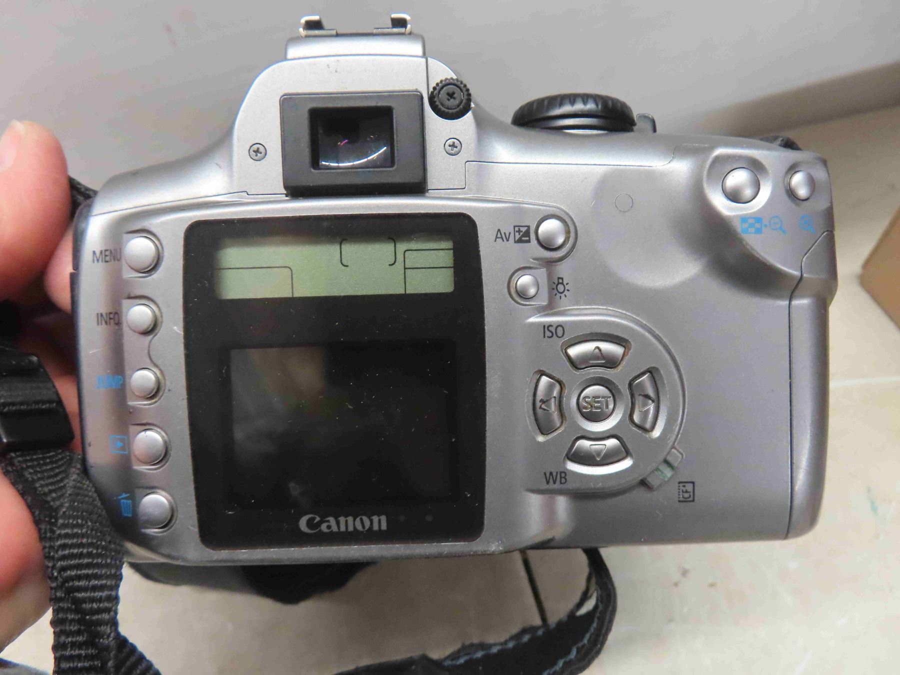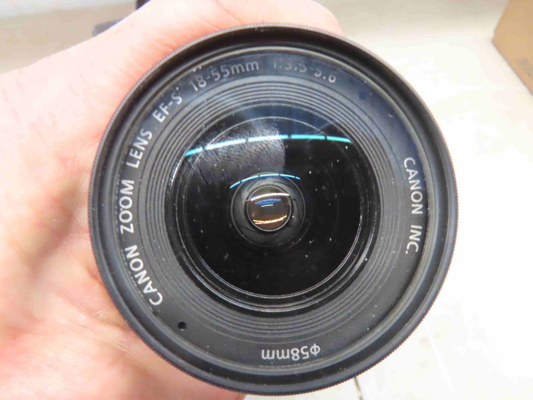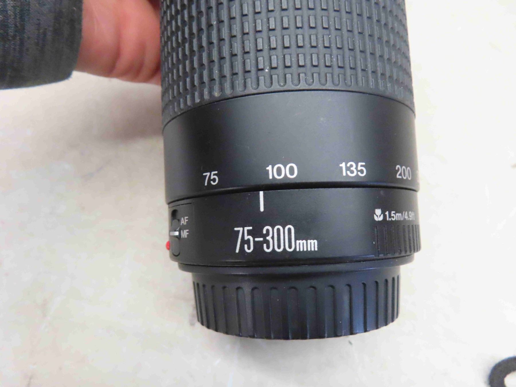 canon EOS digital rebel with 2 batteries, charger, 15-55mm lens, 75-300mm lens, memory disc, and cast