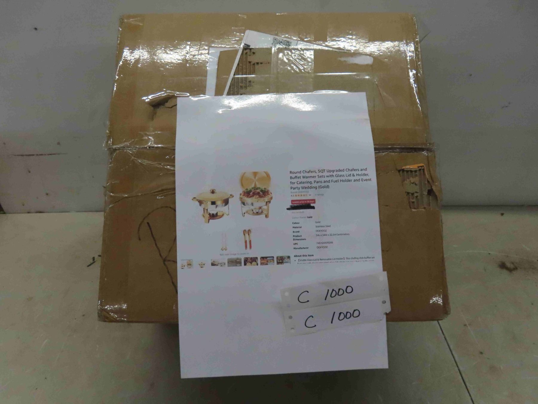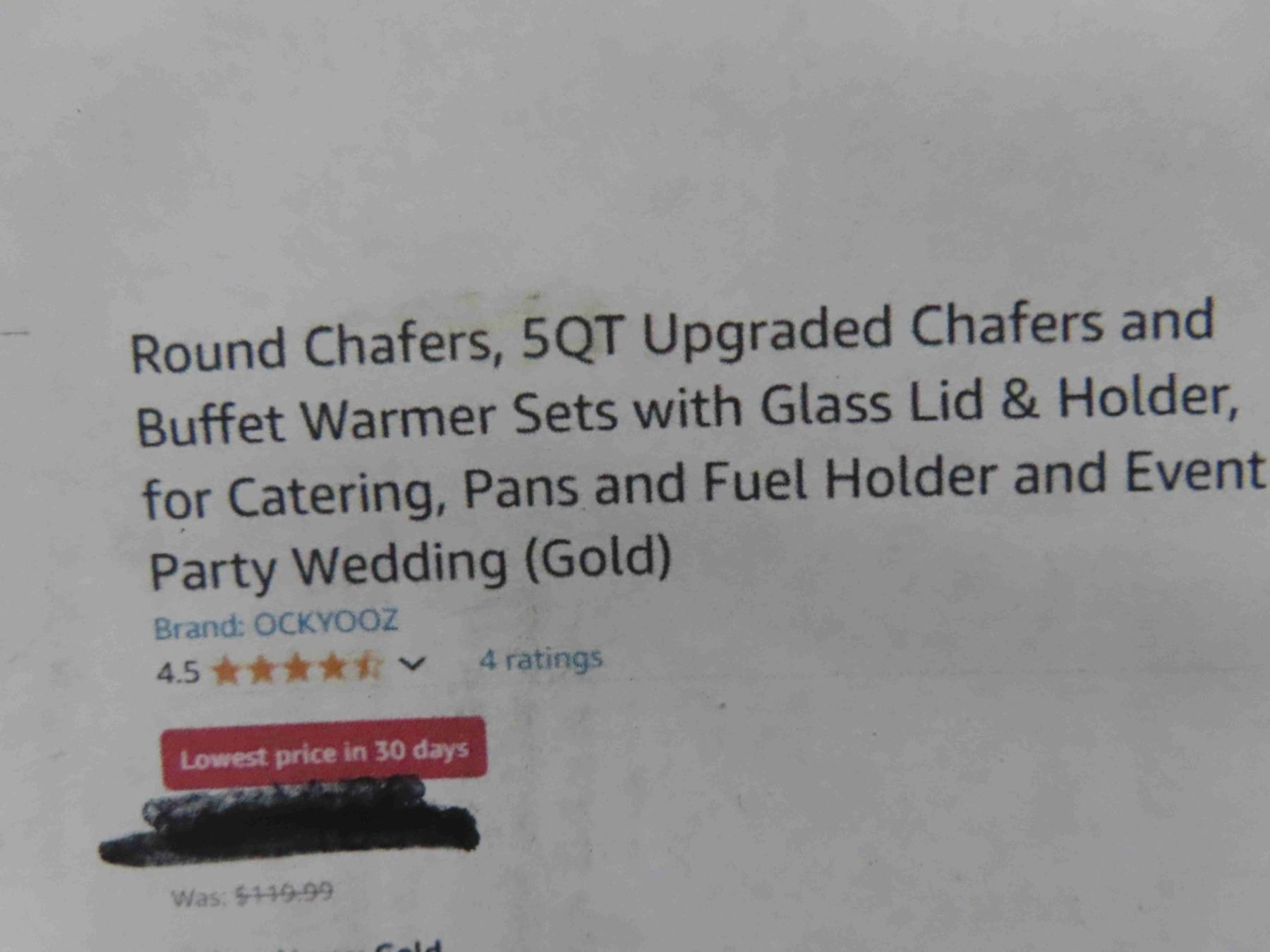 chafing dish buffet set 2 pack stainless stee; round chafers 5QT upgraded chafers and buffet warmer sets with glass lid & holder, for catering, pans and fuel holder and event party wedding (gold) New or Store Return