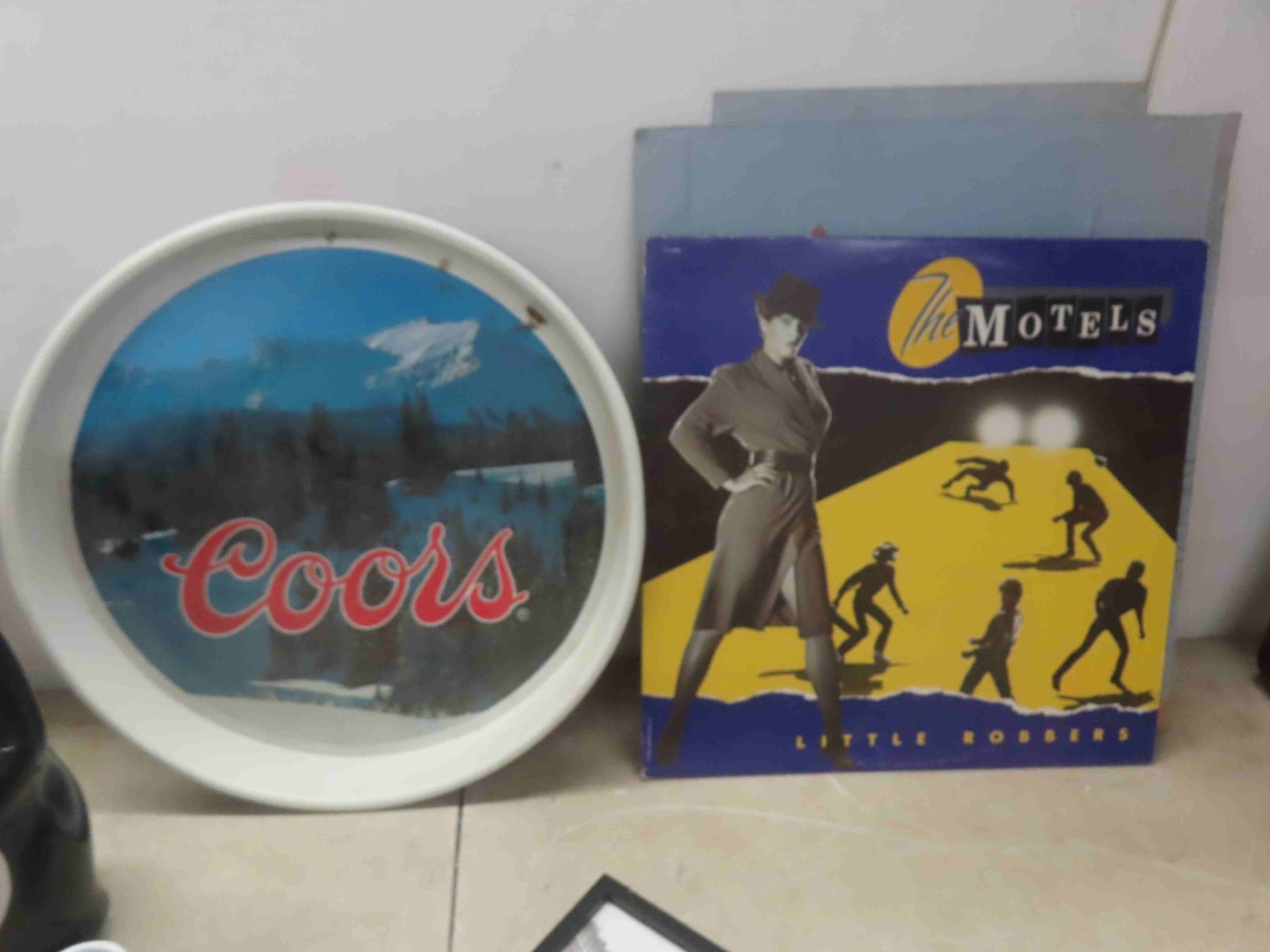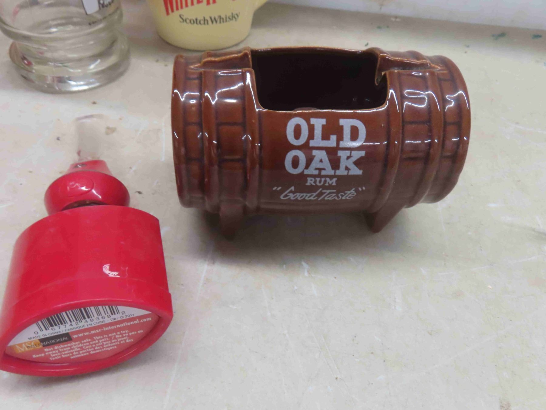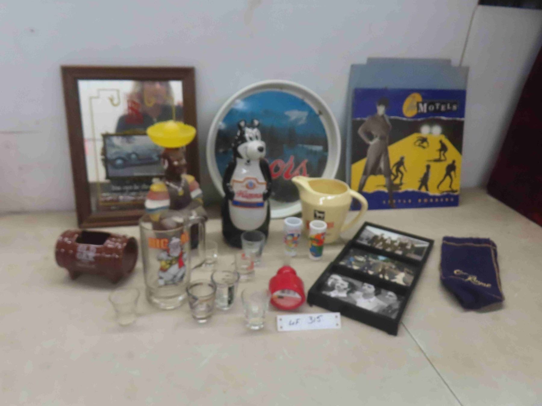 decantors, shot glasses, old oak rum ash tray, beatles pictures, mirrored RR sign