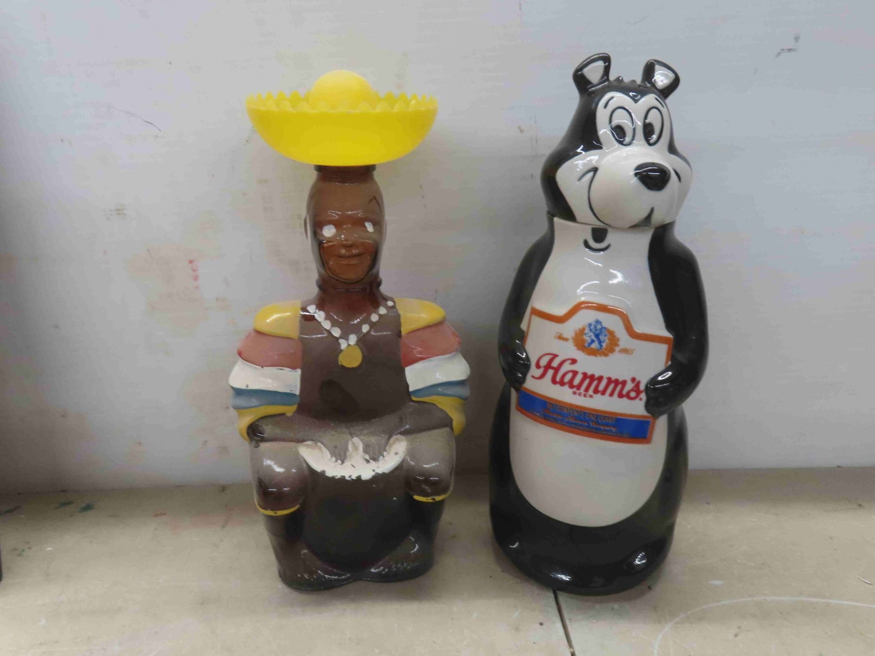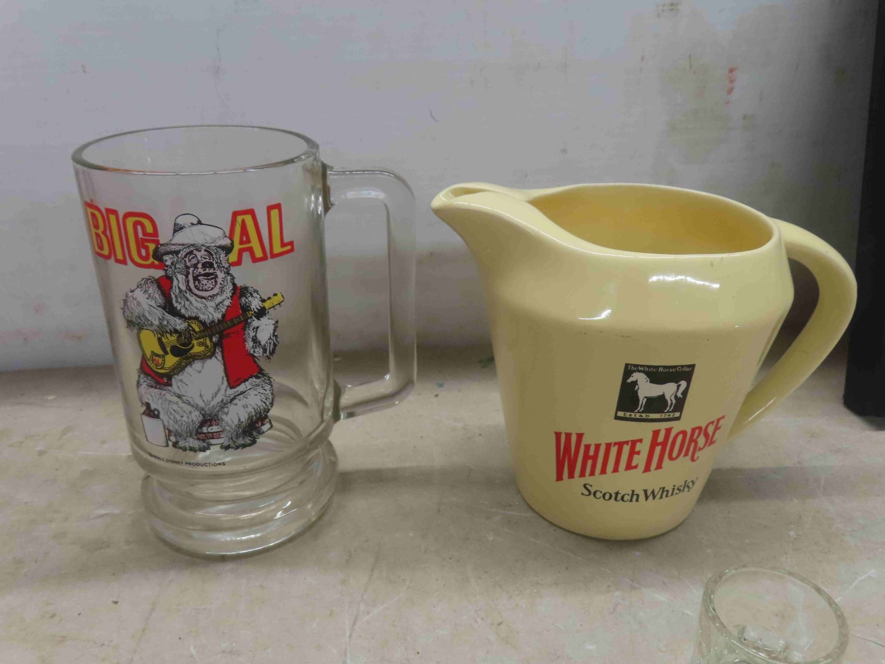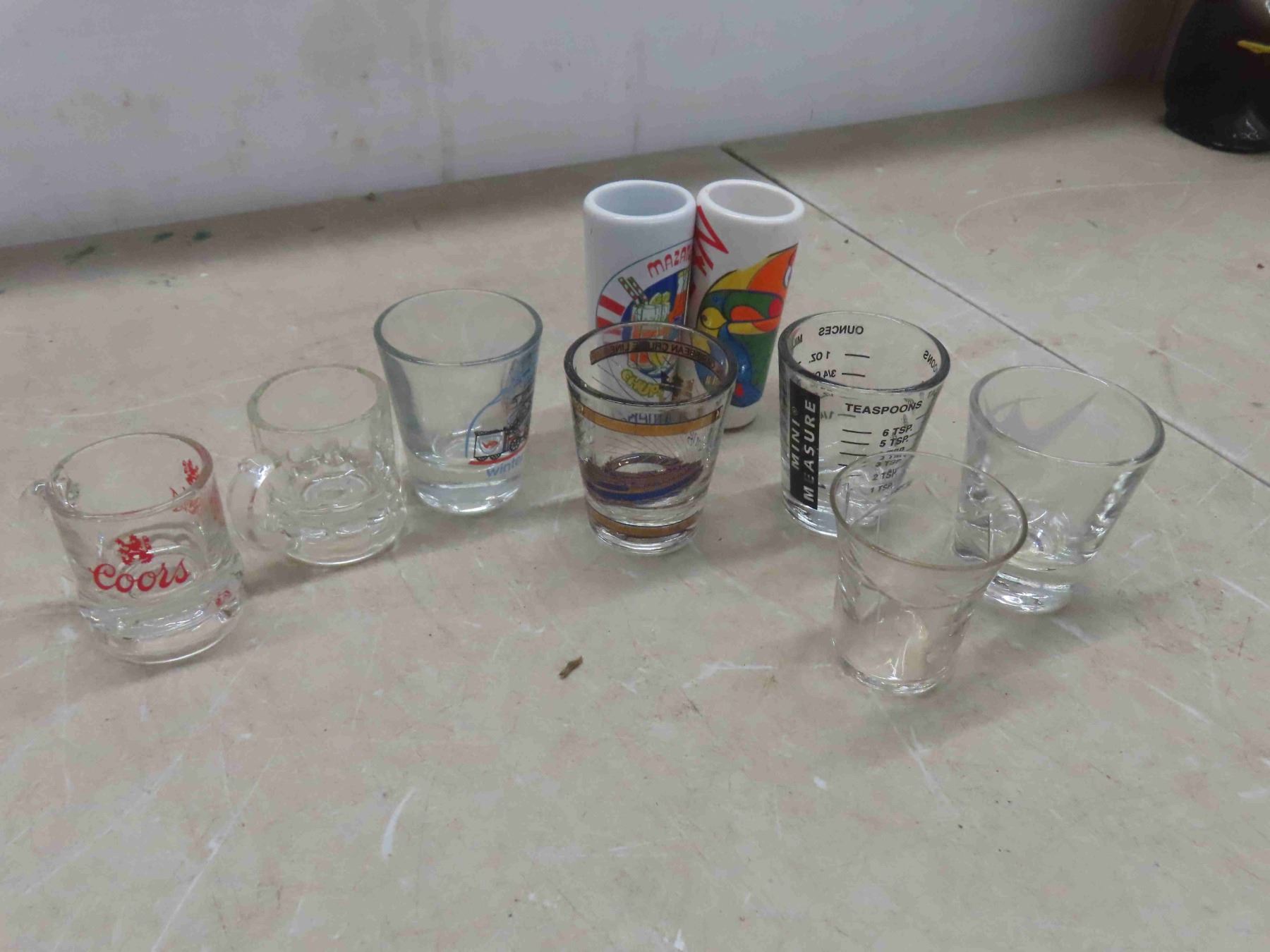 decantors, shot glasses, old oak rum ash tray, beatles pictures, mirrored RR sign