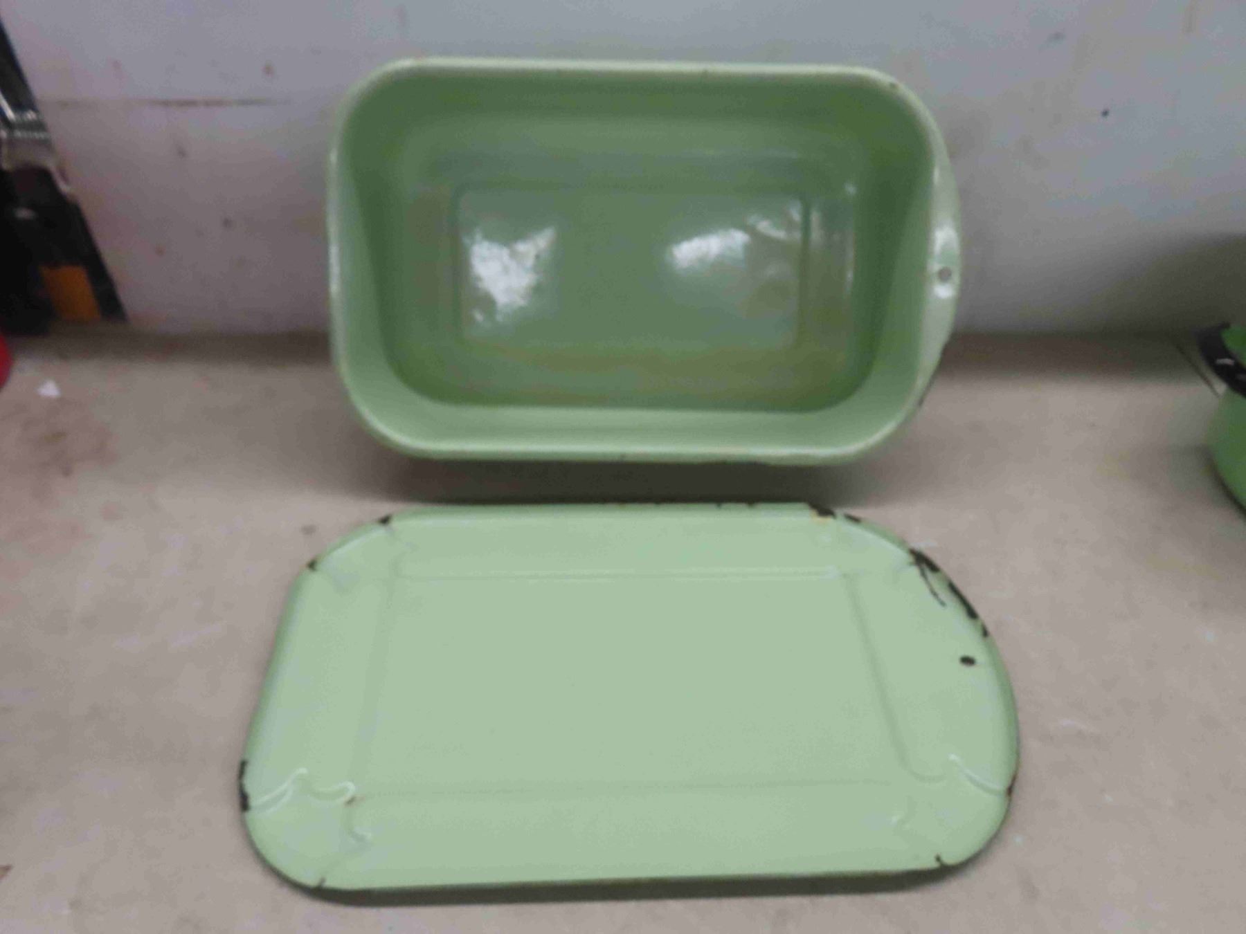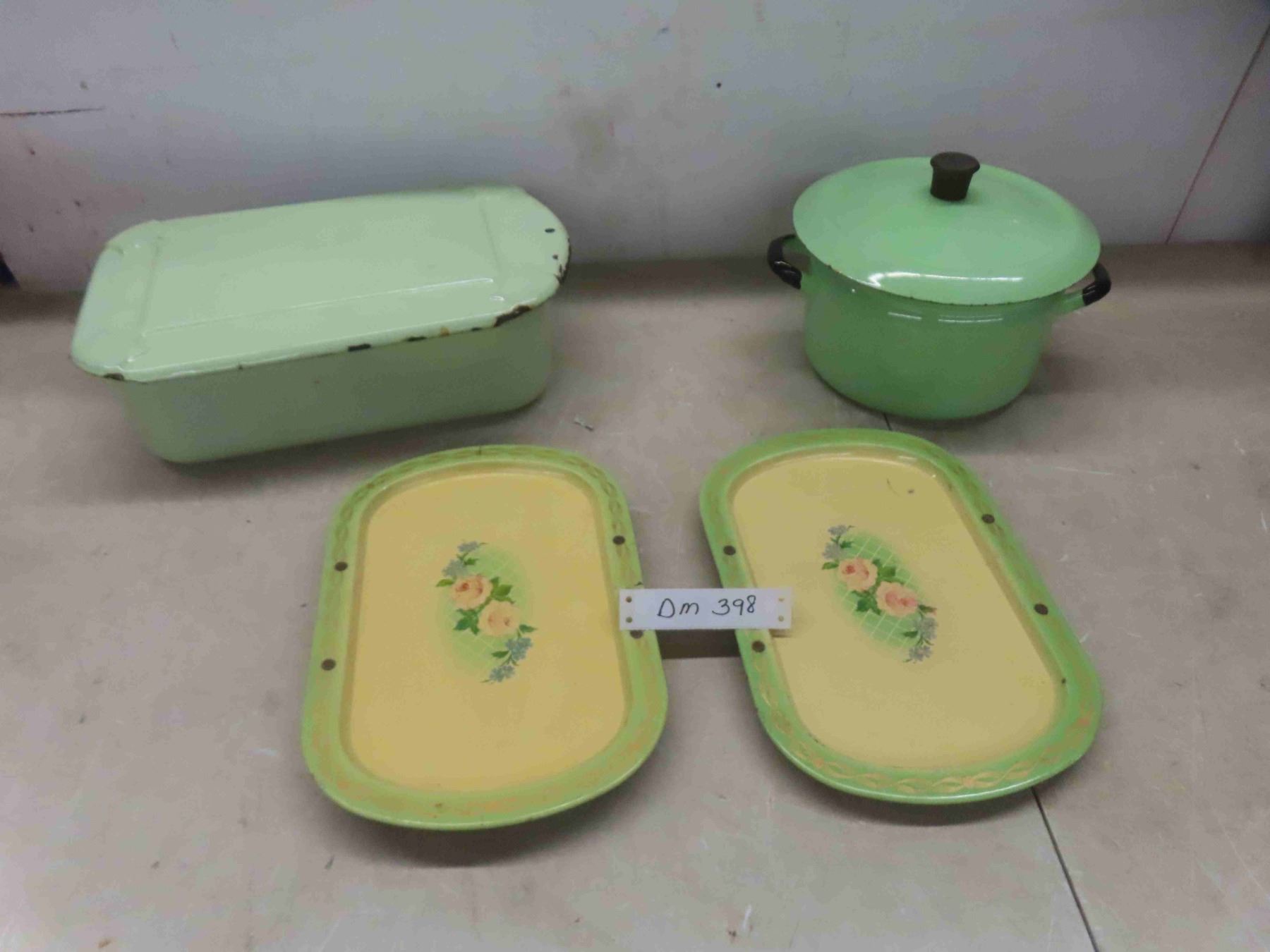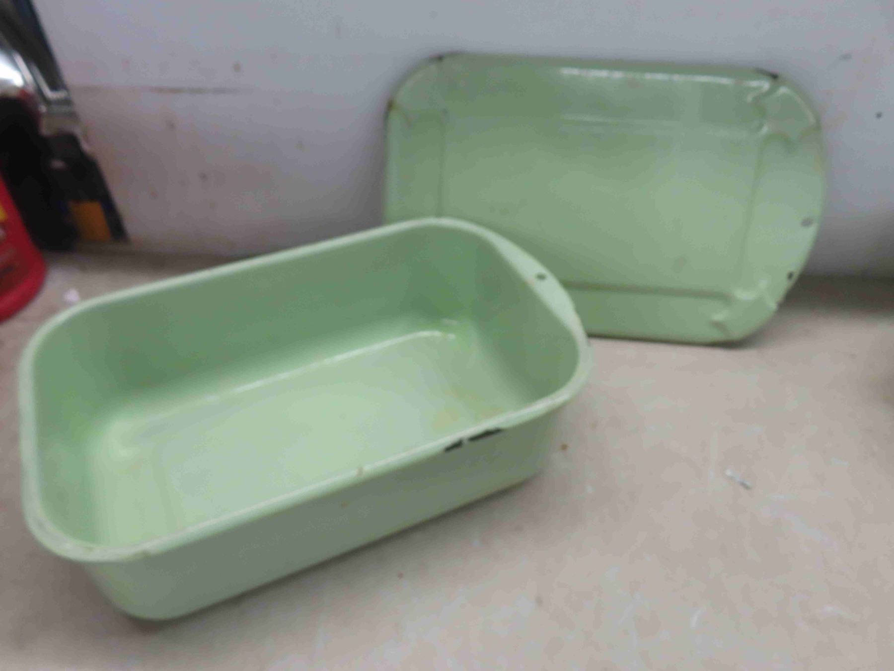 enamelware: refridgerator container with lid, arm rest tv trays with spring action hold