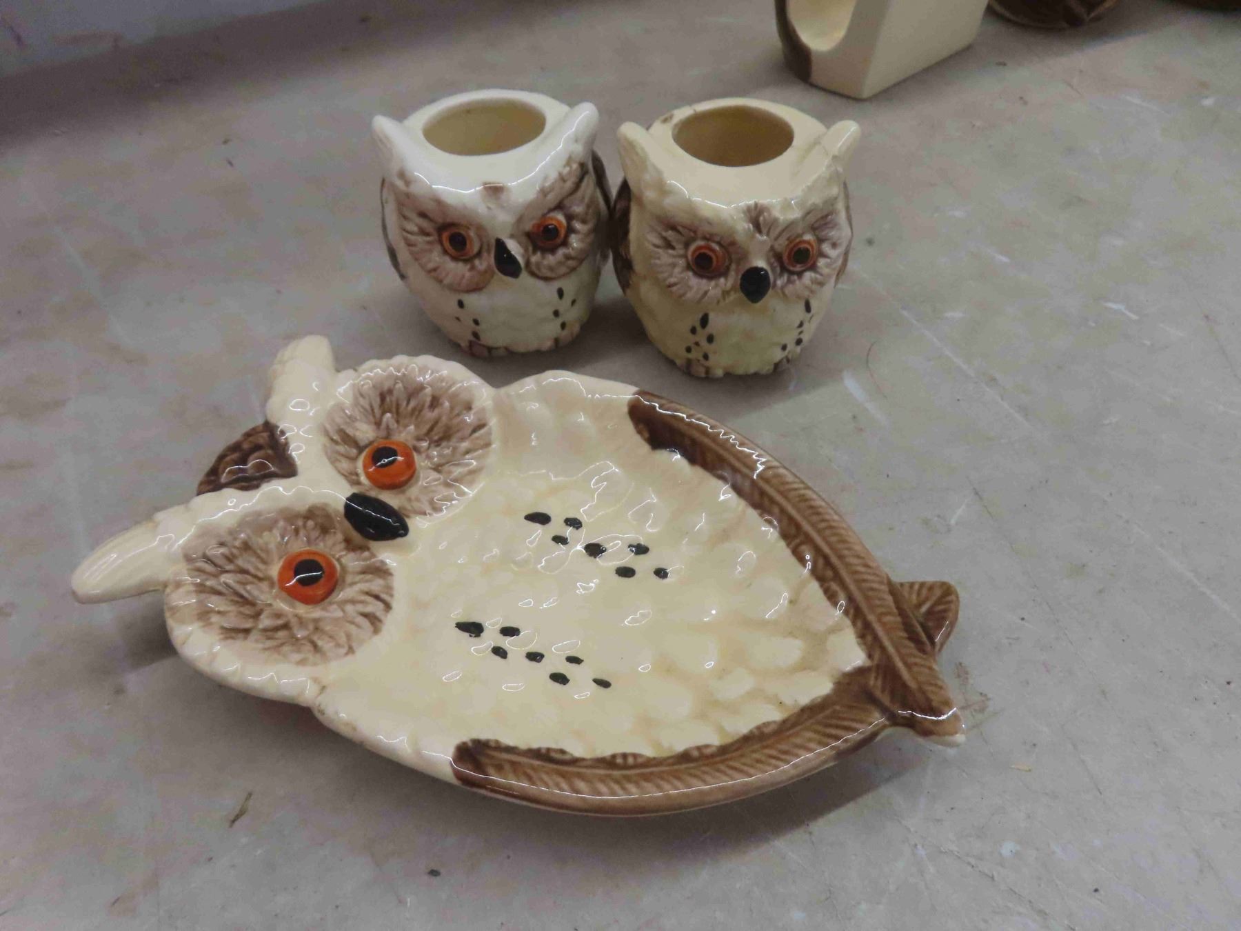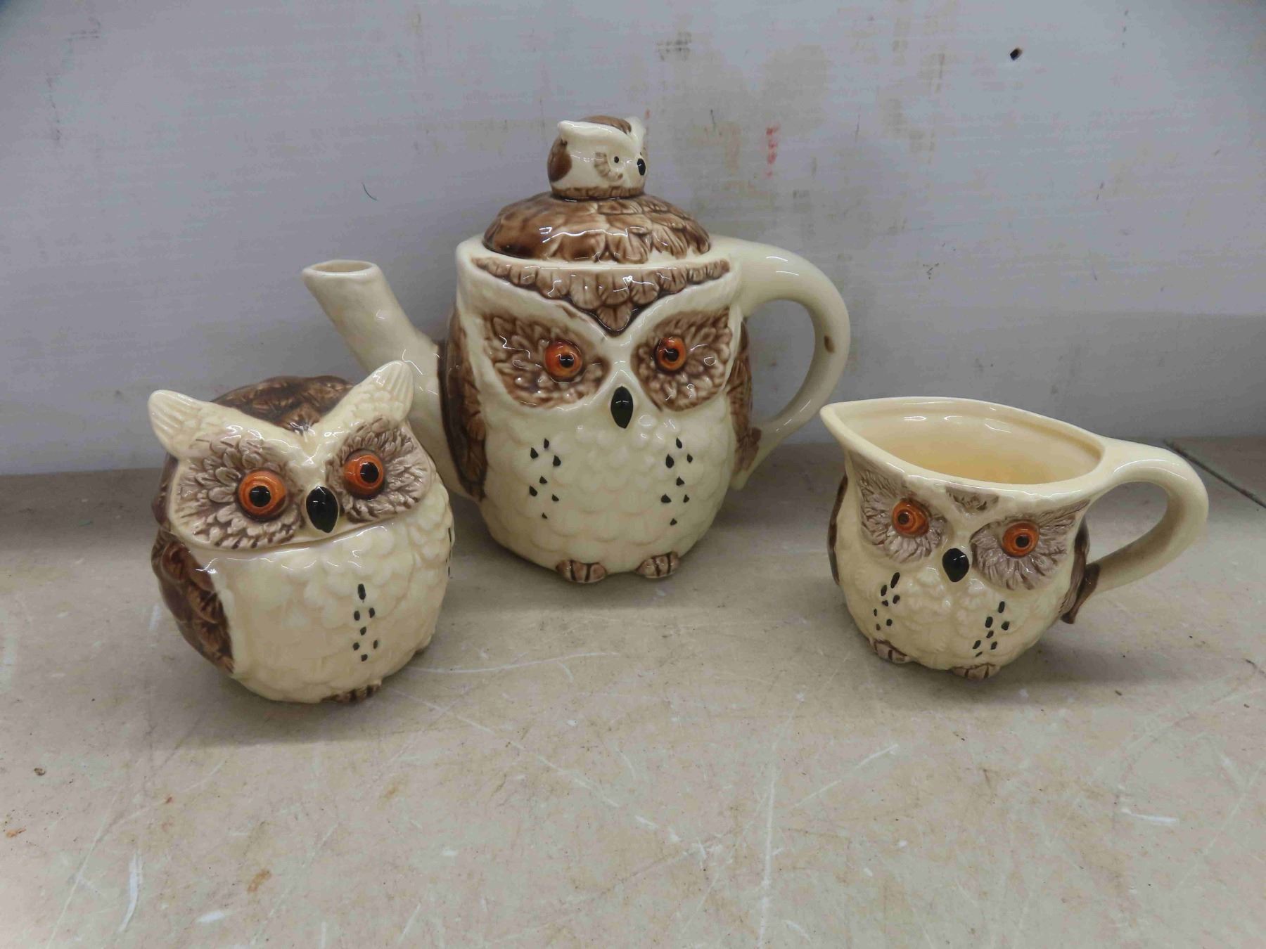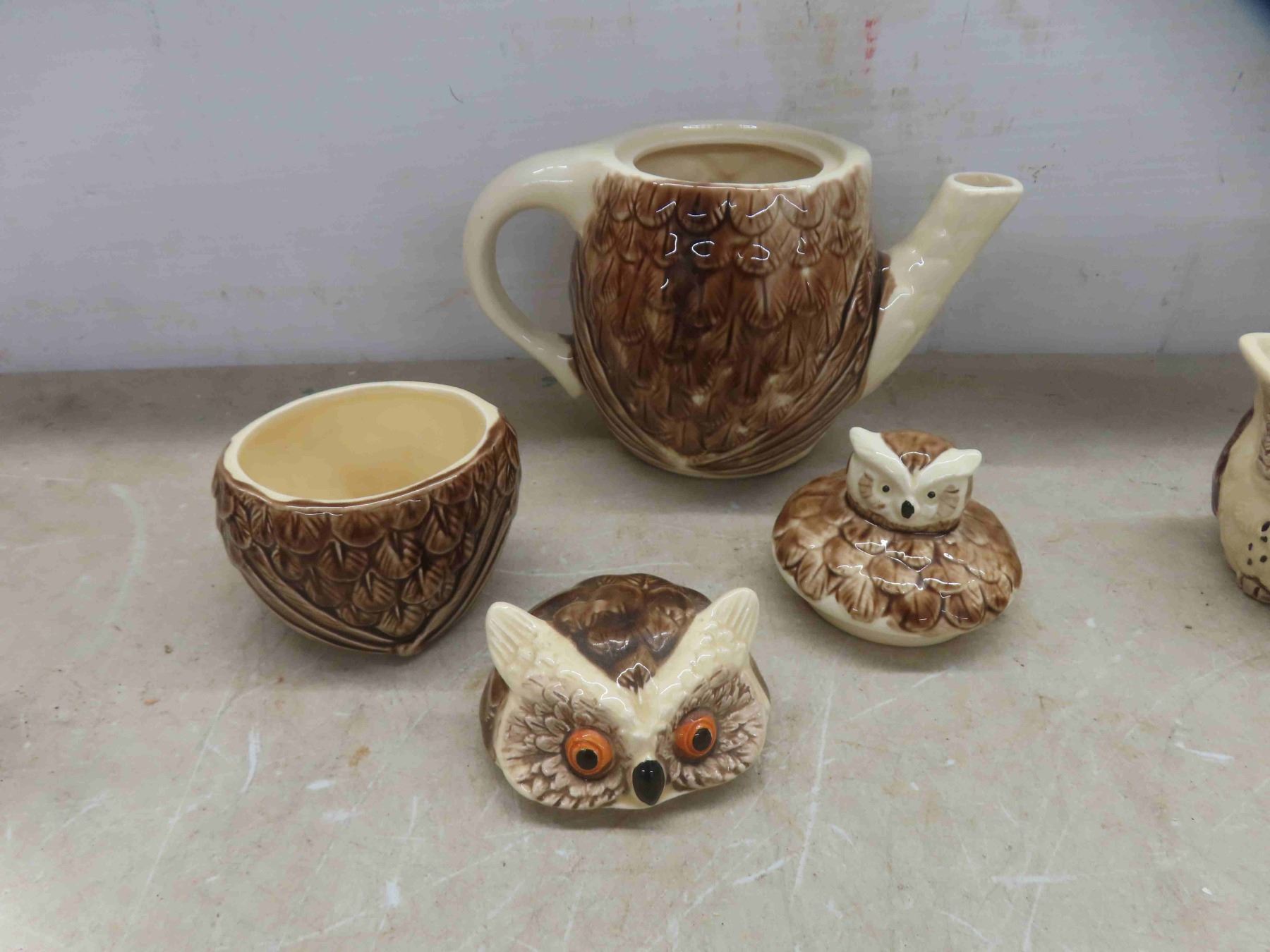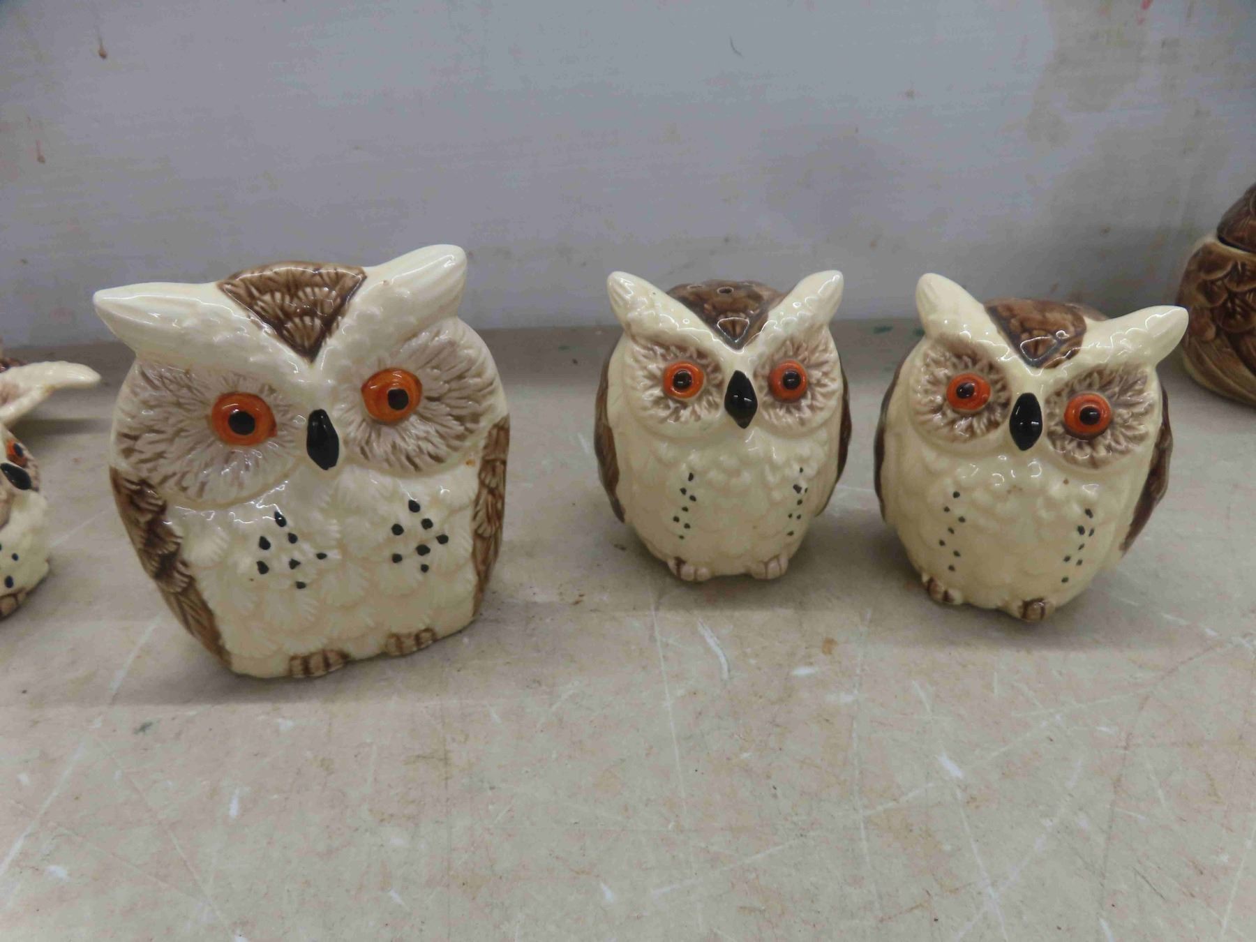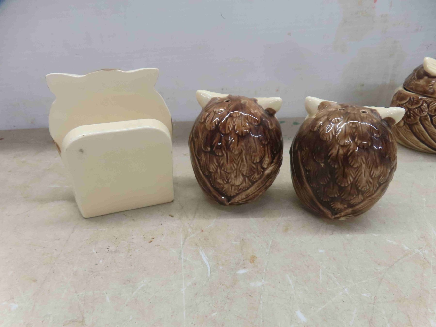 enesco owl, 10pc set. Tea pot , salt and pepper shakkers, creamer, sugar bowl with lid, napkin holder