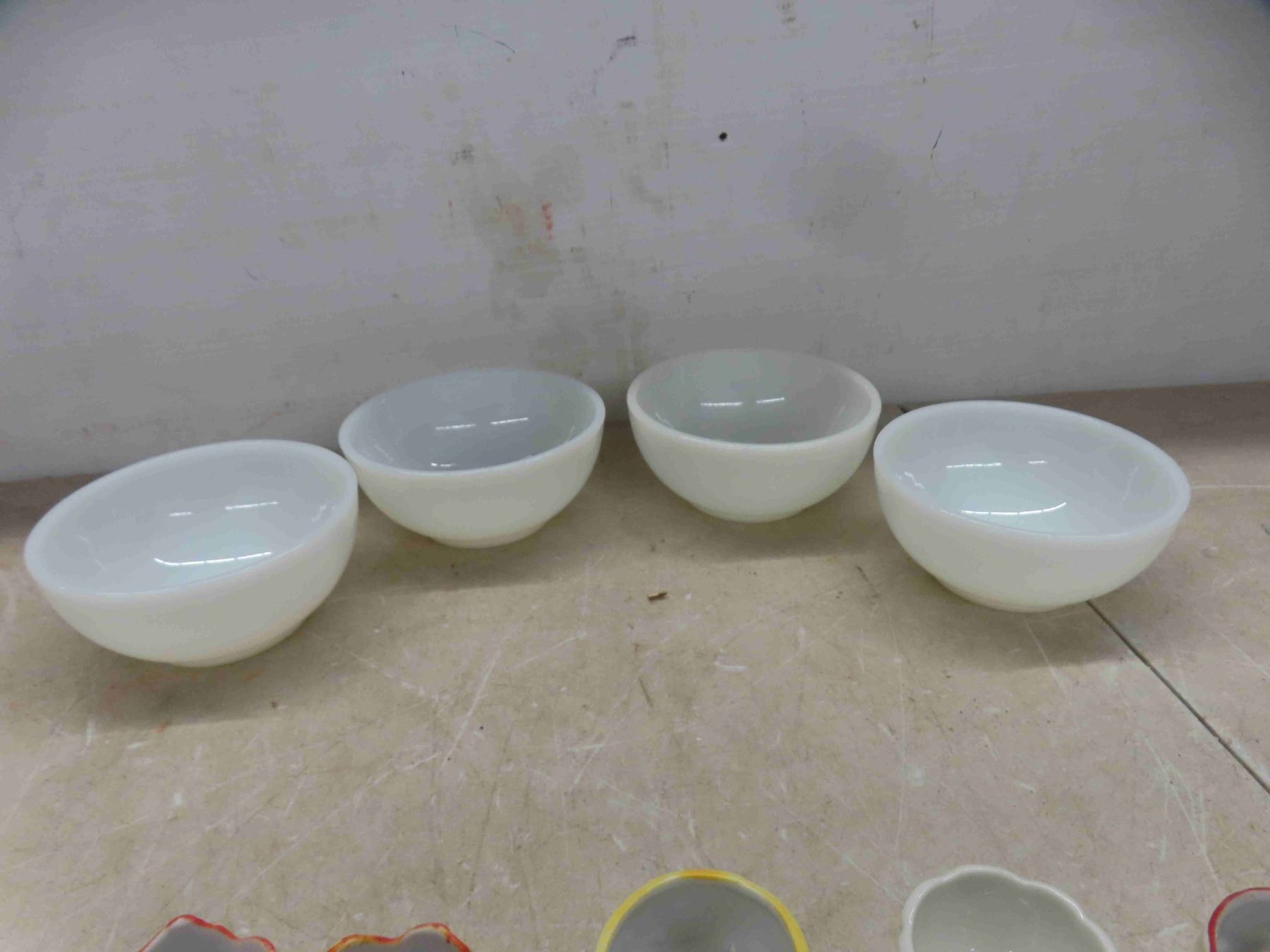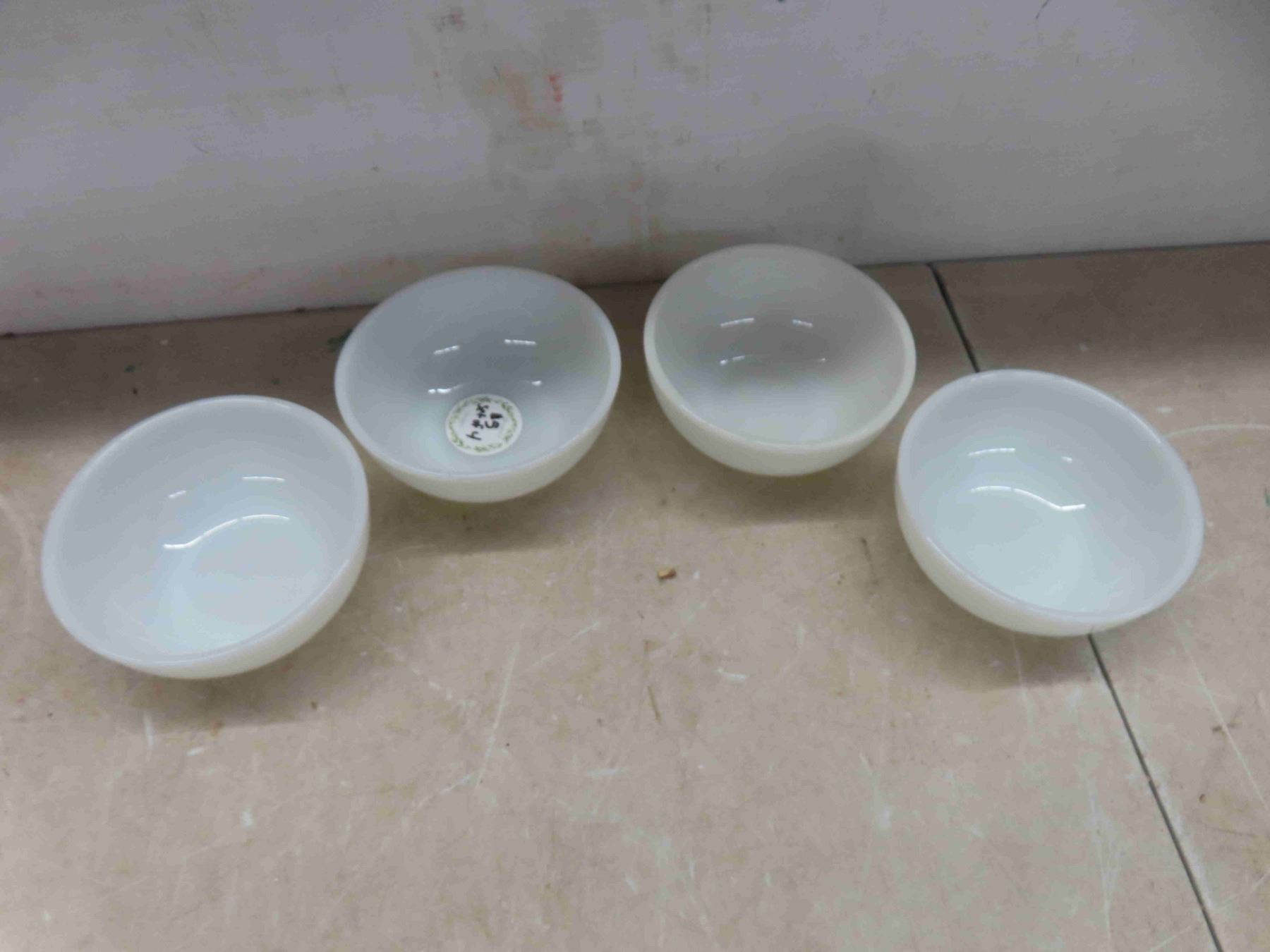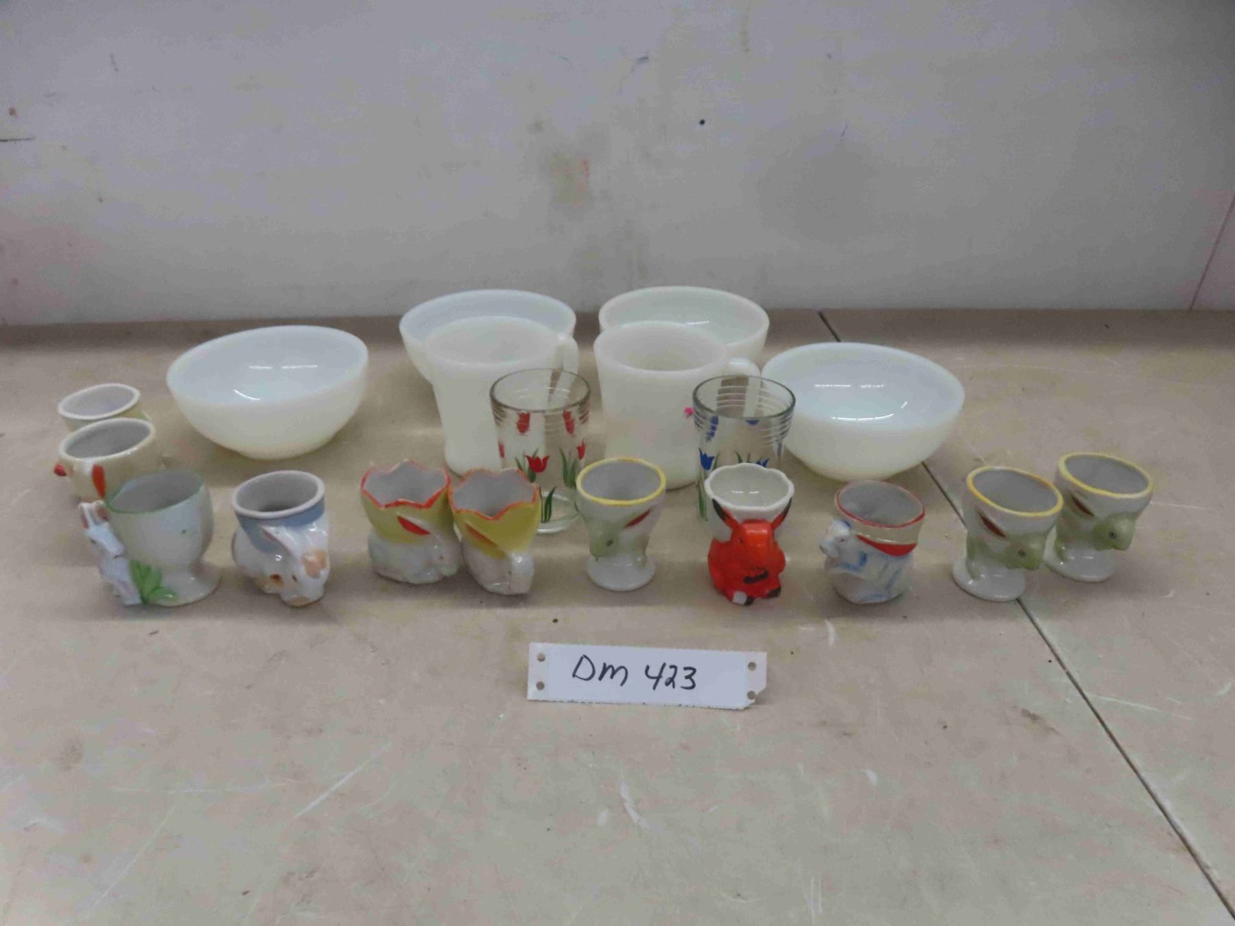 fireking cofee mugs (2), 4 oven proof bowls, egg cups and 2 jjuice glasses