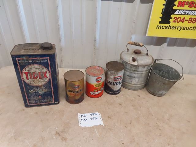 (hd) Galvanized Kerosene Pail, Oil Cans; Texaco, Gulf & 1/2 Tidex Can