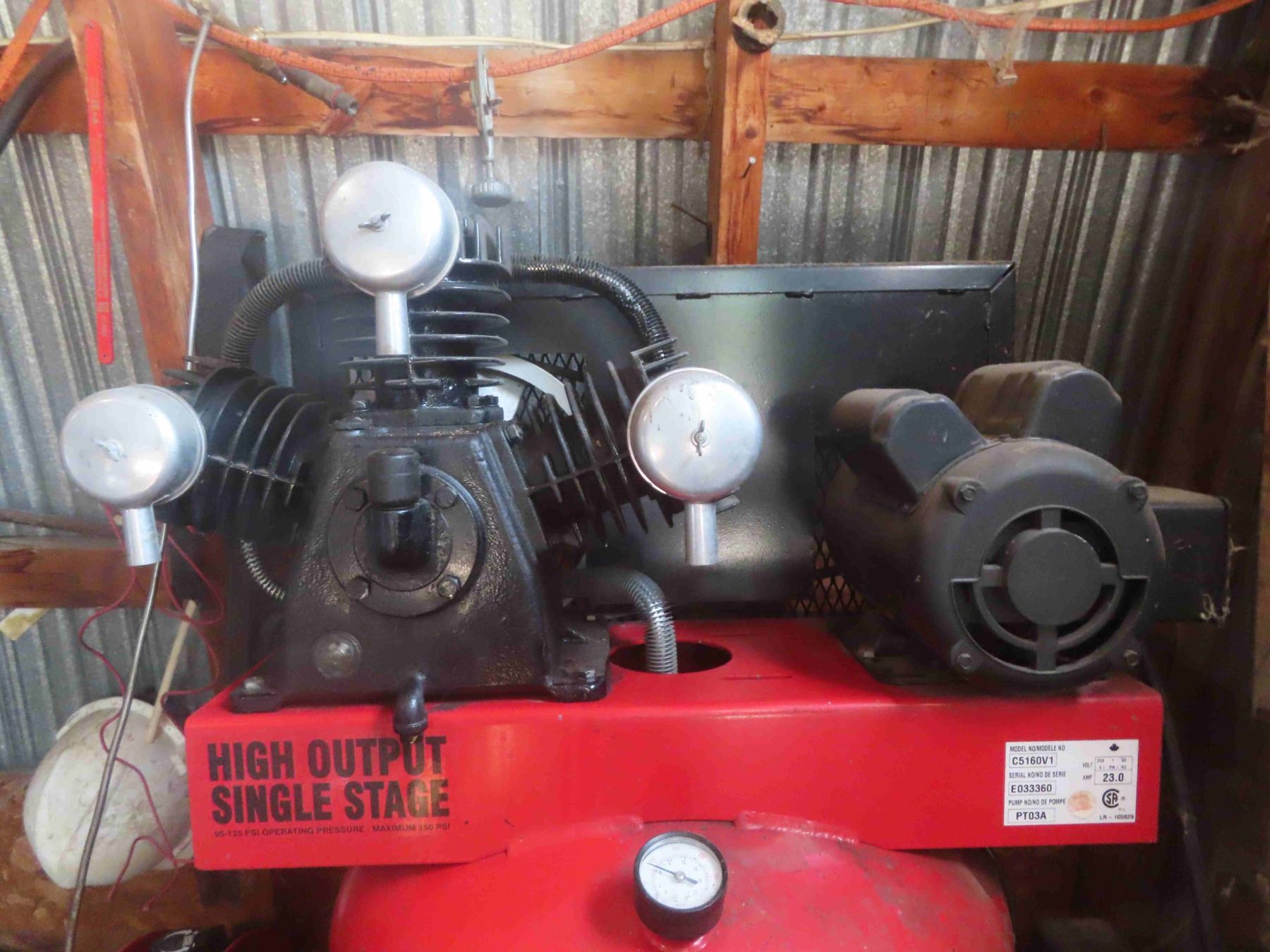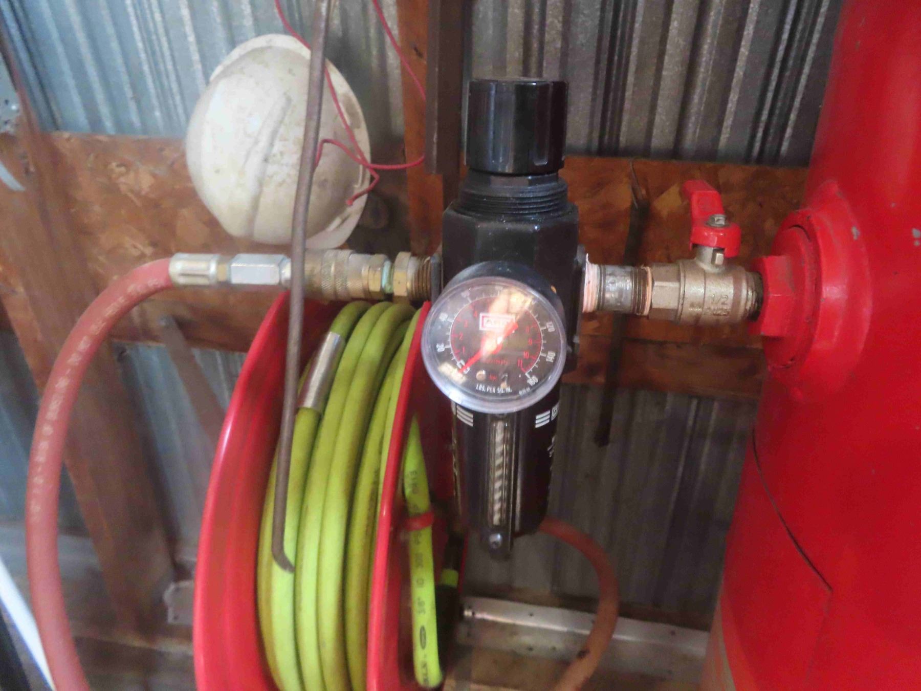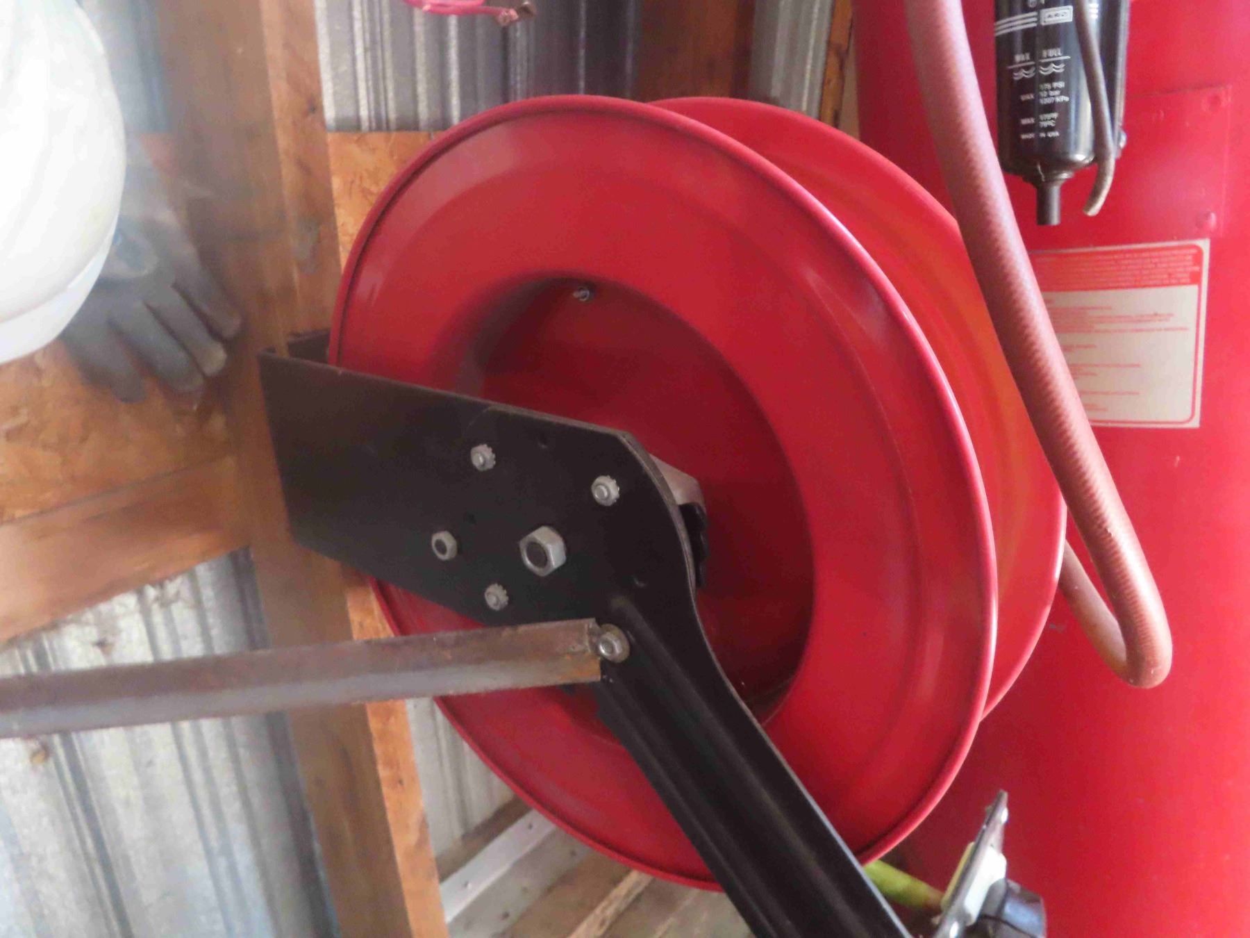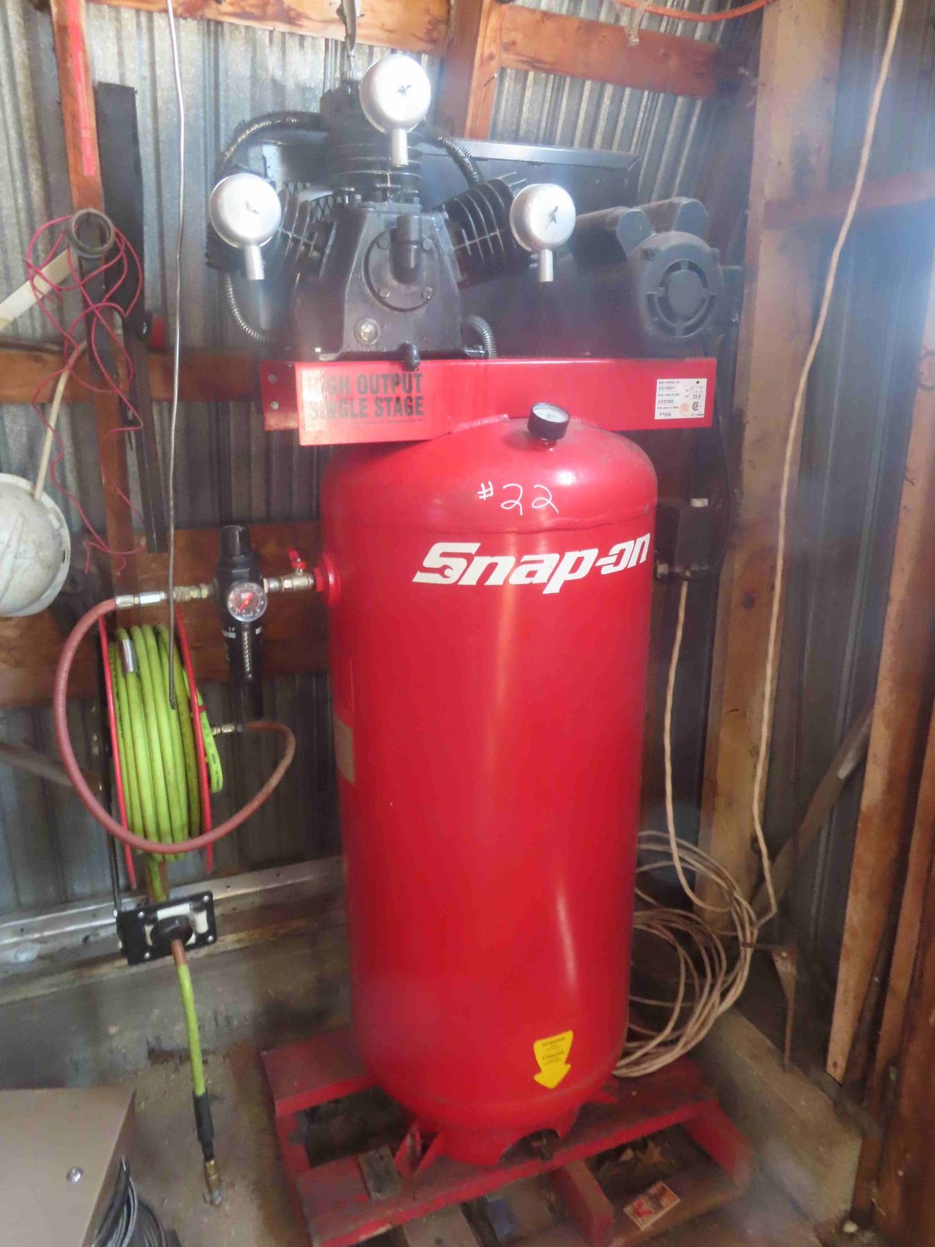 Snap On Upright 60 Gal Air Compressor Triple Cylinder with Retracting Air Hose Reel and Regulator