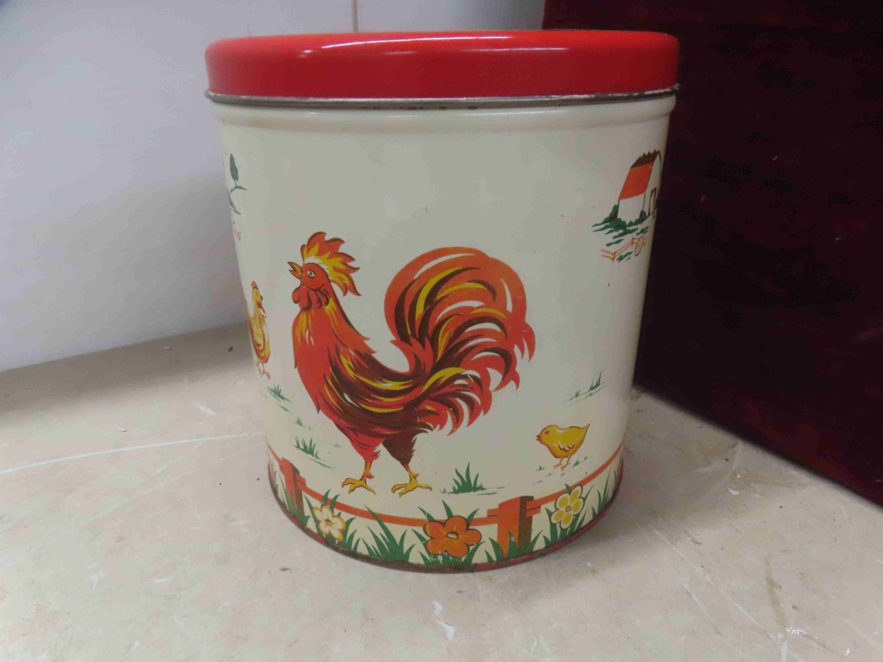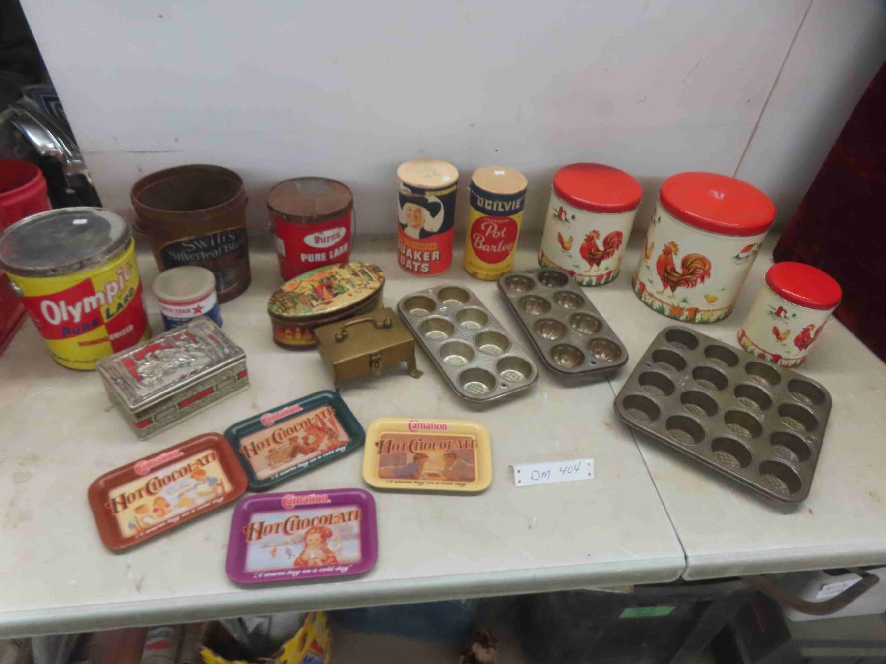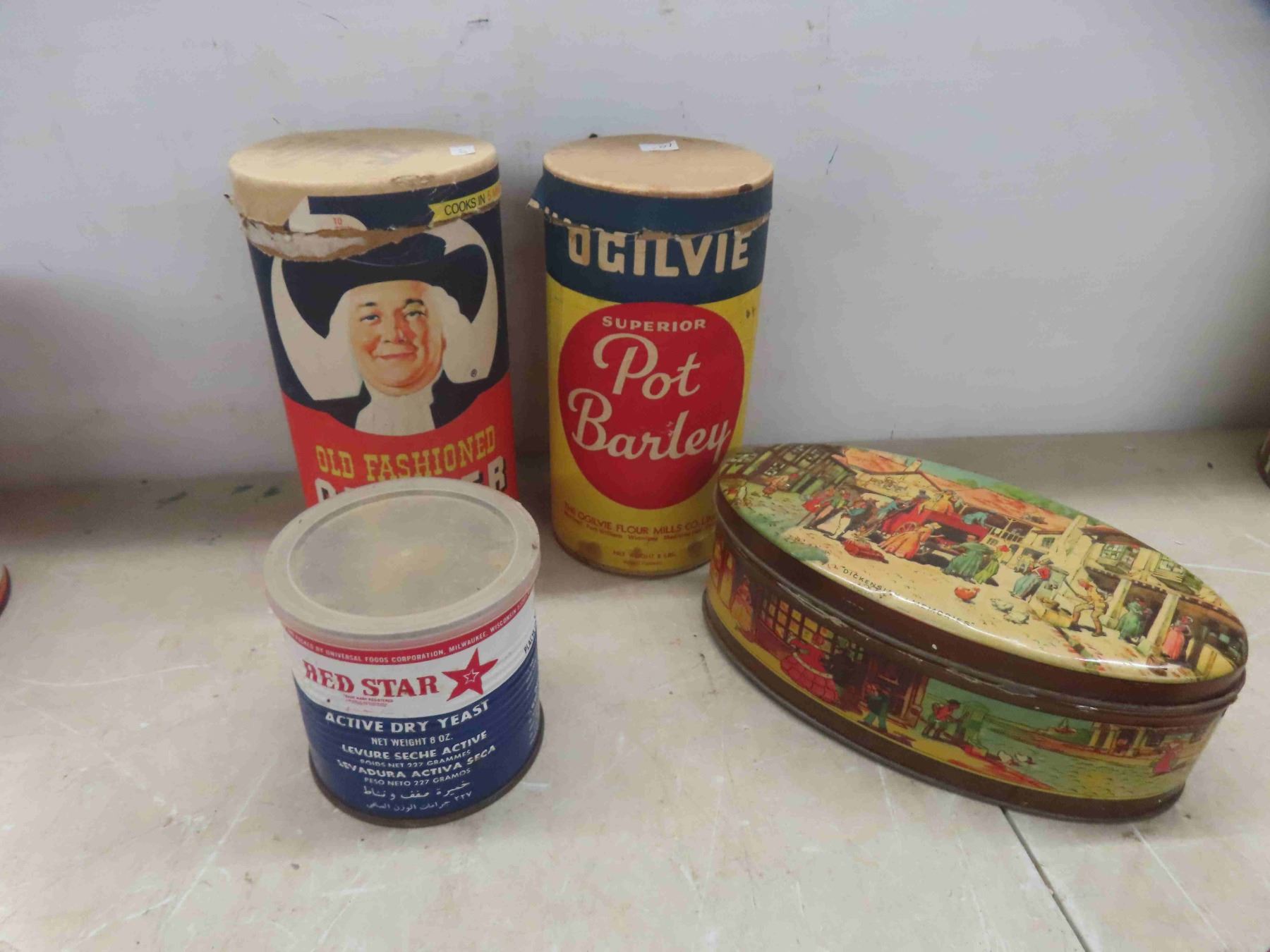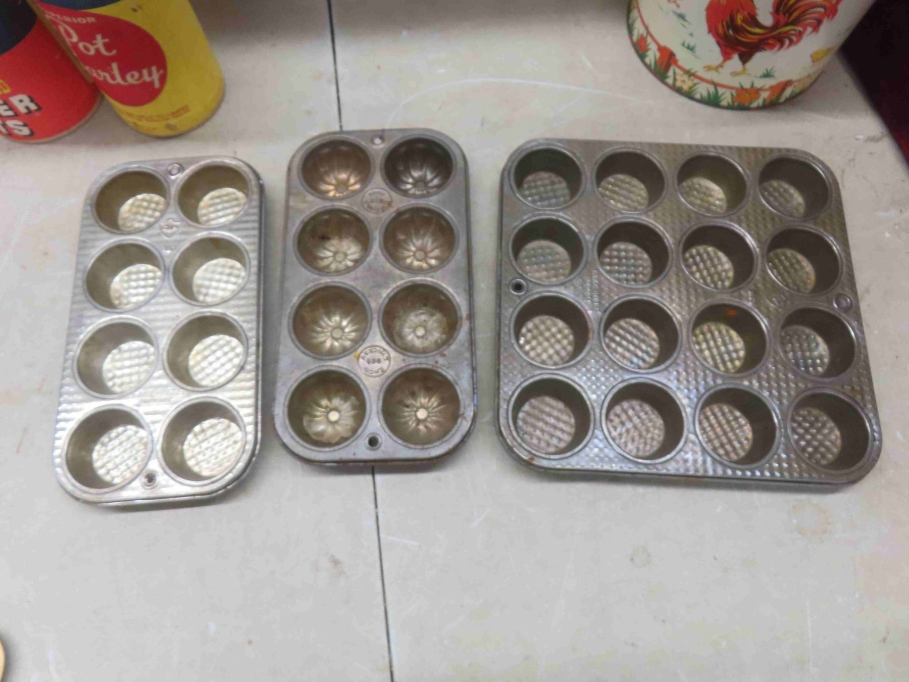 vintage 3 piece metal cannistta set, pantry items, tins, lard, 2 quaker oats, yeast and muffin tins
