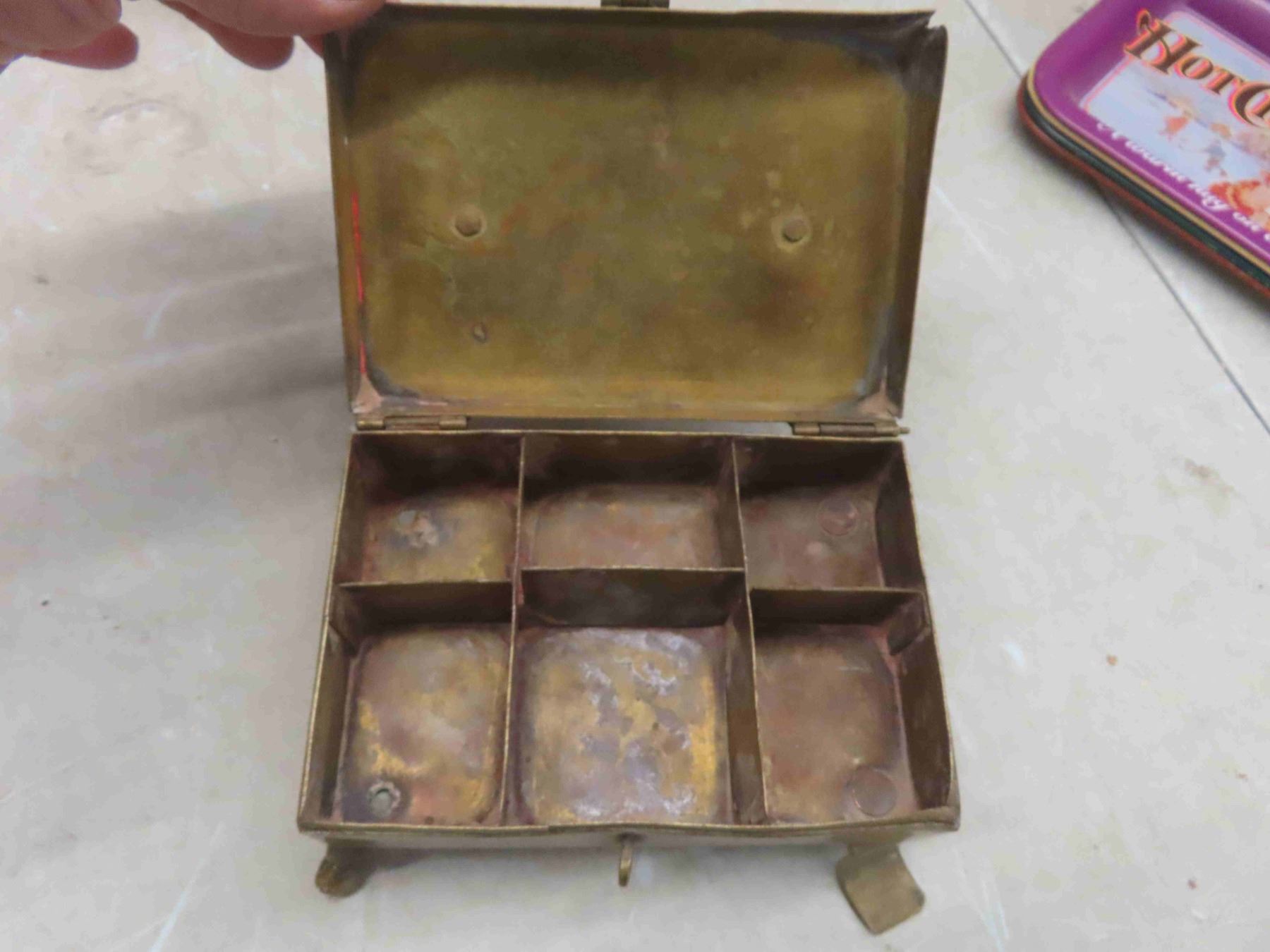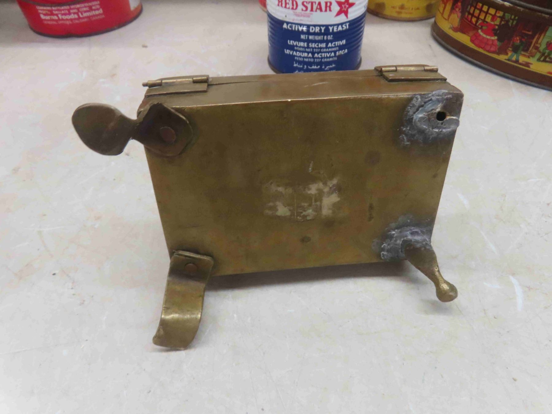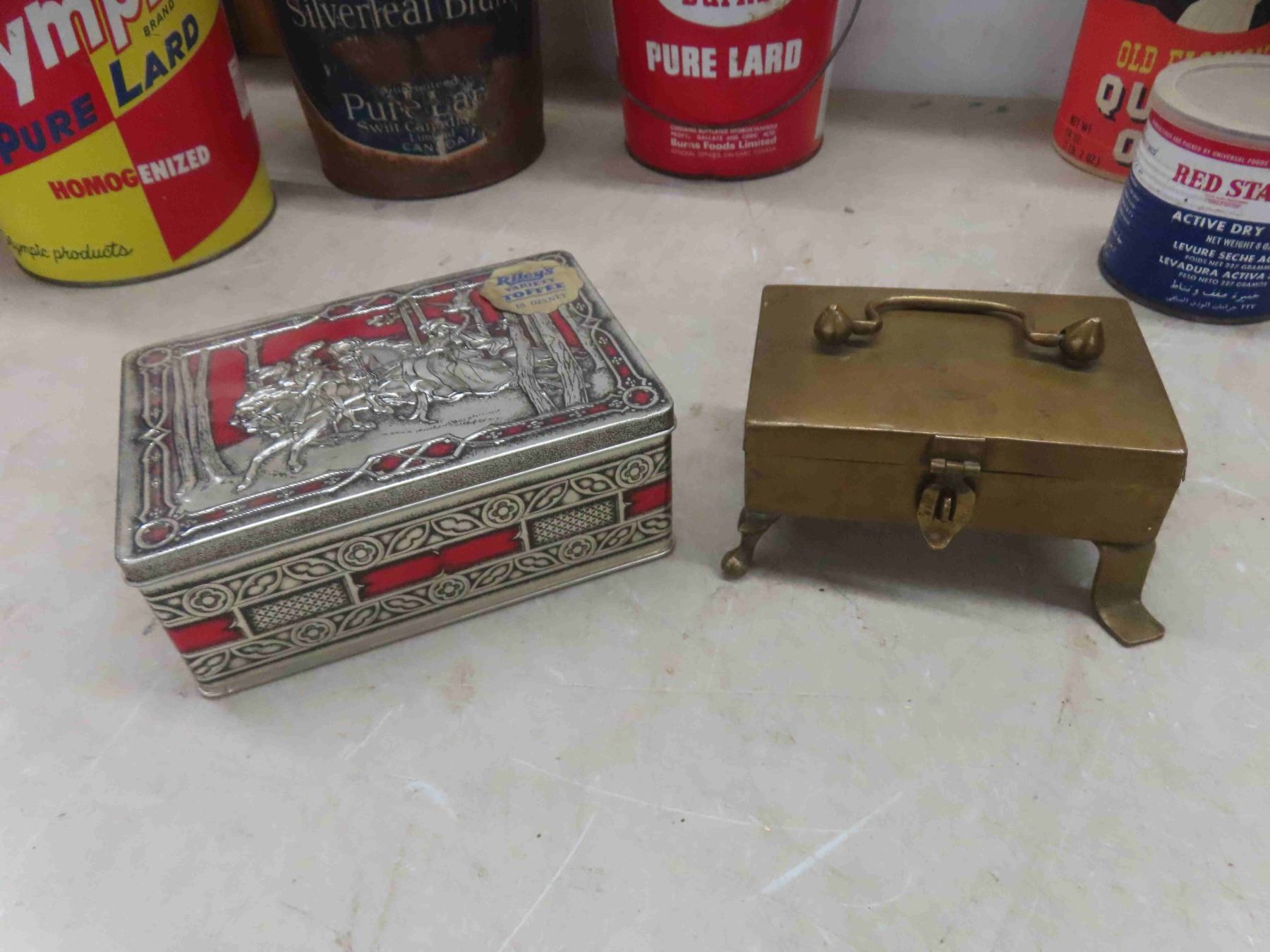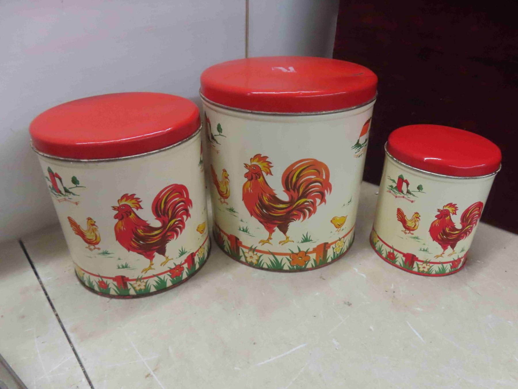 vintage 3 piece metal cannistta set, pantry items, tins, lard, 2 quaker oats, yeast and muffin tins