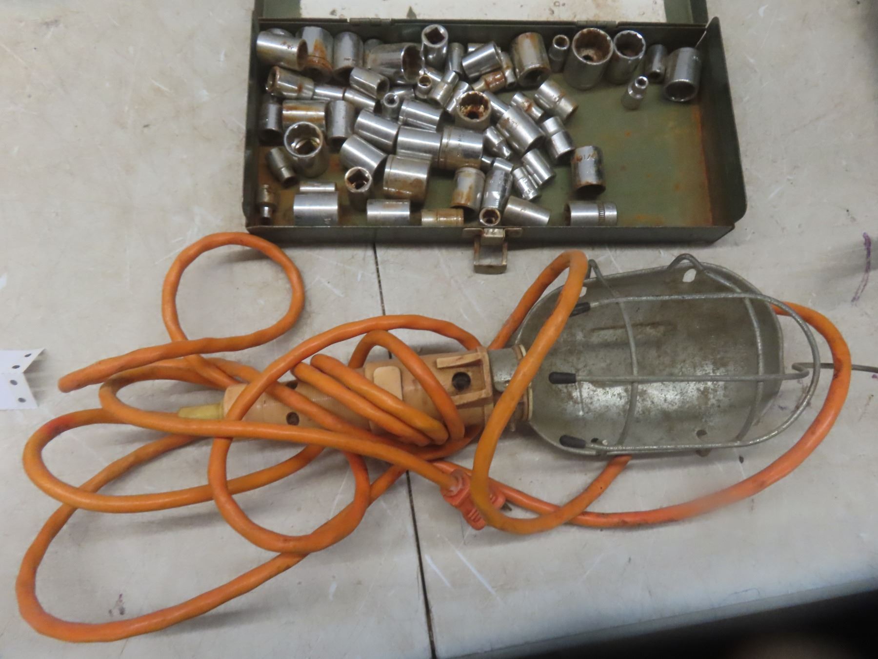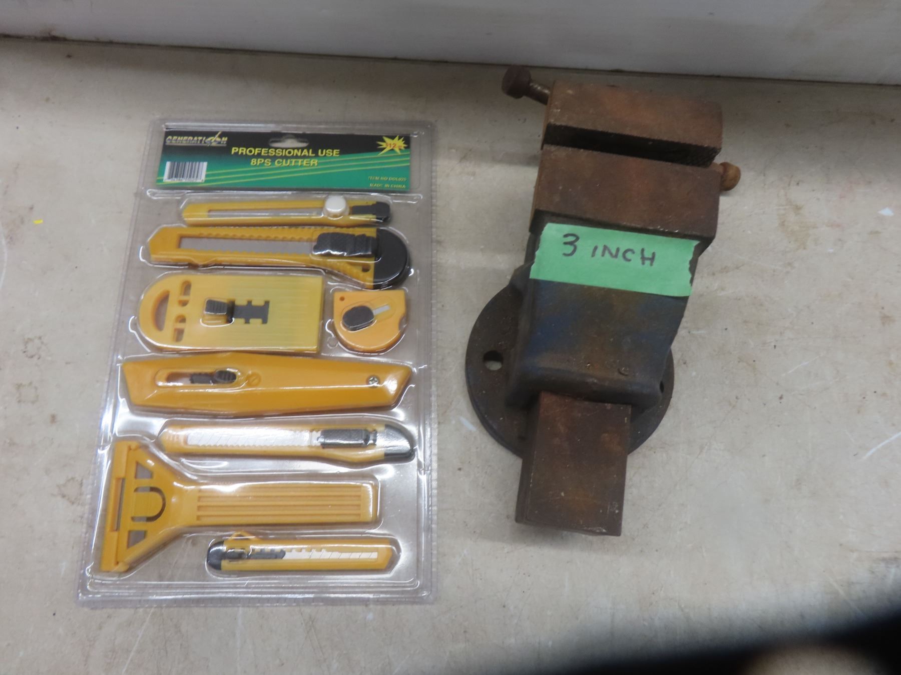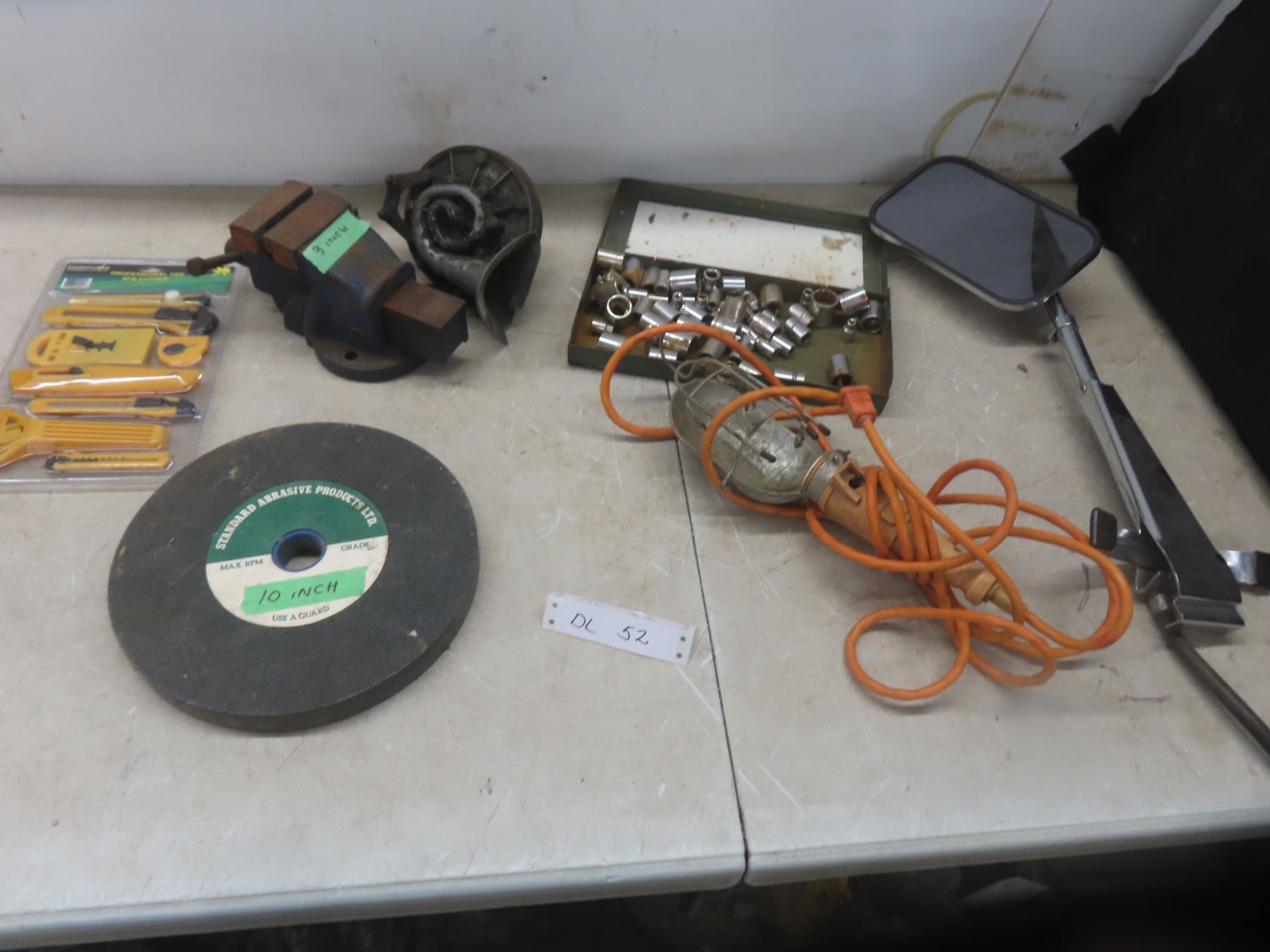 3" Bench Vise, Utility Knives, Sockets, Trouble Light +