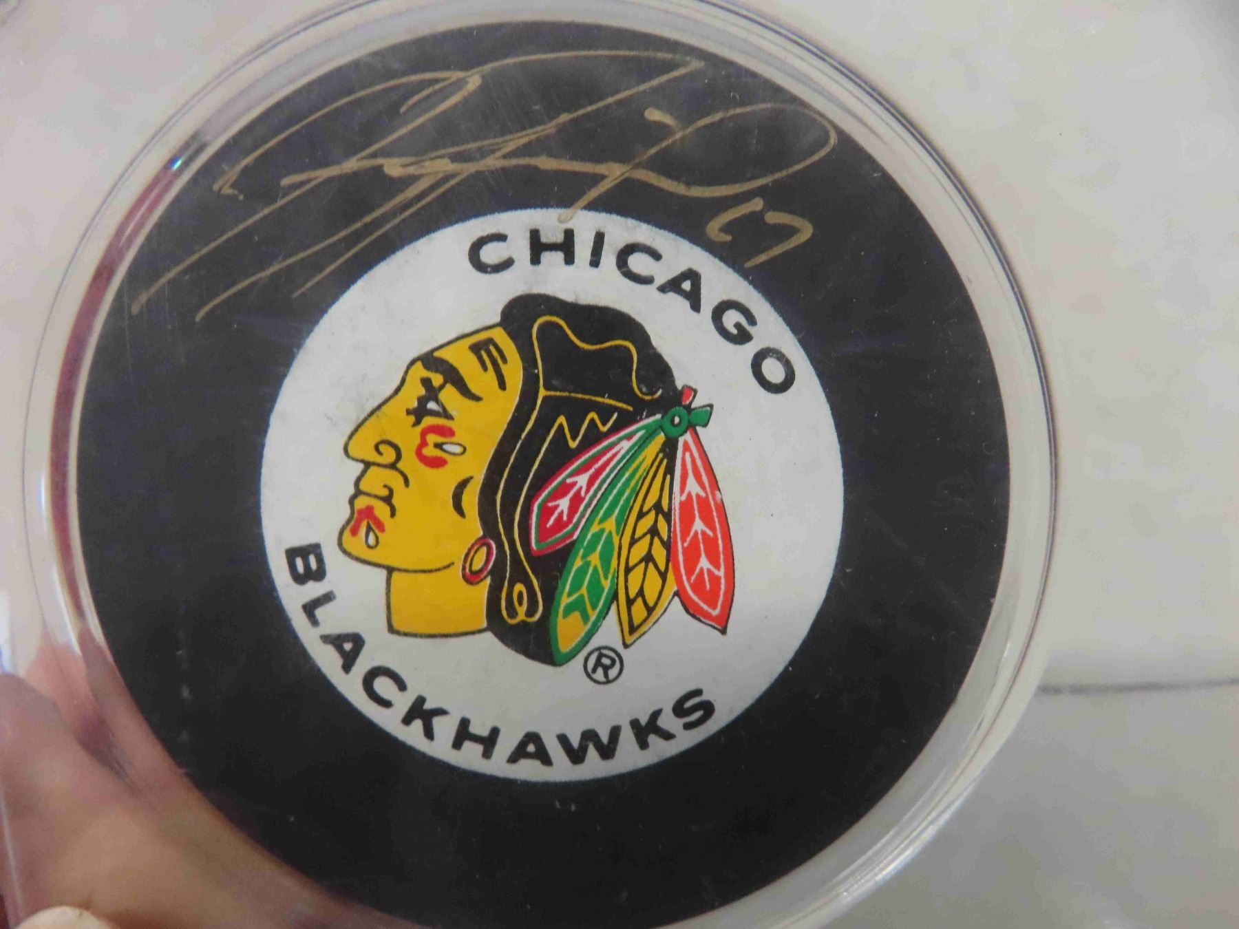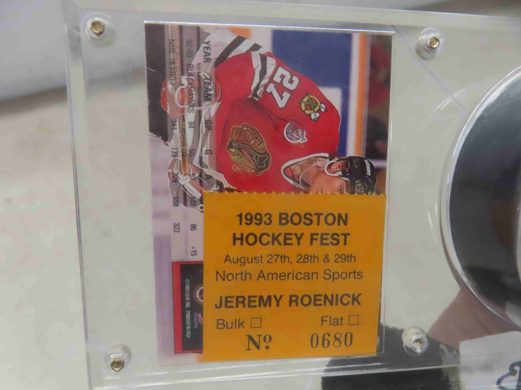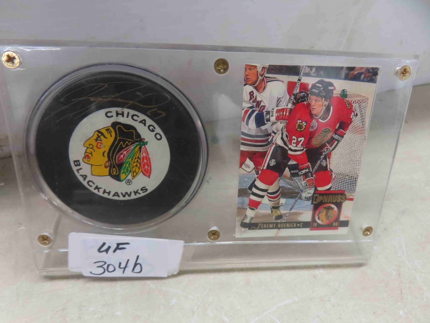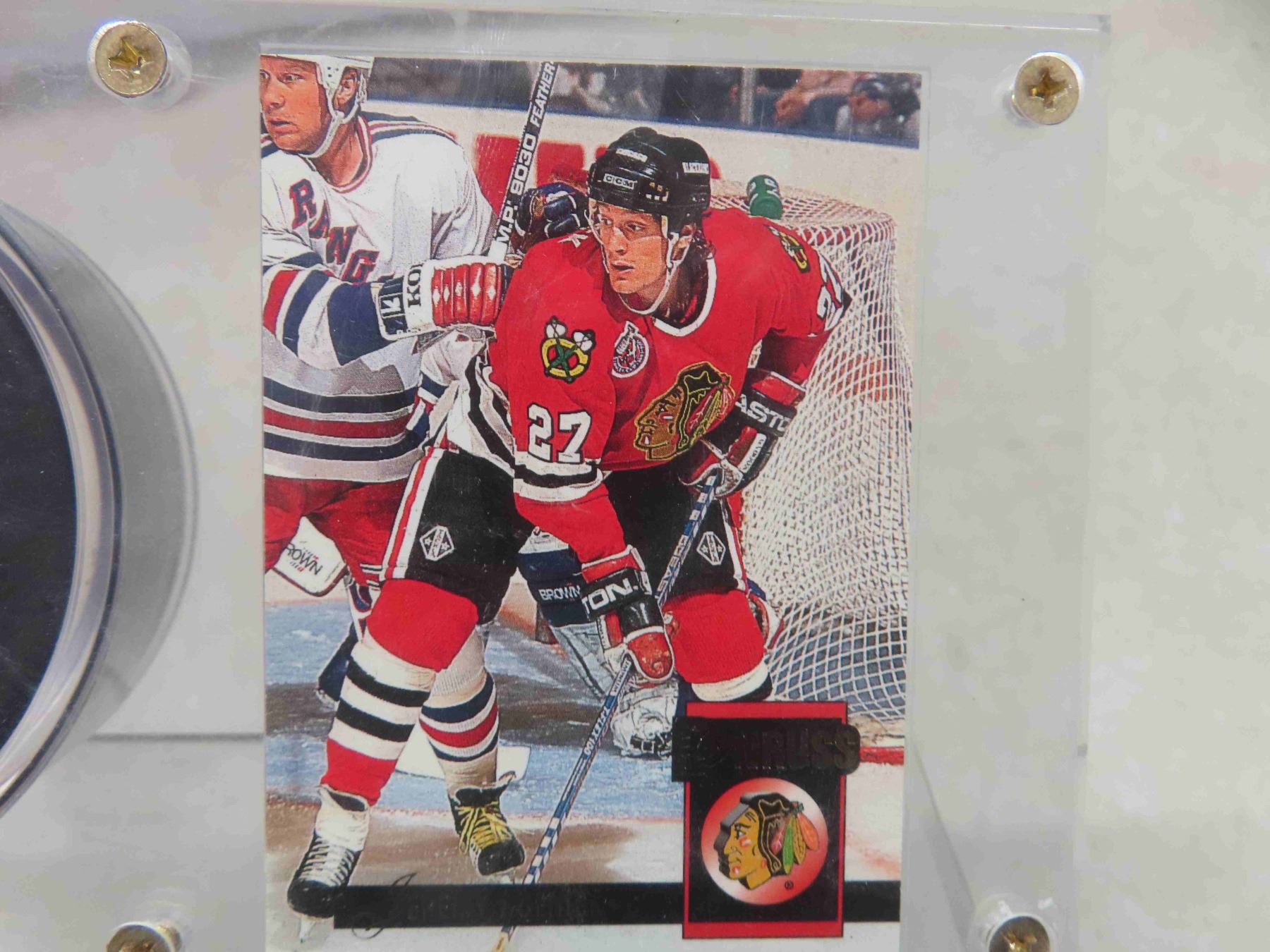 jeremy roenick chicago black hawks autographed puck and donruss hockey card
